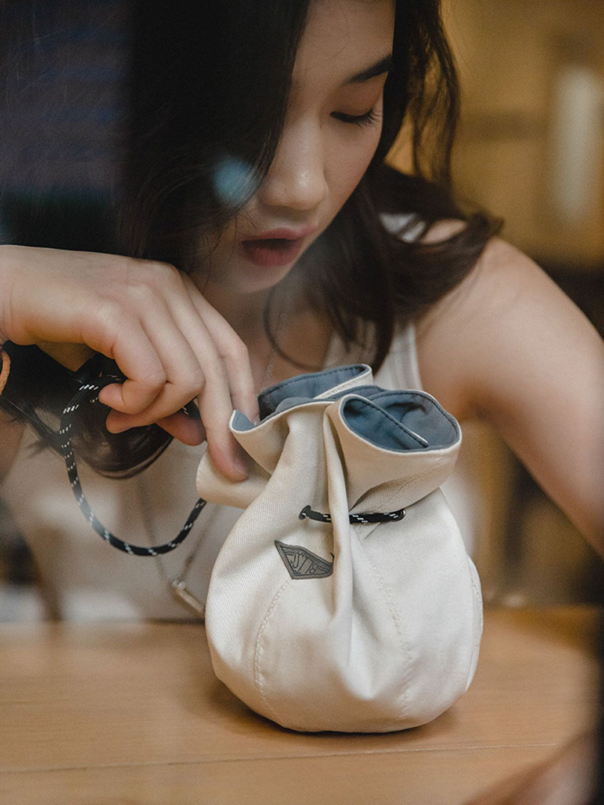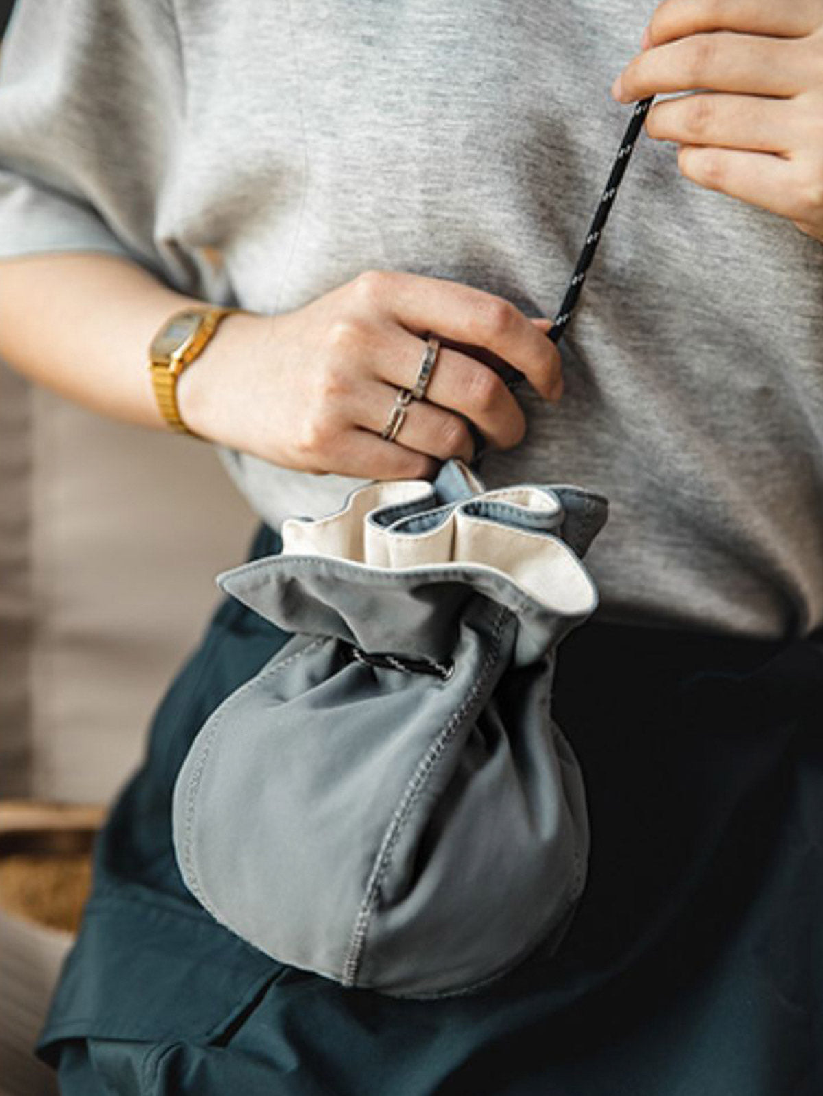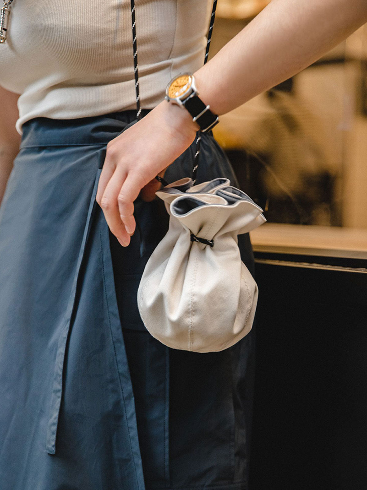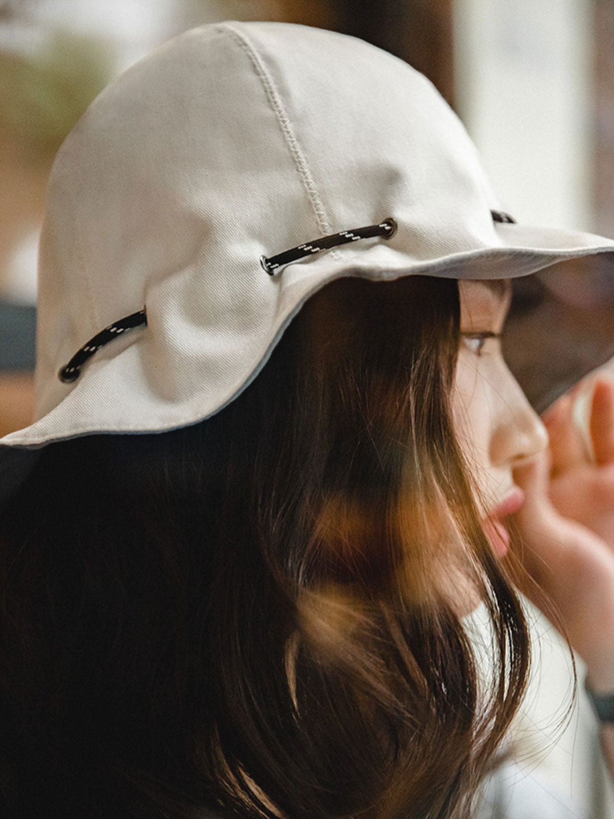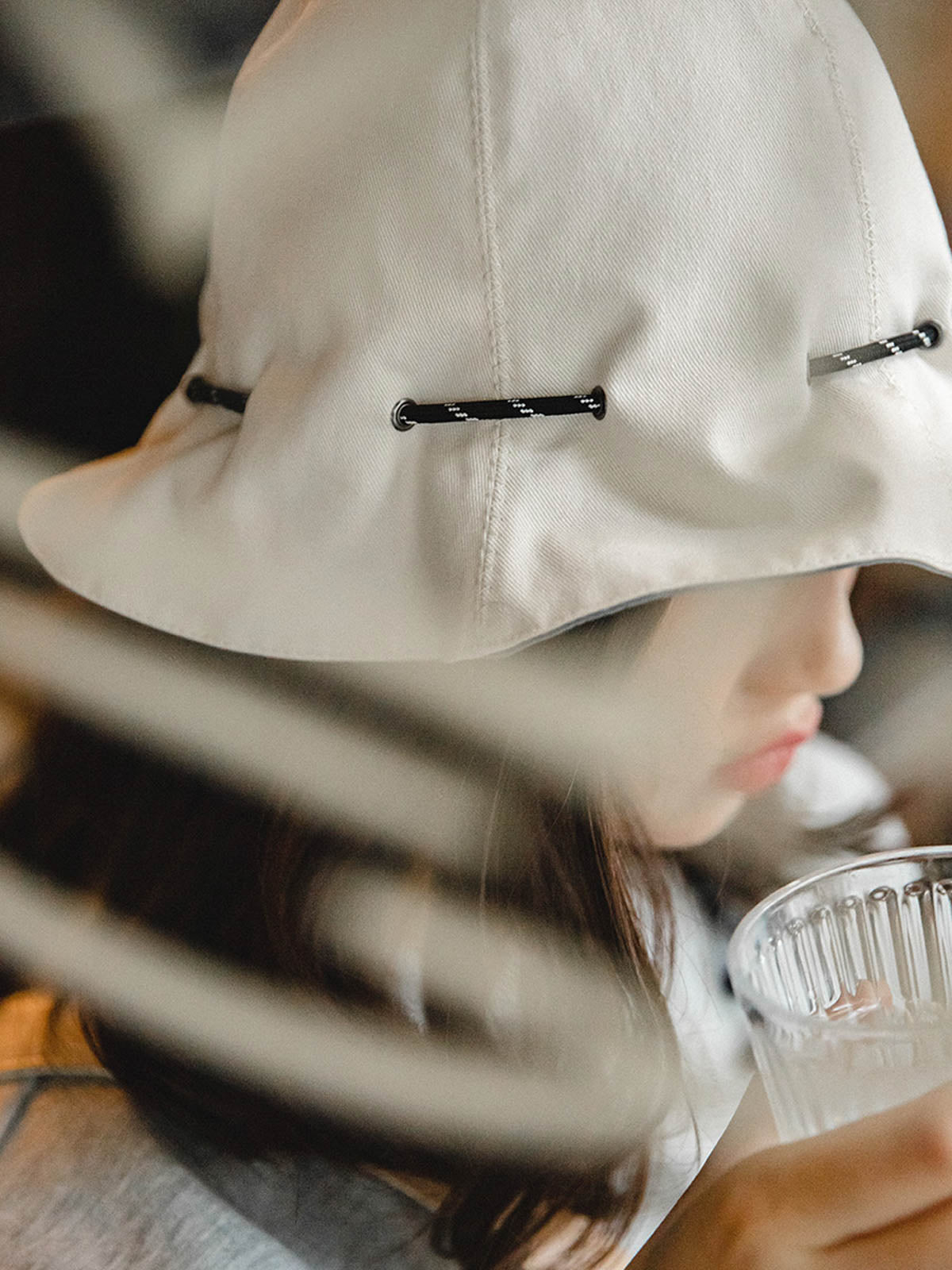 このバケットハットは、両面使えるデザインが特徴です。一面は吸湿性と耐摩耗性に優れたアイボリーのサージ生地で、秋冬の使用に最適です。もう一面は冷感接触のブルーグレーのアイスピーチ生地で、春夏にぴったりです。帽子は、ドローコードを使って簡単に手提げや斜めがけの小銭入れに変えることができます。日除けや防寒機能に加えて、ファッション性と実用性を兼ね備えています。どんなコーディネートにも合うアイテムです。