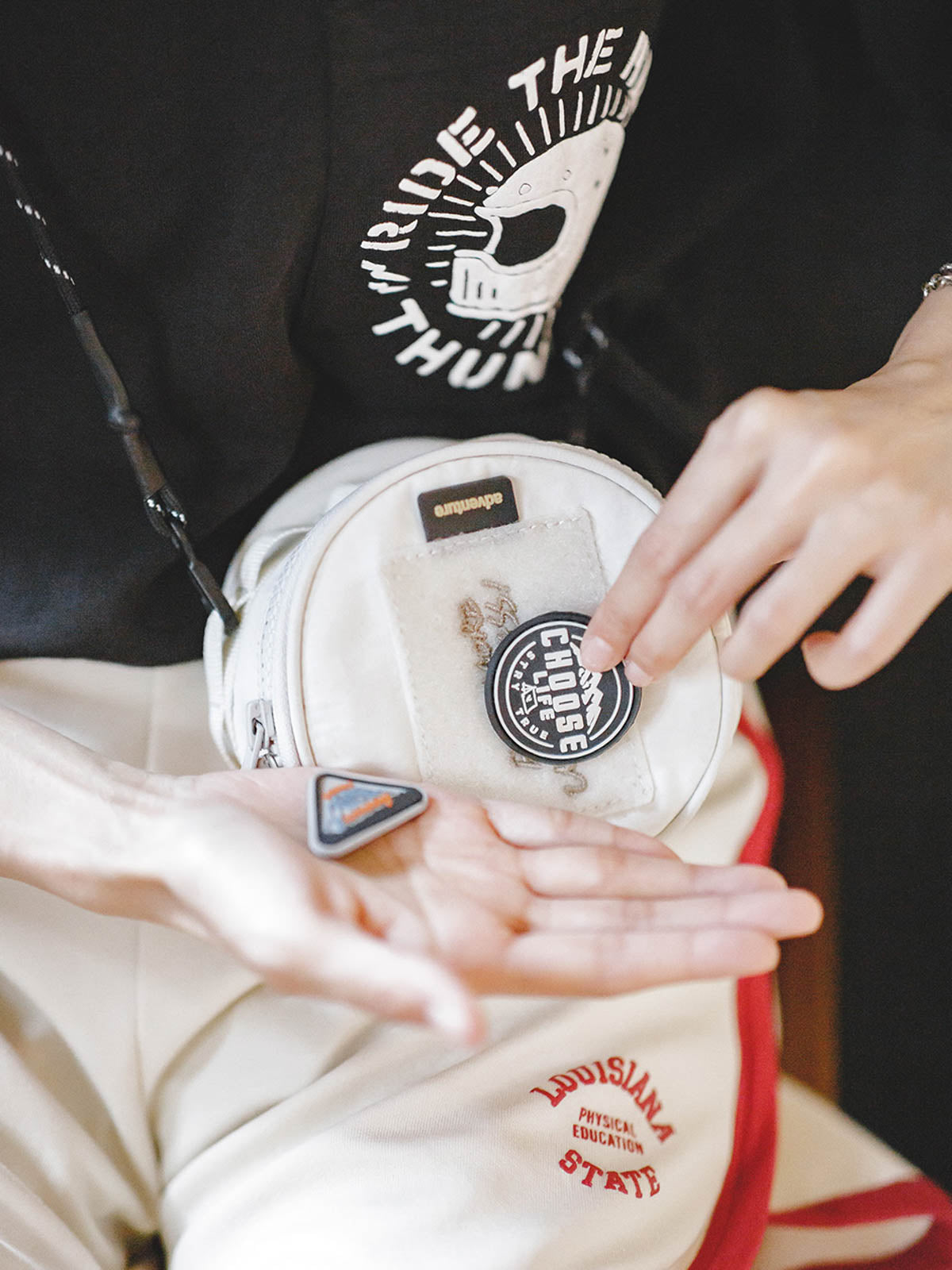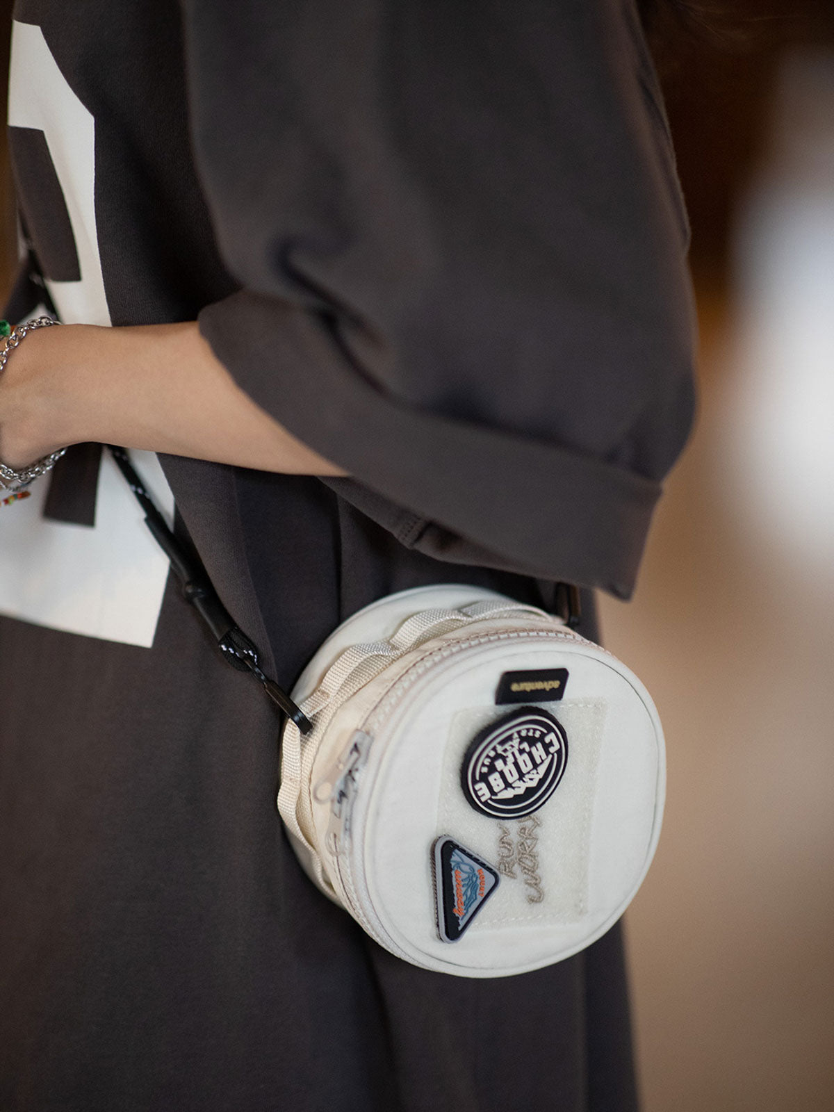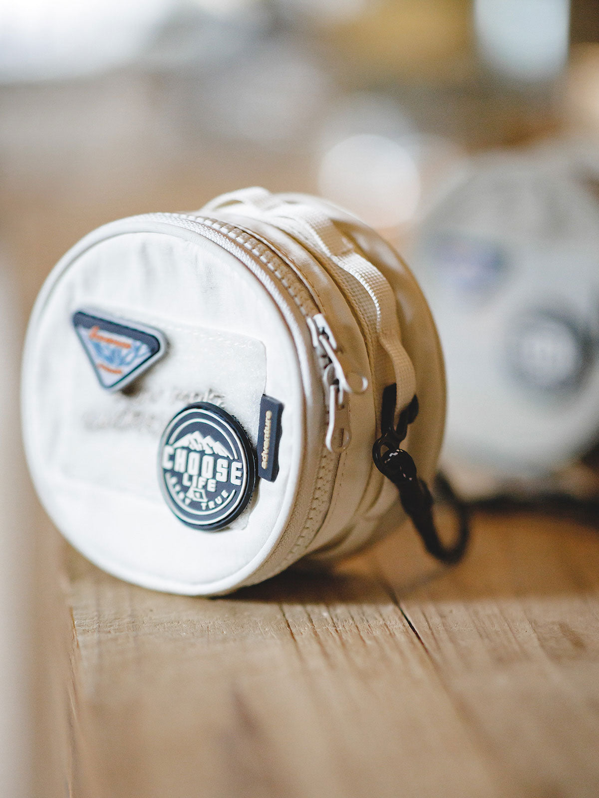 この小型ラウンドバッグは、ユニークなデザインで一つで多用途に使用できます。クロスボディ、ウエストバッグ、または拡張バッグとして使用可能。内側にはボタン固定ストラップが付いており、キャンプ、サイクリング、マウンテニアリングなどの際に便利です。ベルクロデザインにより、バッジを自由に交換して、自分だけの個性的なバッグを作成できます。コンパクトなサイズながら、容量は十分で、内部にはメッシュポケットとエラスティックループがあり、小物を整然と収納できます。軽量アウトドア用ナイロン素材を使用し、耐擦傷性に優れ、破損しにくいです。ストラップの位置は自由に調整可能です。