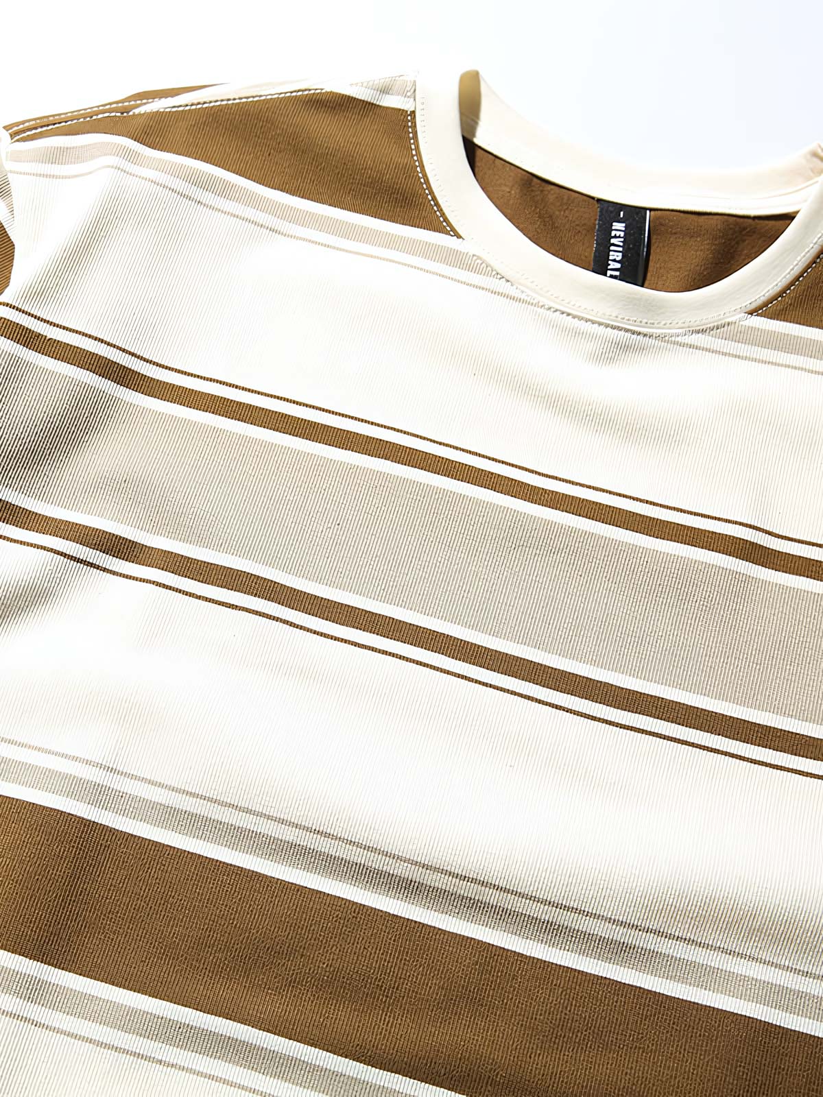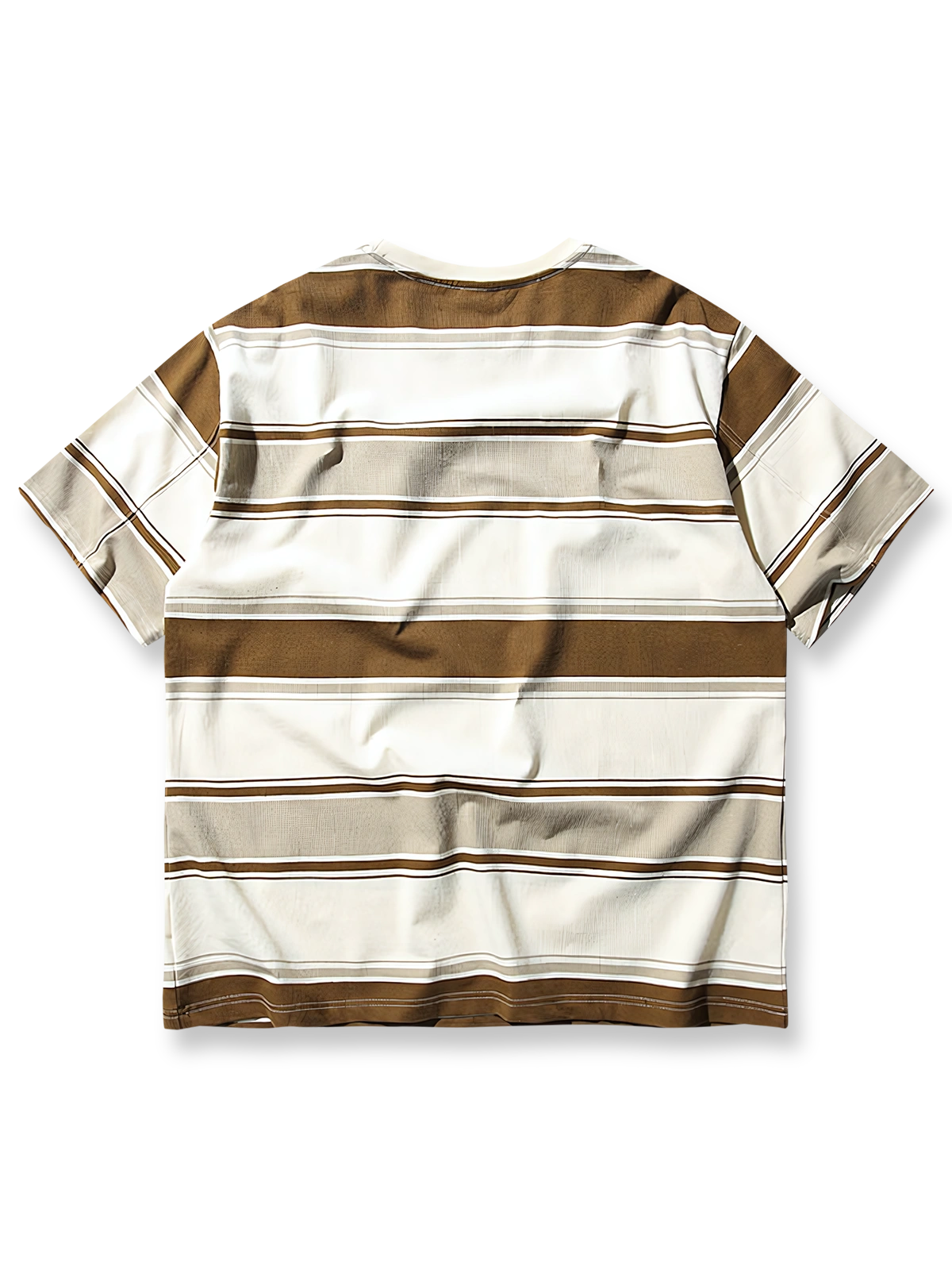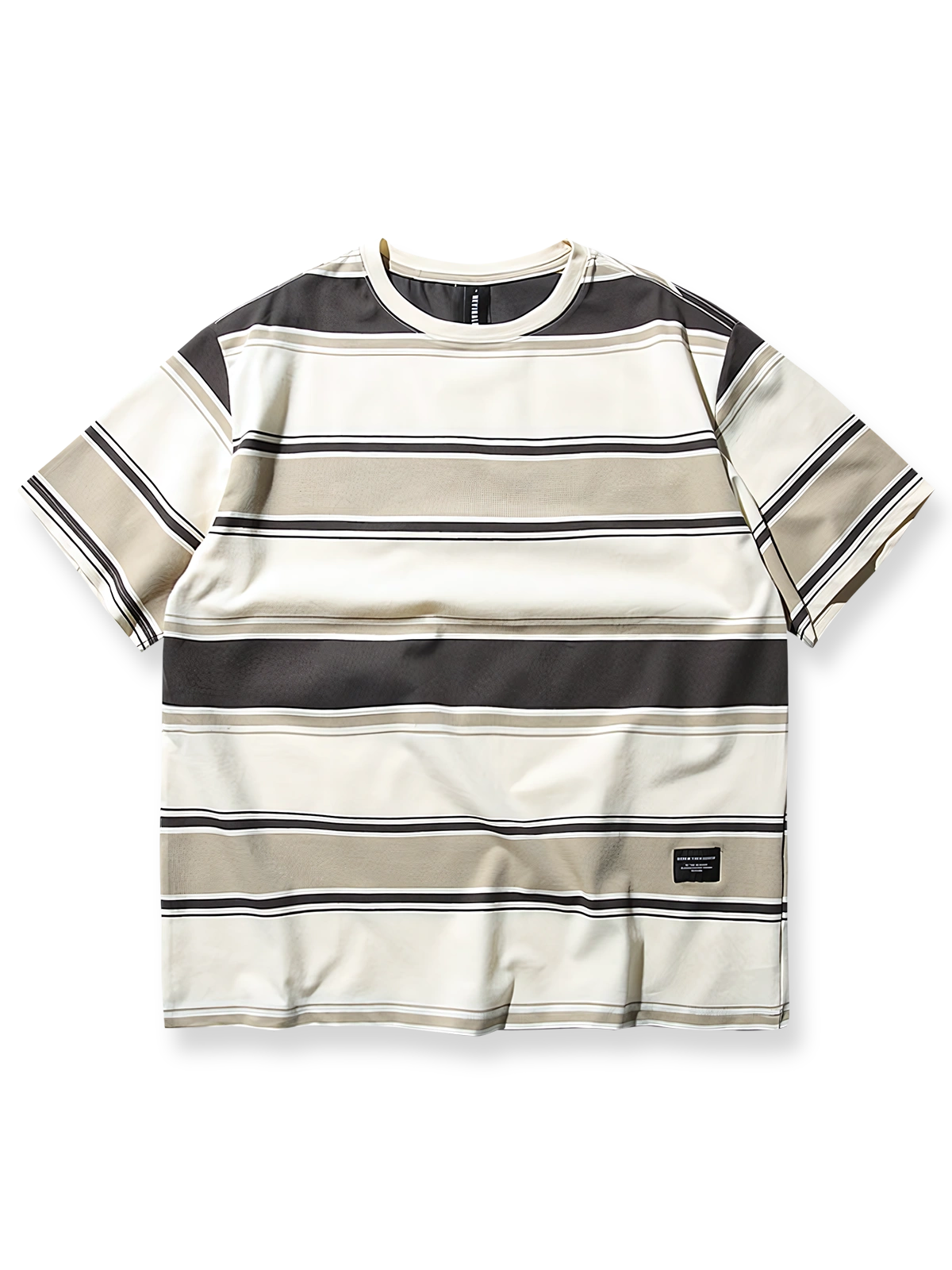 ゆったりシルエットのストライプ切り替え半袖Tシャツ、快適で様々なスタイルにマッチ。