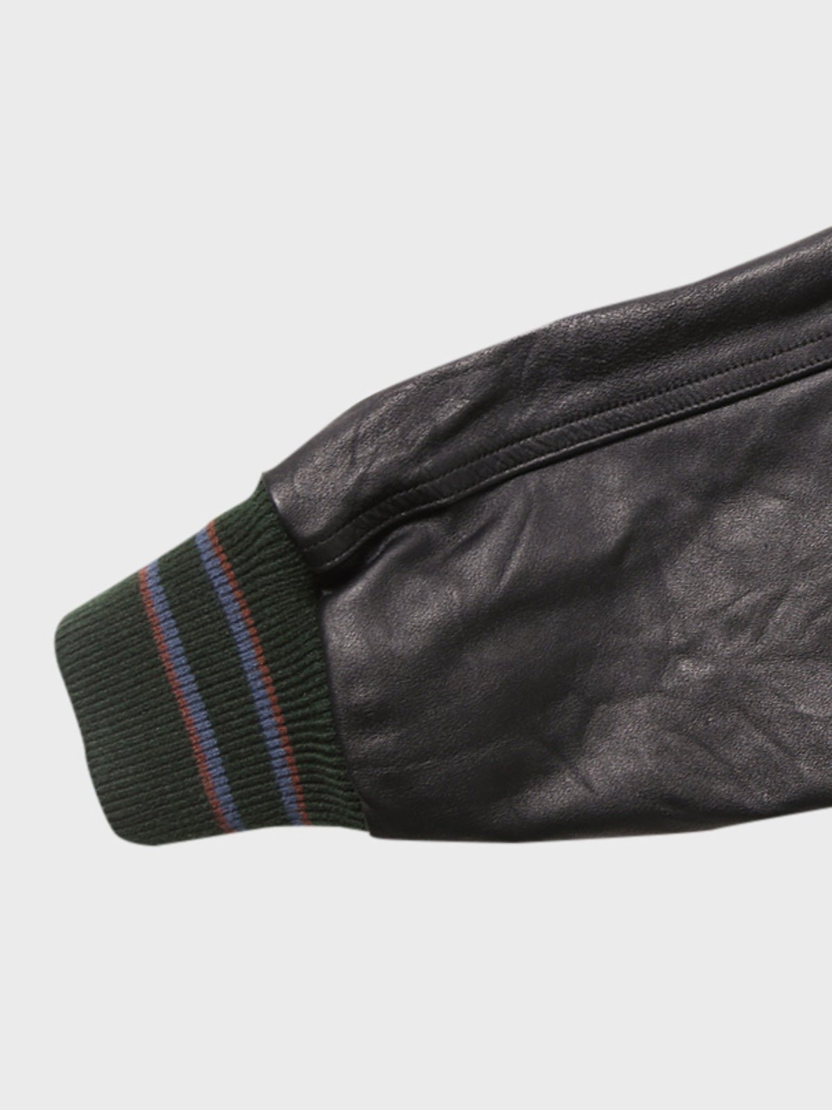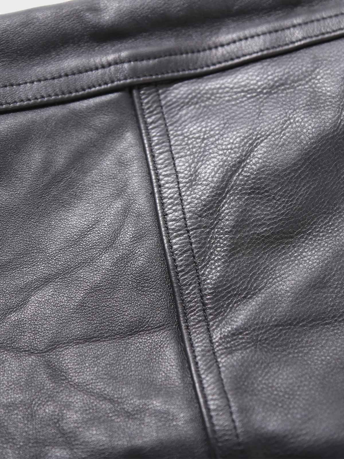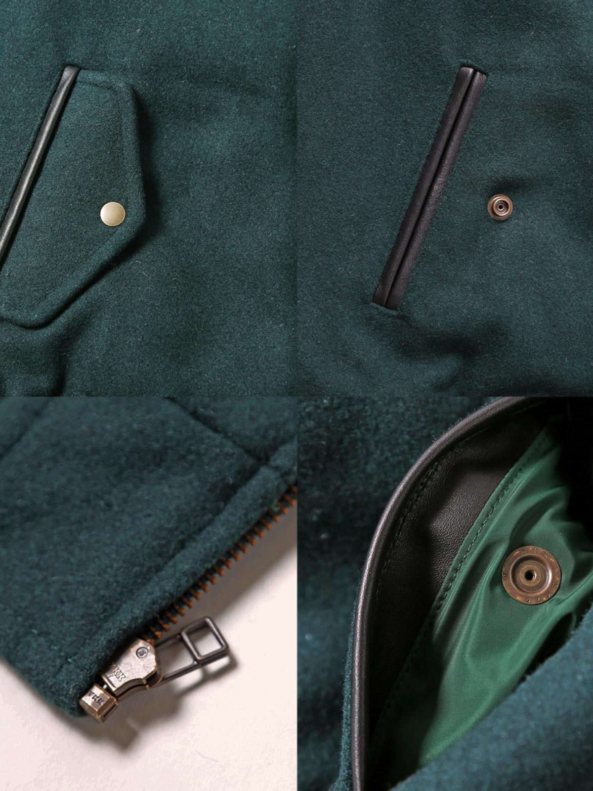 ジャケットの本体はウール素材を使用し、保温性と通気性を兼ね備えています。ウール素材は保温性を提供し、本革の袖は耐久性と豪華感を加えます。袖部分の本革は耐摩耗性に優れ、上質な質感を持っています。