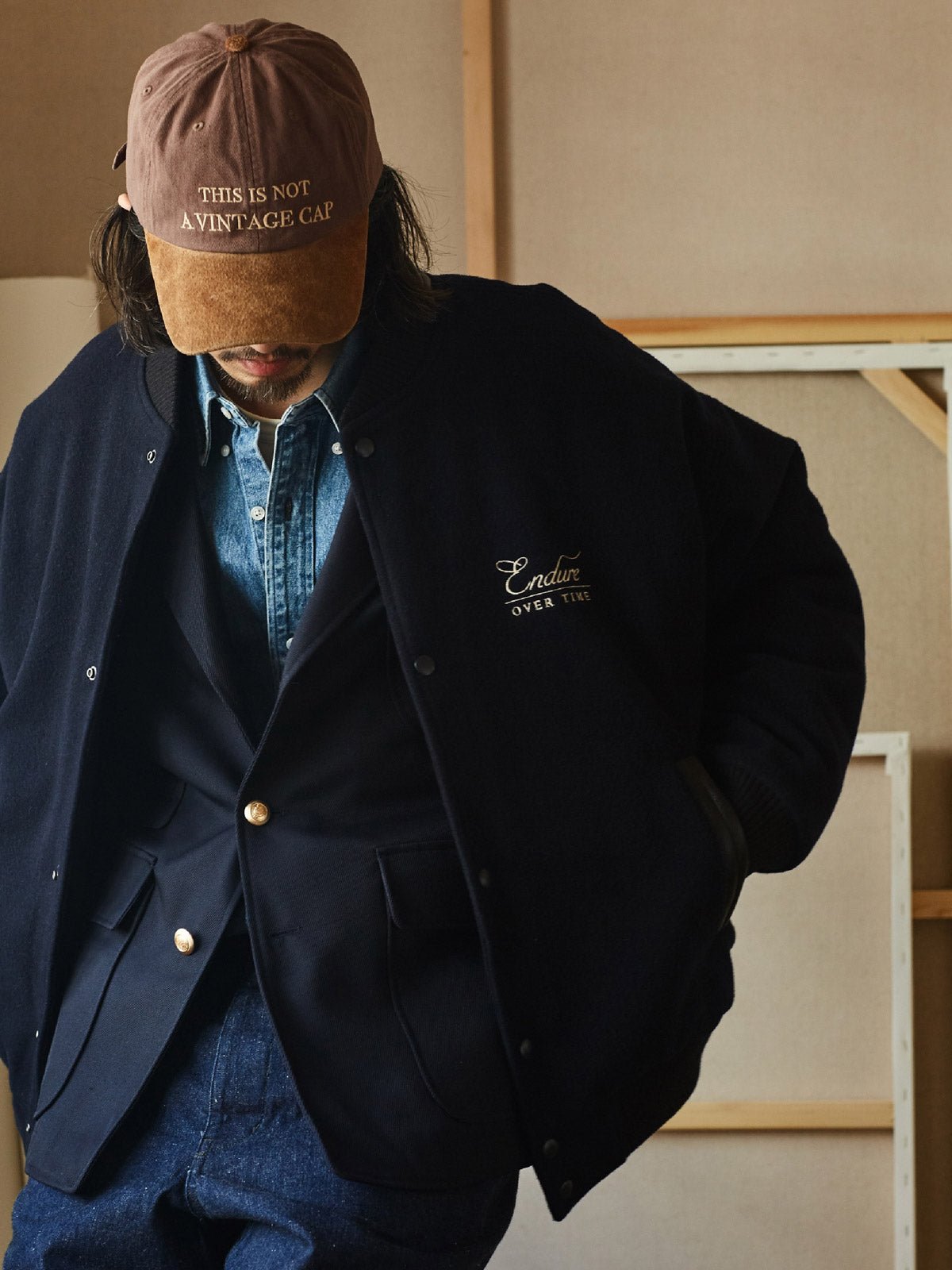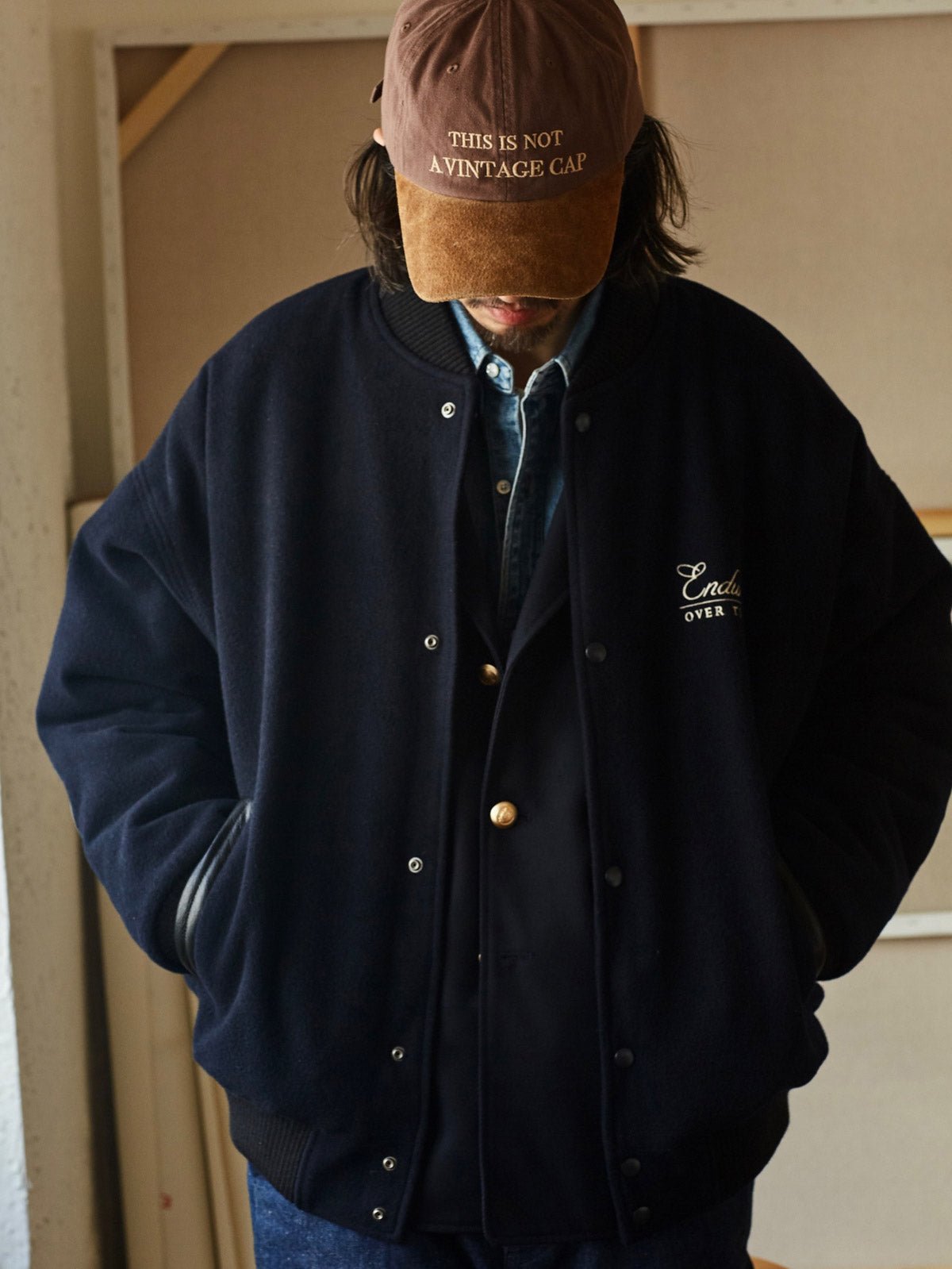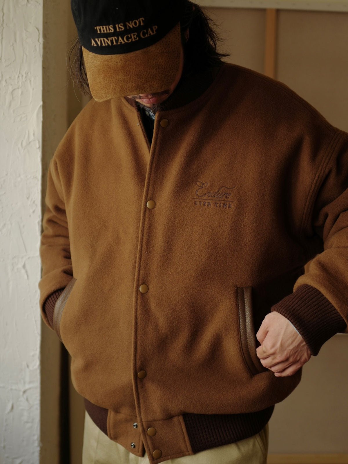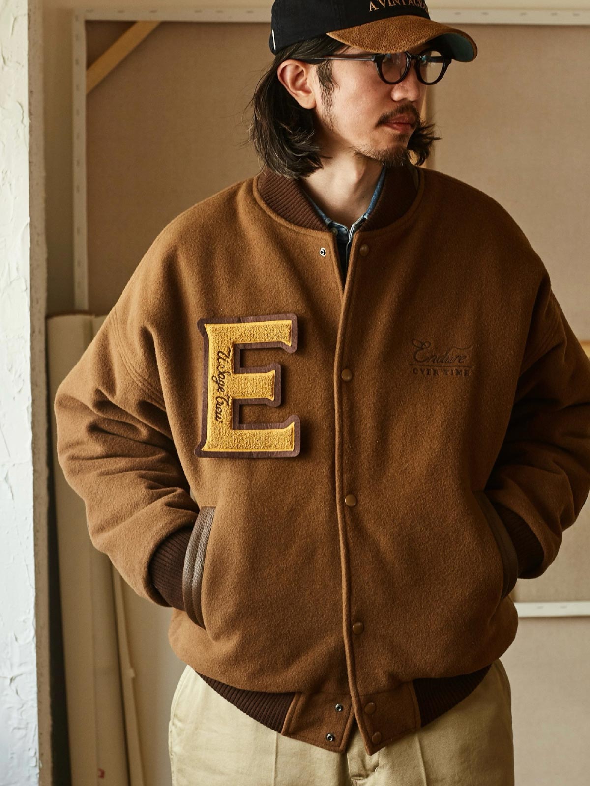付属のヴィンテージ風のE字刺繍パッチにはピンが付いており、着用者が自由にカスタマイズし、個人のスタイルを表現することができます。深いネイビーと深いカーキの色合いが、レトロでユニークなアメリカンスポーツスタイルを演出し、カジュアルからフォーマルまで様々なスタイルに簡単に溶け込むことができます。