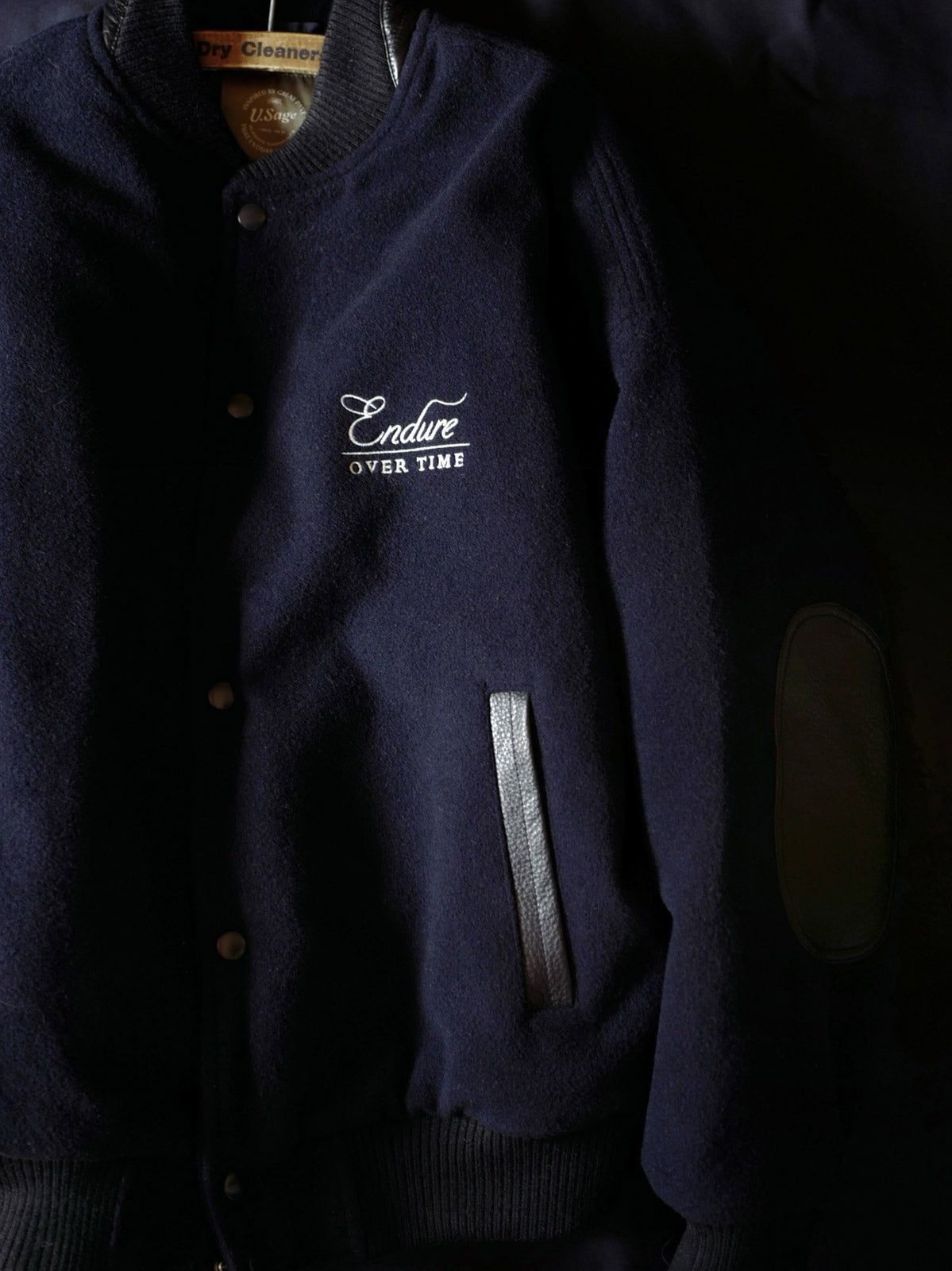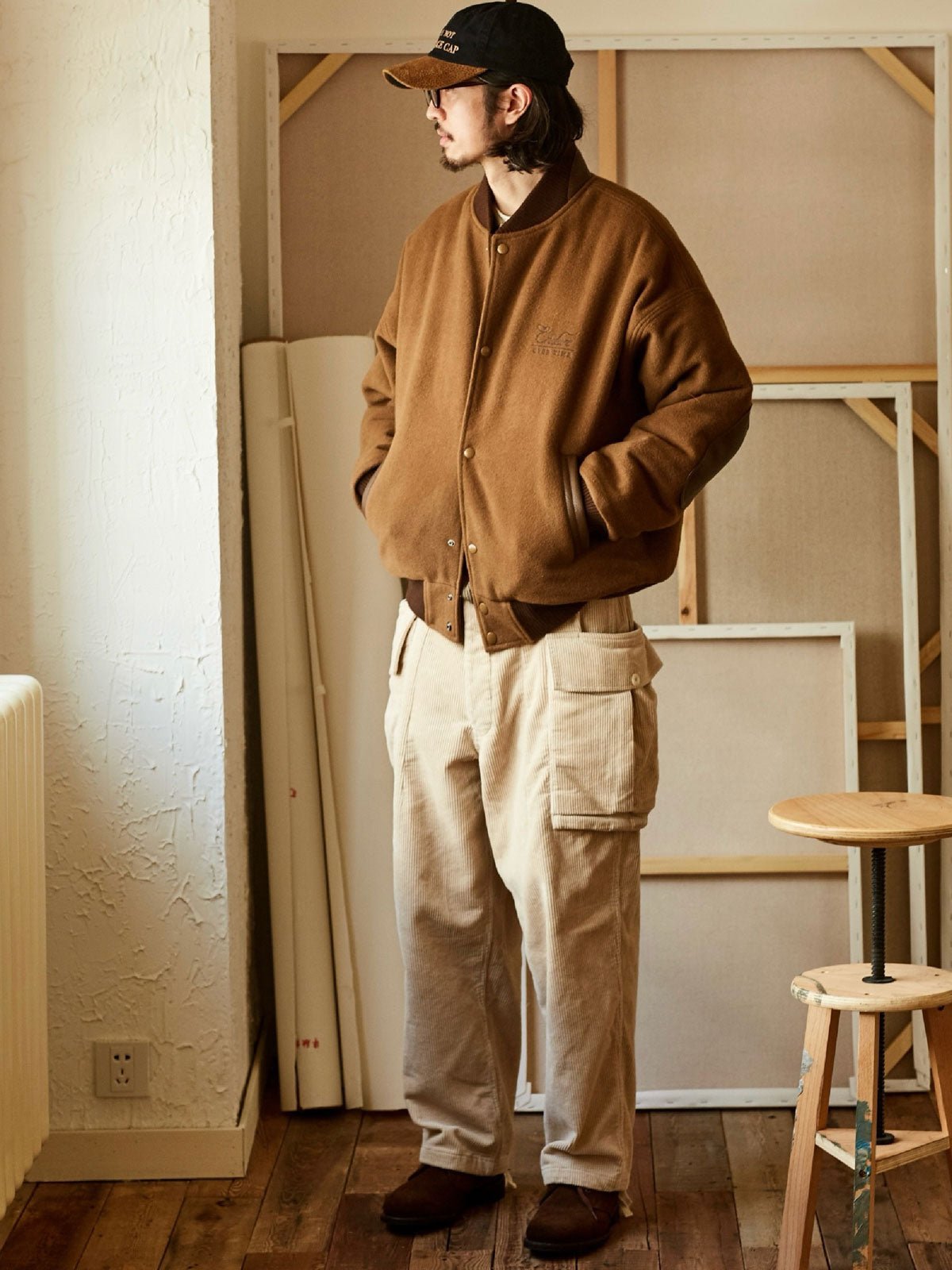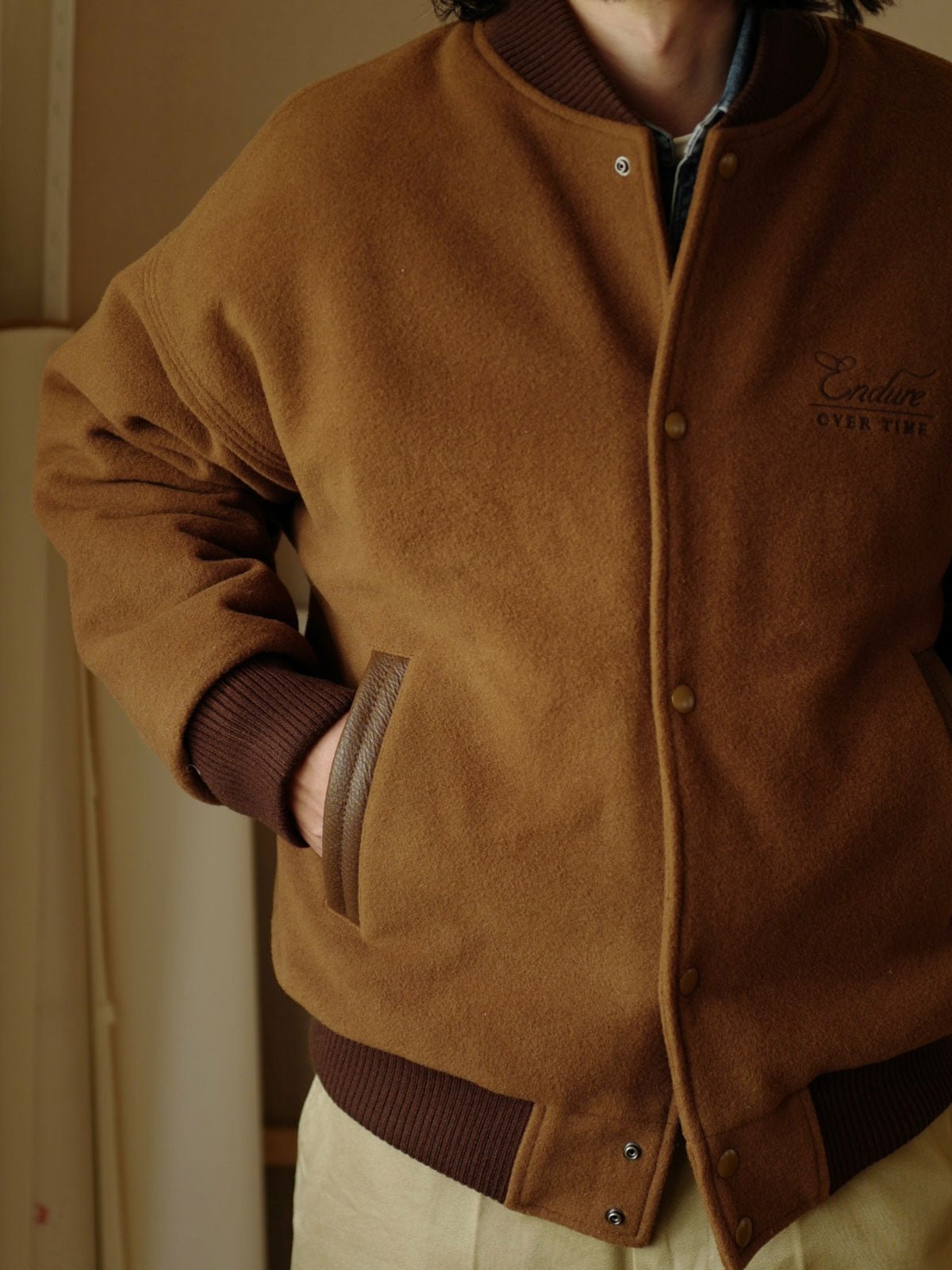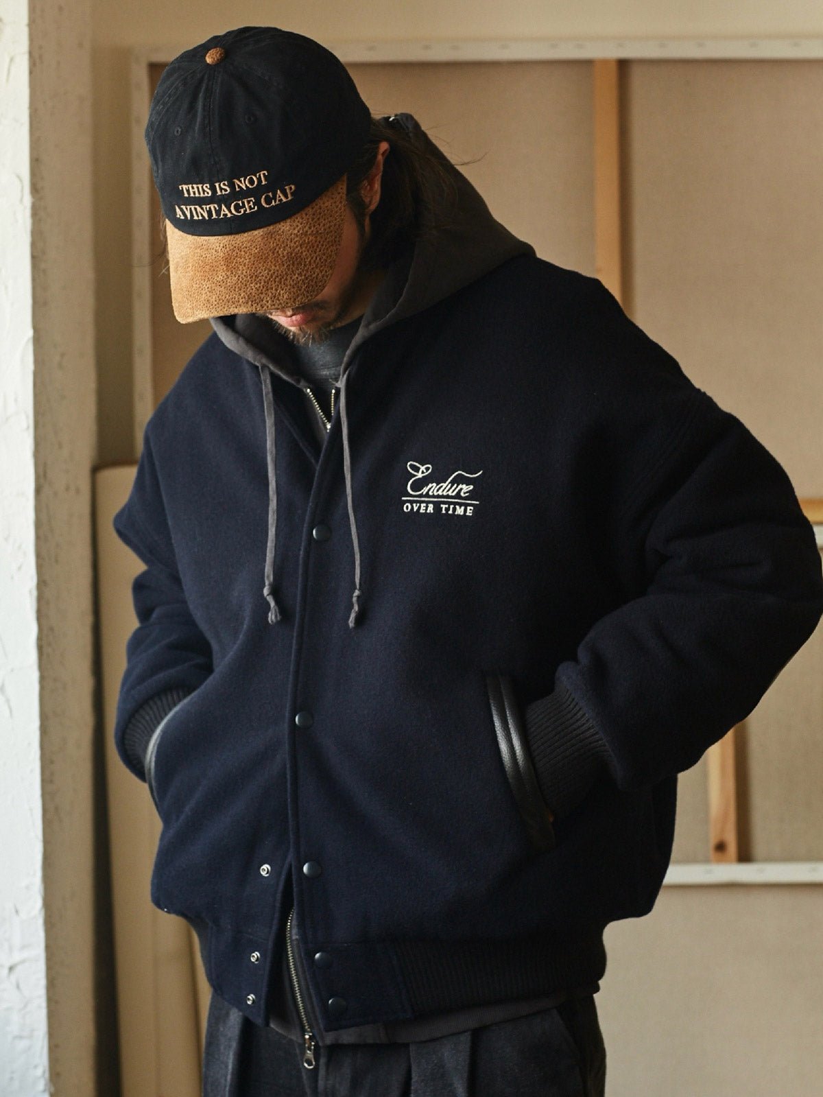 付属のヴィンテージ風のE字刺繍パッチにはピンが付いており、着用者が自由にカスタマイズし、個人のスタイルを表現することができます。深いネイビーと深いカーキの色合いが、レトロでユニークなアメリカンスポーツスタイルを演出し、カジュアルからフォーマルまで様々なスタイルに簡単に溶け込むことができます。