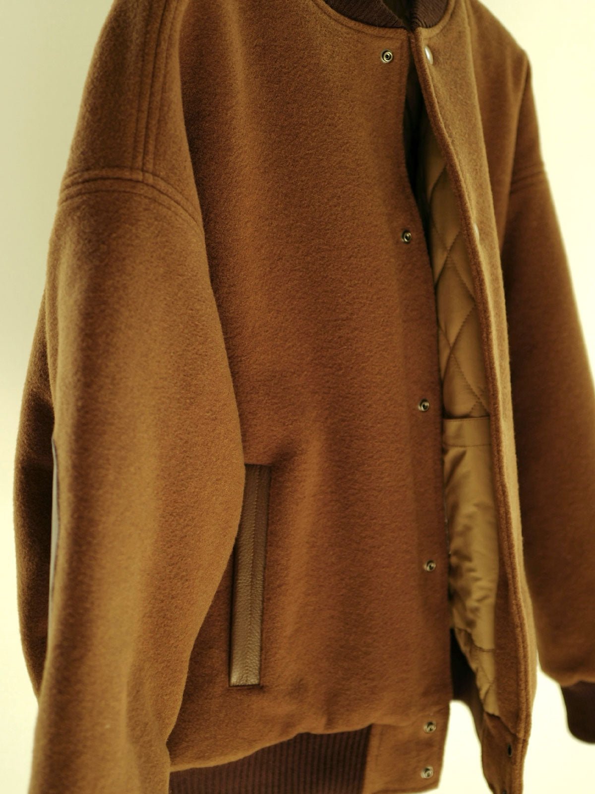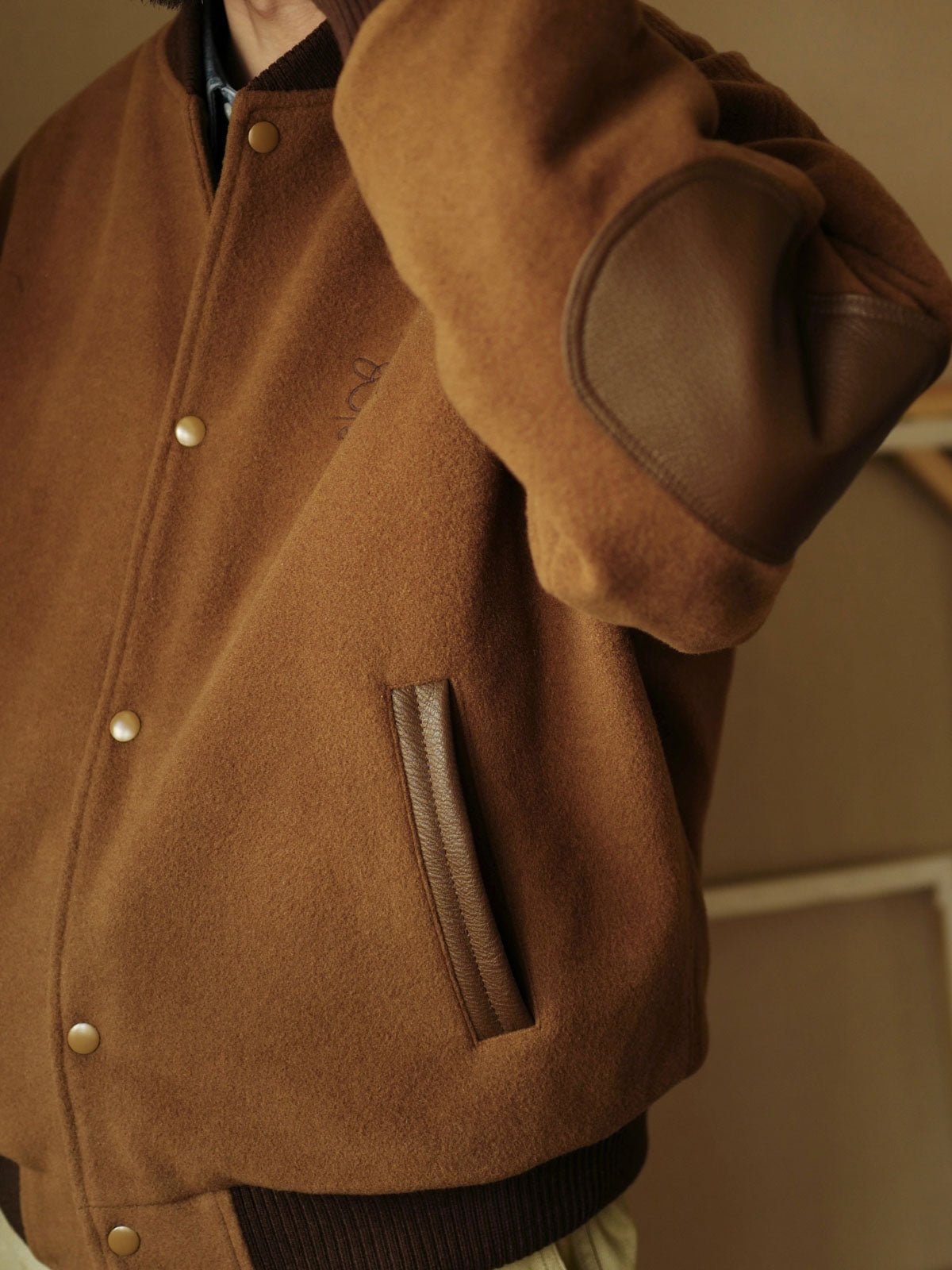 通常のショートカットの野球ジャケットには、襟、肘、ポケットなどの重要な部分に超柔らかい純牛革を採用しており、耐久性を高めつつ全体の質感も向上しています。袖口、裾、襟の伝統的なスタイルを保ちつつ、着心地を向上させるための古典的な高密度ウール混紡リブデザインが特徴です。