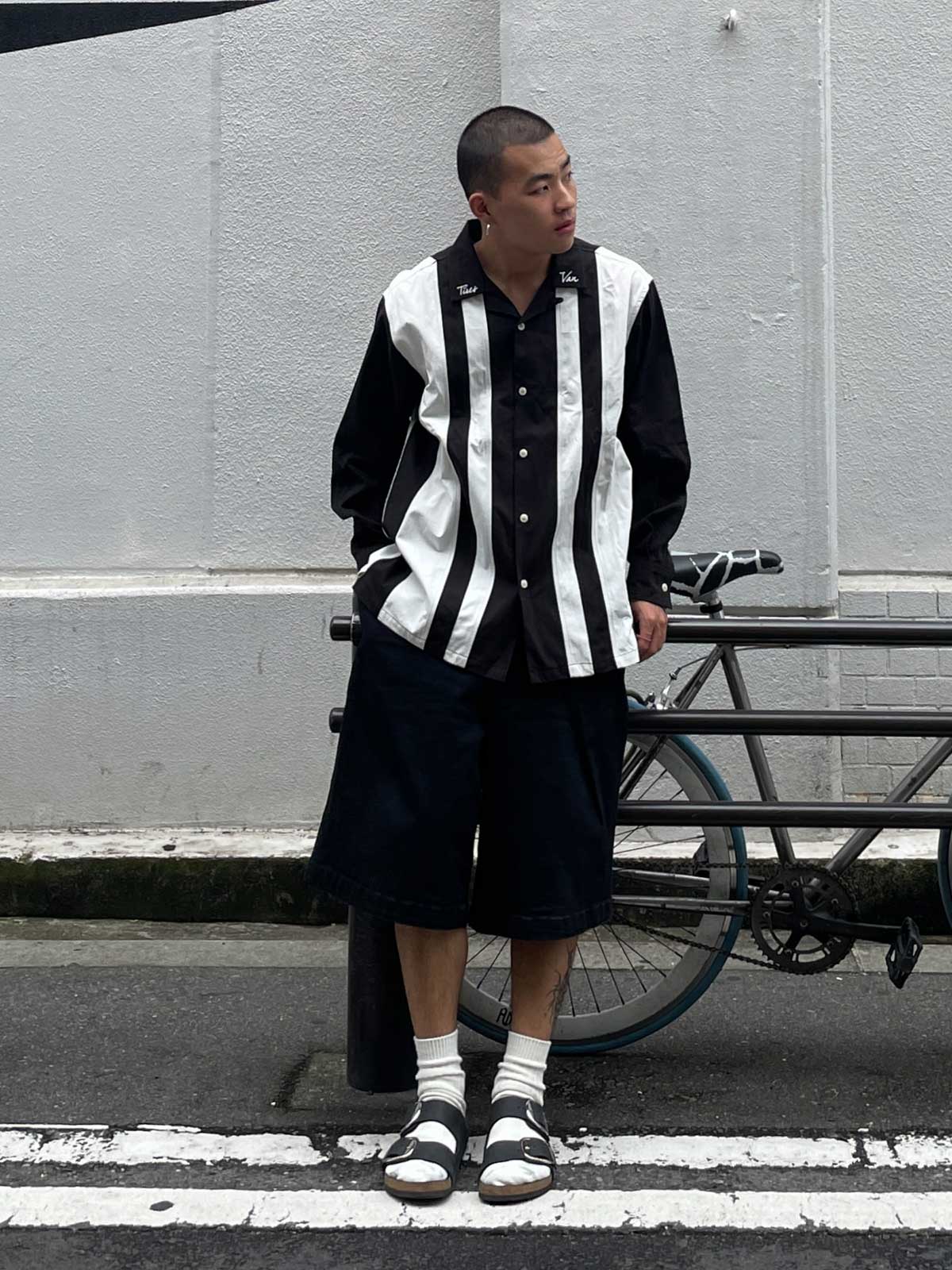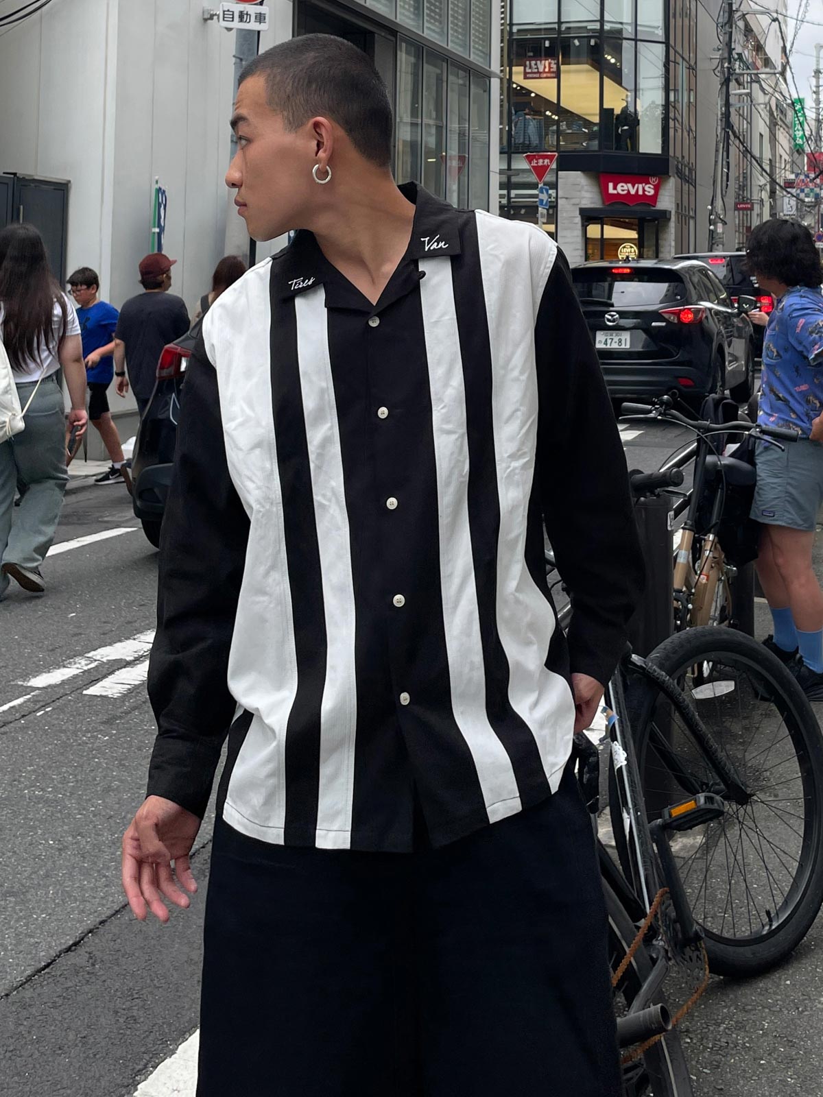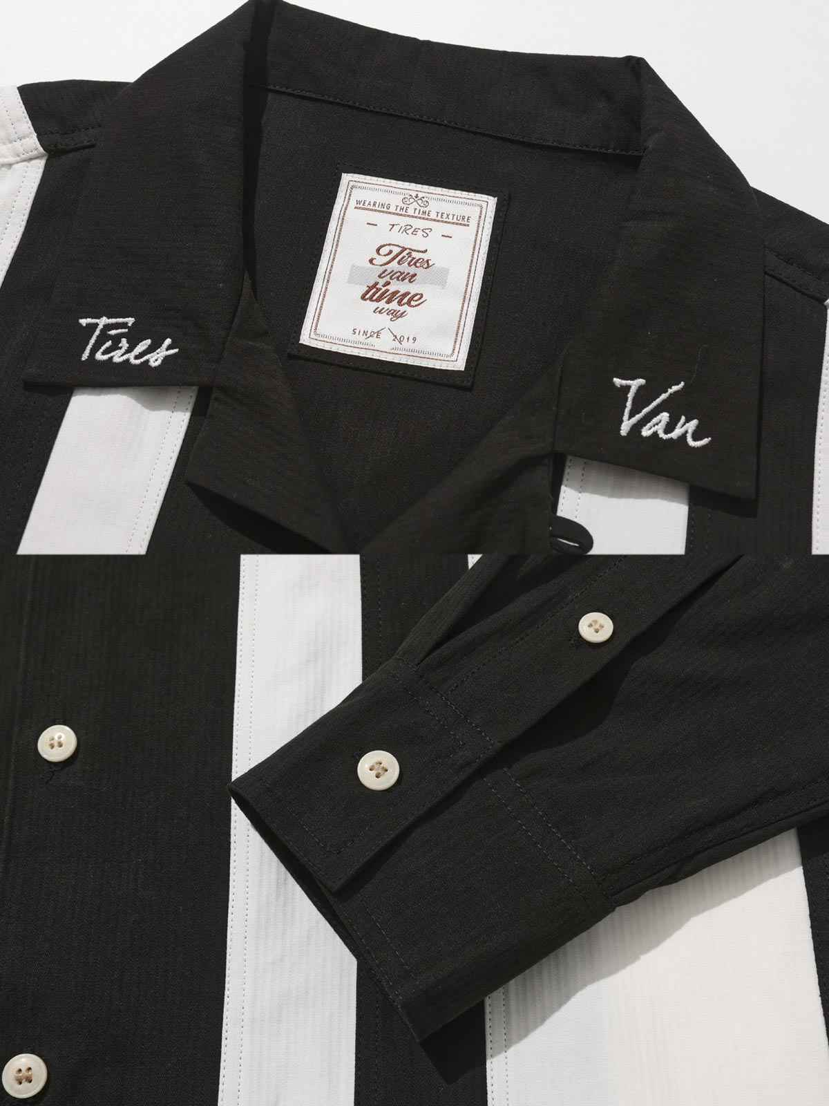 クラシックな黒と白の配色と独特な刺繍が特徴のこの切り替えストライプ長袖シャツは、高品質なコットン素材を使用し、快適さとスタイリッシュさを兼ね備えた着心地を提供する。