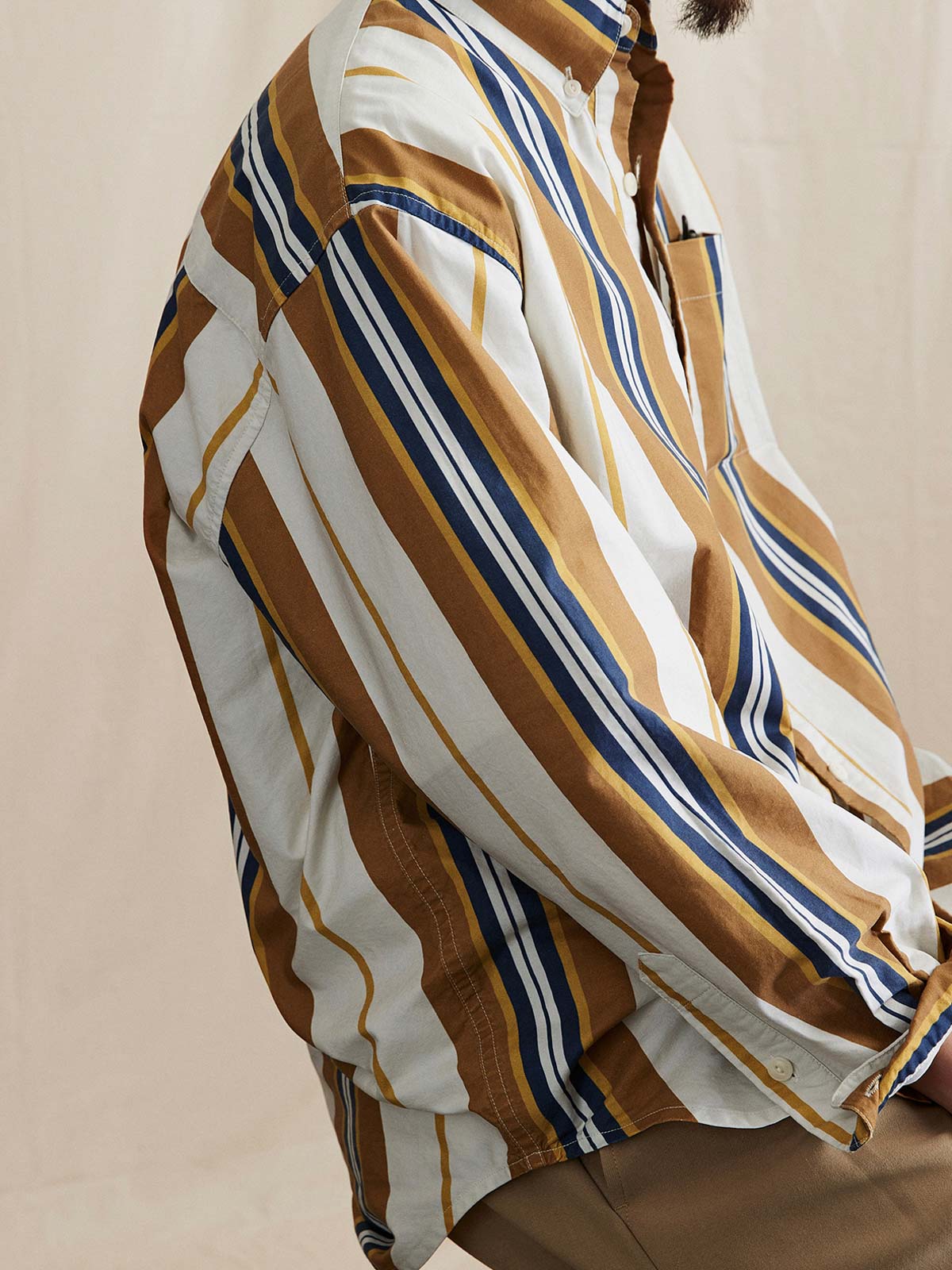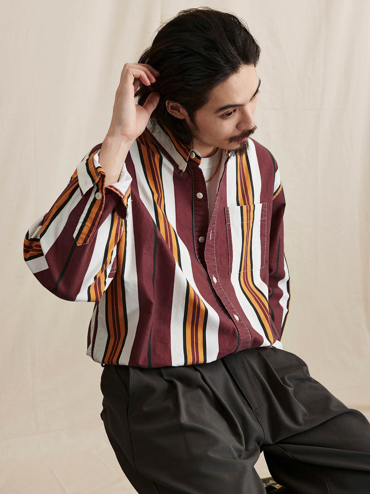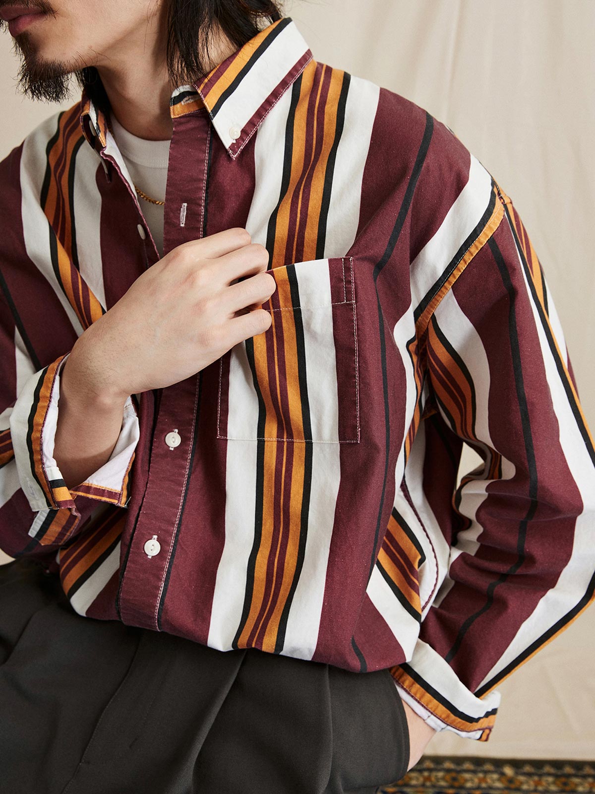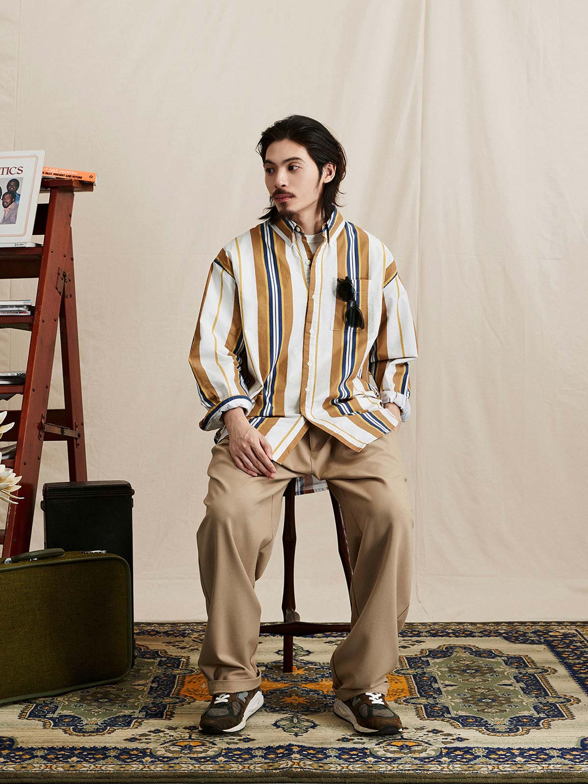 秋冬シーズンに欠かせないこのヴィンテージ加工ストライプ長袖シャツは、カジュアルでリラックスしたスタイルで秋冬に活気を与えます。180gの100%ロングステープルコットンオックスフォード生地を使用しており、快適で柔らかく、耐久性と通気性に優れています。デジタルプリント技術により、ストライプの色がしっかりと固定され、クラシックなストライプ配色がシャツ全体にヴィンテージ感を与えます。ストーンウォッシュ加工により、表面に快適なフランネル感を持たせ、微妙な色落ち感を表現。シャツの襟には古着風の小さなボタンが付いており、形を保ちます。高いスリットとラウンドヘムのデザインが、さらにレトロな魅力を引き立てます。黄色のストライプと赤色のストライプの2色展開で、どちらも秋冬のスタイルに温かさとファッション性をプラスします。