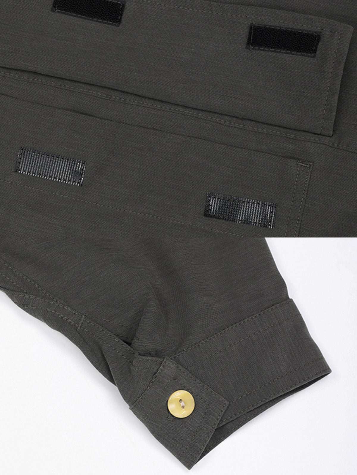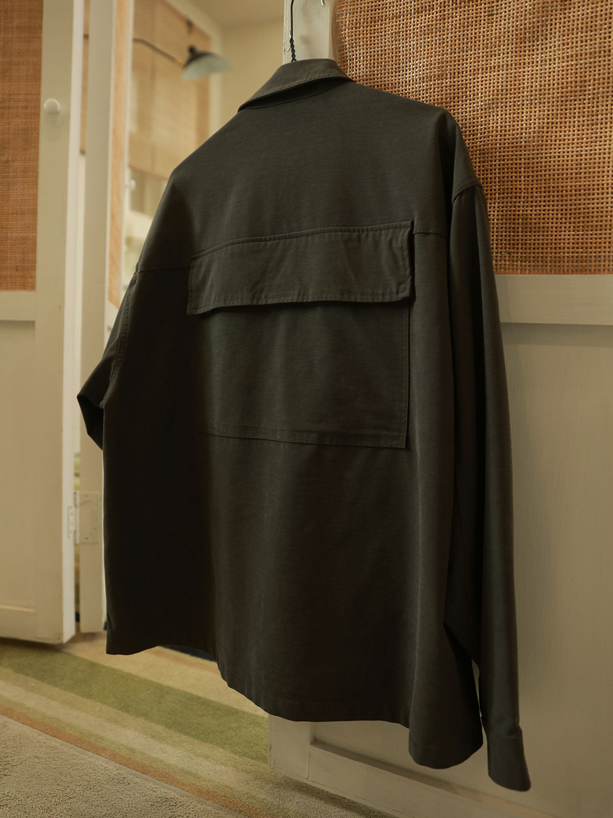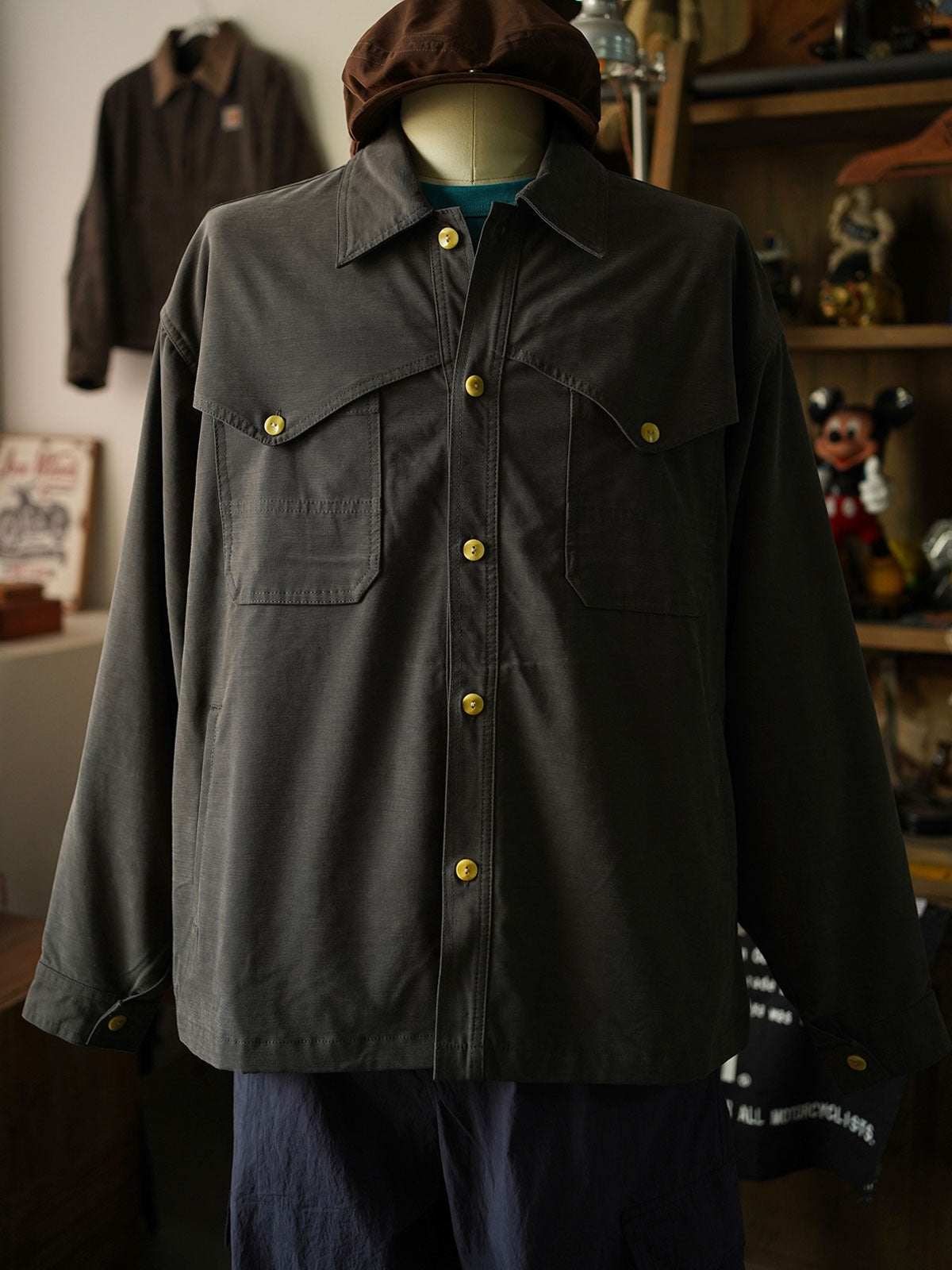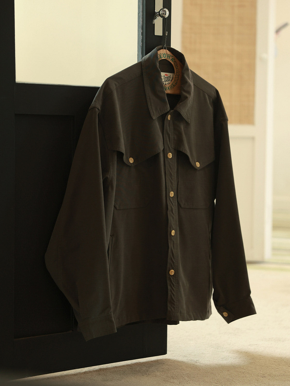 この長袖シャツは、ヘビーコットンとレーヨンの混紡素材を使用し、表面にはスラブテクスチャが施されており、肌触りが良くしっかりとした質感があります。19世紀のアメリカ西部の冒険家が着用していたアニマルスキンシャツにインスパイアされ、現代風に改良されています。肩の三角補強、肘の補強、胸のフラップポケットなど、ウエスタンシャツの象徴的な要素を取り入れつつ、斜めのスラッシュポケットや背面の大型ポケットを追加し、実用性とファッション性を高めています。素材はガーメントウォッシュ加工されており、柔らかな色合いと独特のヴィンテージ感を持ち、都市とアウトドアの両方に適しています。
