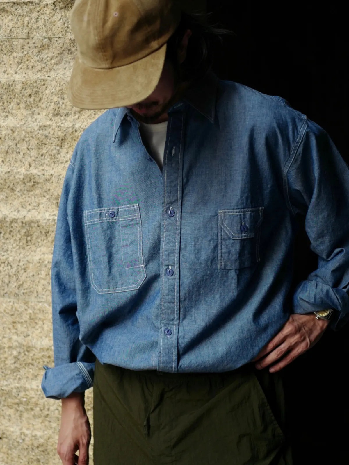 1900年代初頭に誕生し、1920年代に胸ポケット×2、ゆったりシルエットを確立したアメリカンワークシャツの伝統を踏襲。岡山県井原市の旧式力織機で織られる純綿チャンブレー(青年布)は、現代機器では再現できない深い凹凸感と豊かなコットンタッチを誇り、洗い込むほどに古着のような風合いが増す。サイドスリットと留めヒゲ、後襟の手刷り風プリントタグなど、細部までヴィンテージを体現。胸元には左側にSmoker Pocket、右側にペン差し付き大ポケットを配置し、カスタム染色の魚眼スナップボタンを採用。縫い目は高密度のチェーンステッチで仕上げ、ボディと成衣段階で二度洗いを行うことで快適かつ安定した着心地を実現。