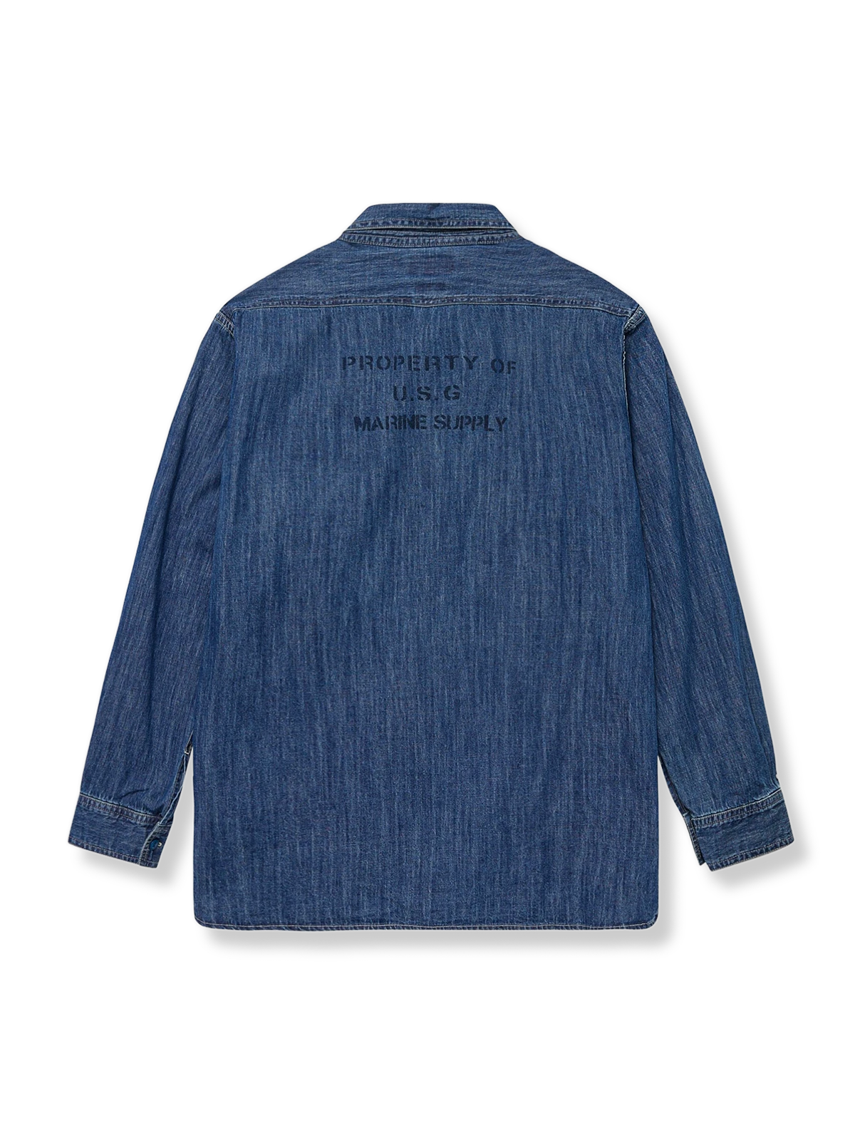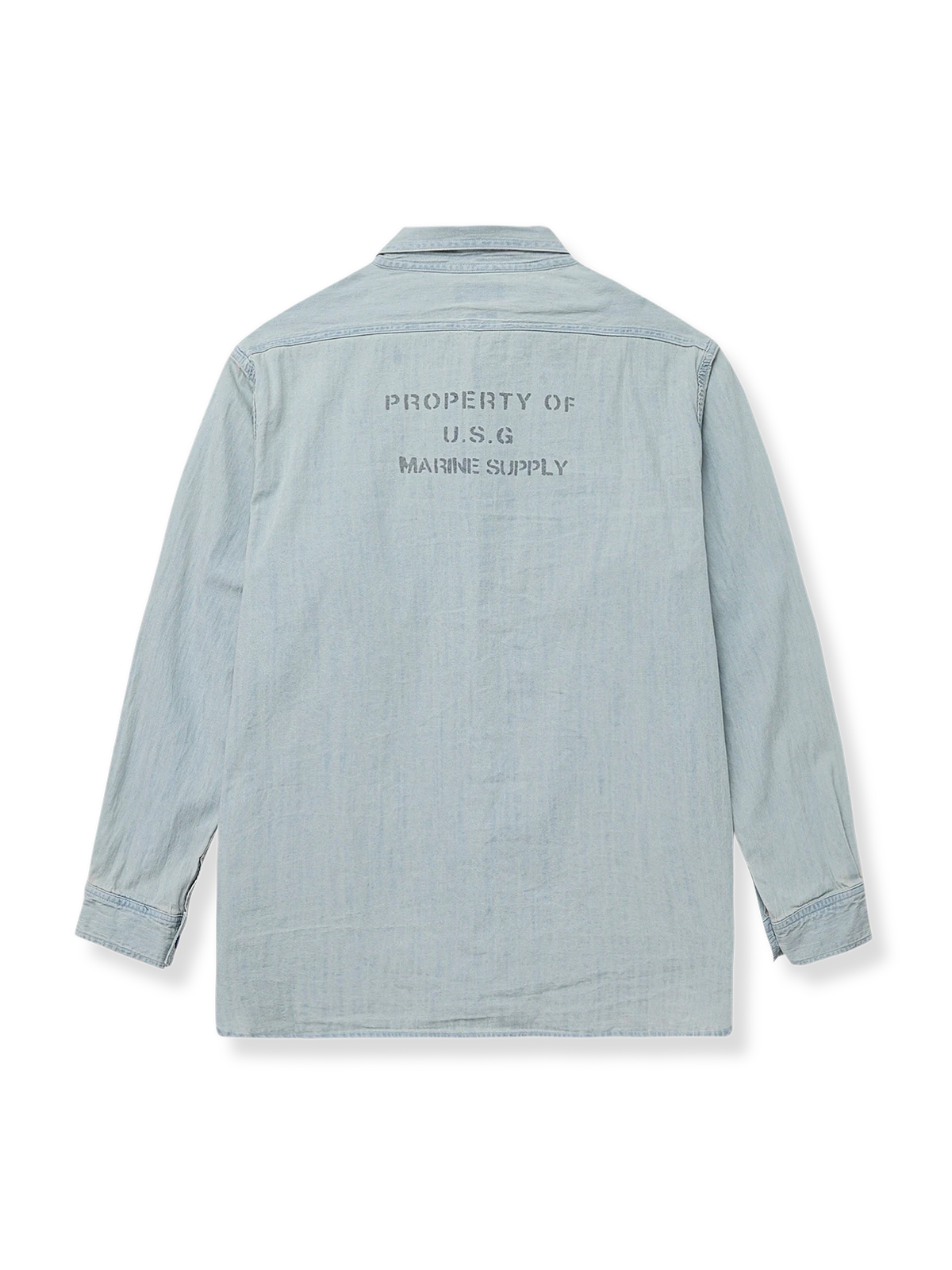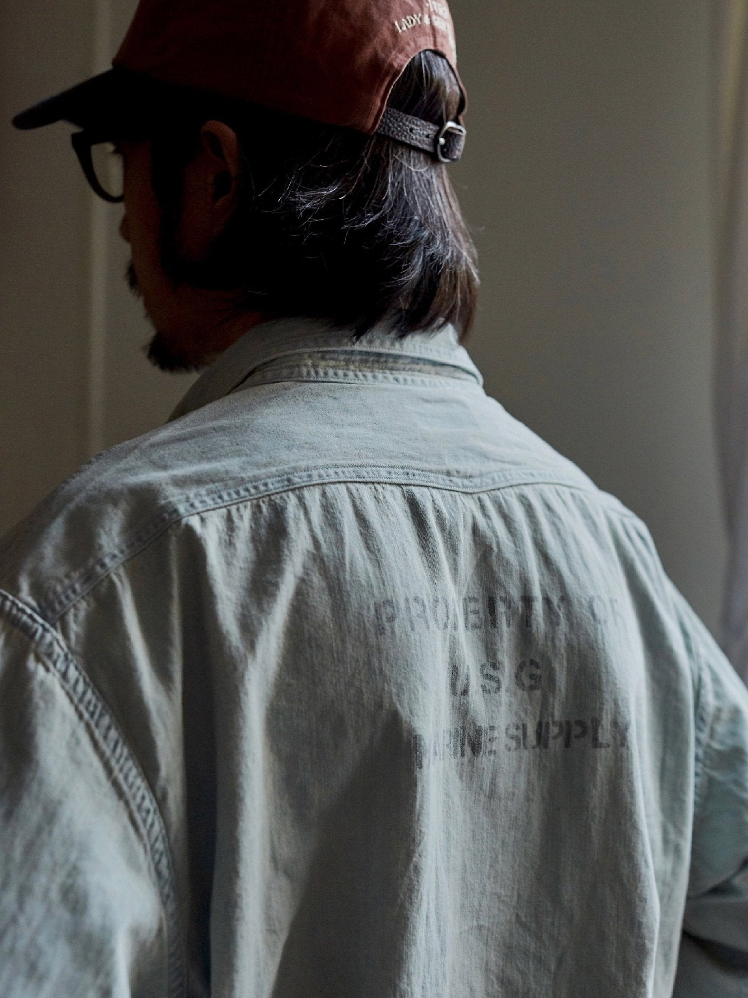 シャツの前身頃にはダブルボタンポケットがあり、ネイビーのカットボタンが海の要素を引き立てます。左胸と背面に使用される文字はシルクスクリーンプリント技術を使用しており、ヴィンテージ海軍シャツの鉛版フォントを再現し、文字がはっきりと表示されており、ヘビーブリードストーンウォッシュ加工により耐久性と色落ちのない特性が持たされています。