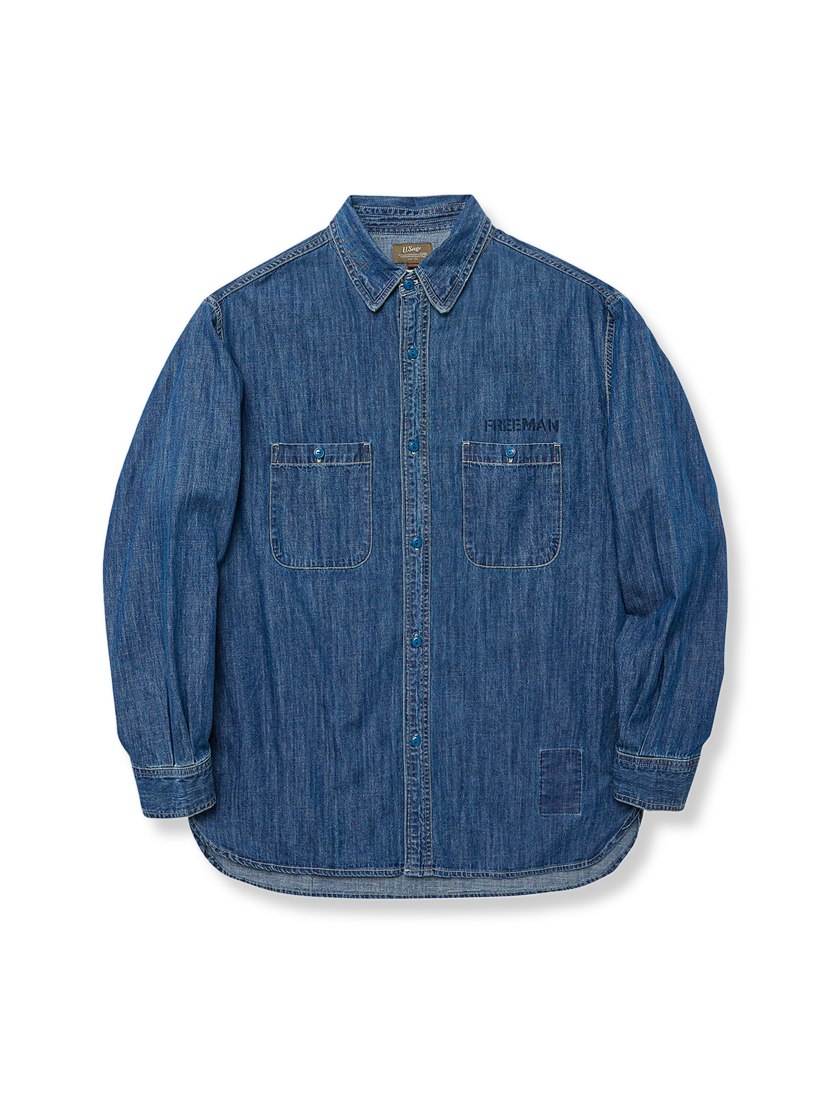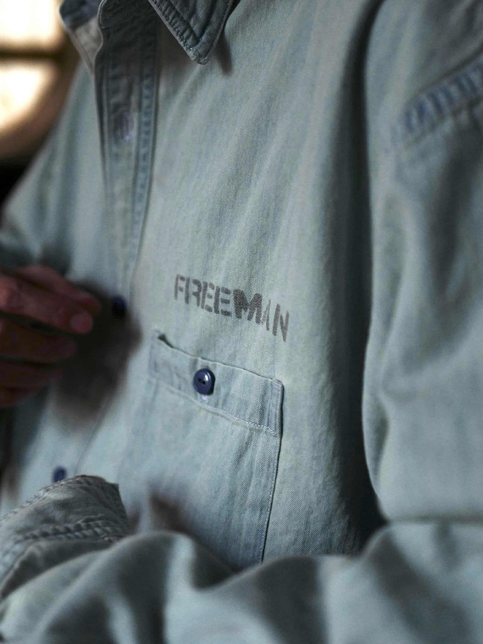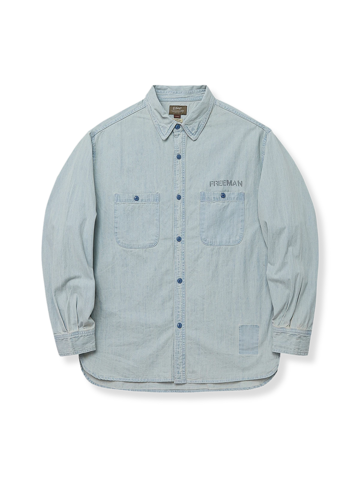 シャツの前身頃にはダブルボタンポケットがあり、ネイビーのカットボタンが海の要素を引き立てます。左胸と背面に使用される文字はシルクスクリーンプリント技術を使用しており、ヴィンテージ海軍シャツの鉛版フォントを再現し、文字がはっきりと表示されており、ヘビーブリードストーンウォッシュ加工により耐久性と色落ちのない特性が持たされています。