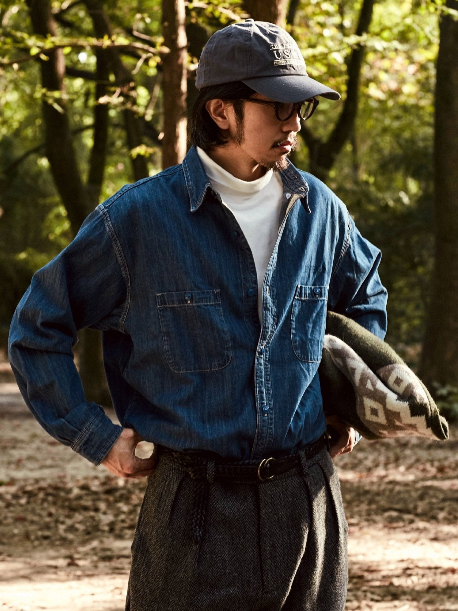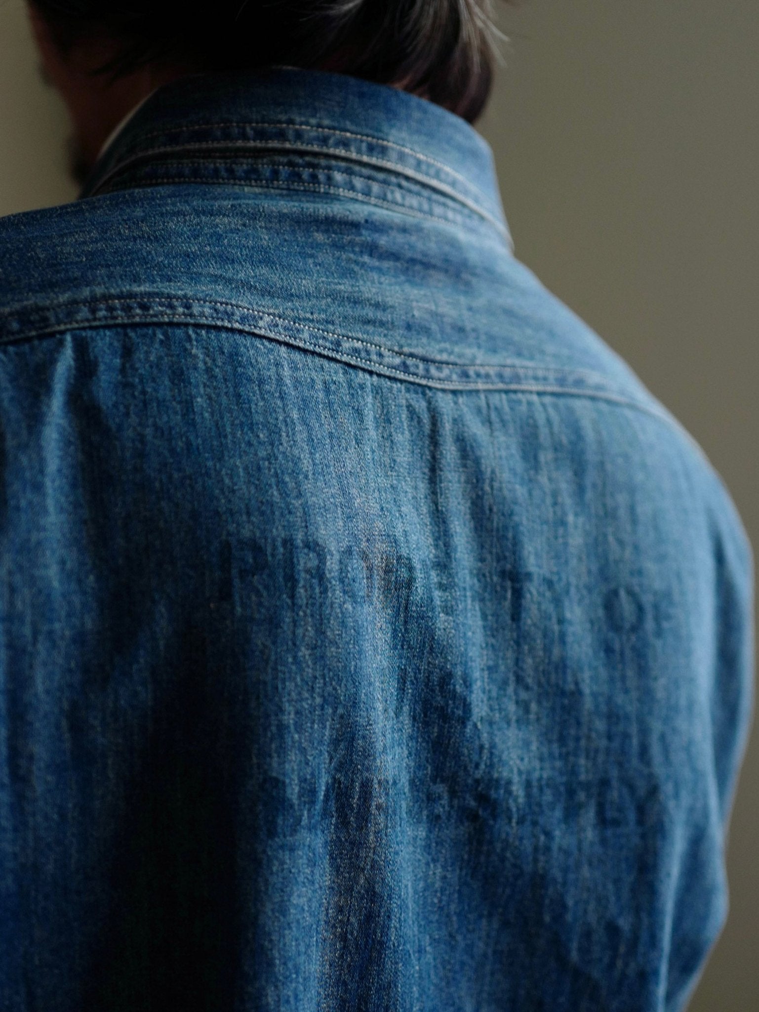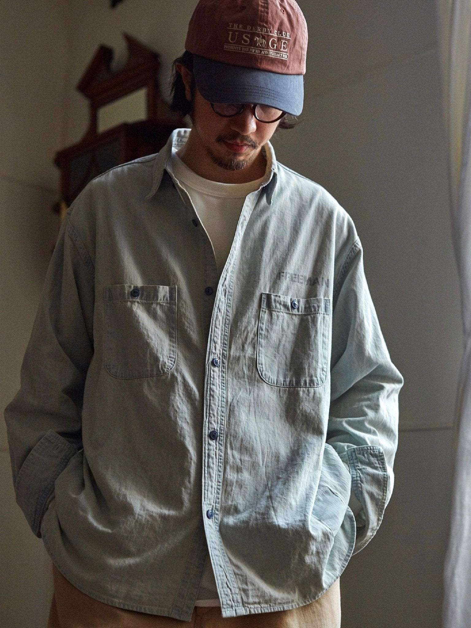 ディテールの処理に特に注意が払われており、異なるウォッシュと石磨き加工によりシャツに深みのある質感が与えられています。ダークバージョンはレトロなしっかりとした質感と粒状感があり、ライトバージョンは柔らかさと快適さに重点が置かれています。ダブルボタンポケットやネイビーカットボタン、シルクスクリーンプリントされたフォントなど、すべてのディテールがシャツのレトロなスタイルを強調しています。