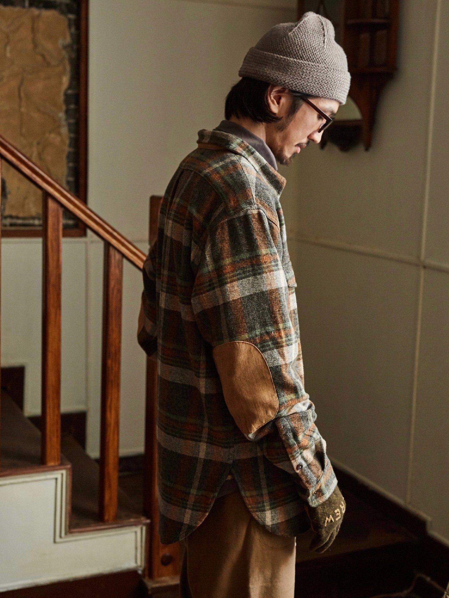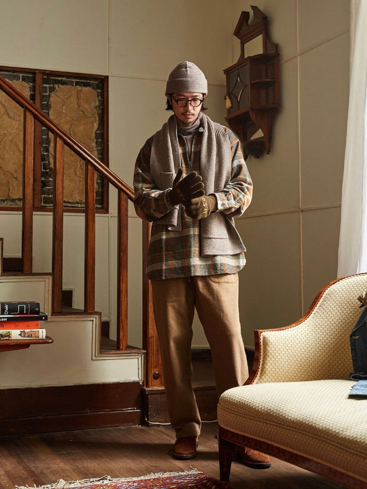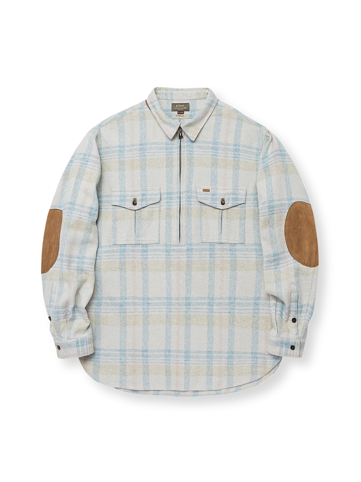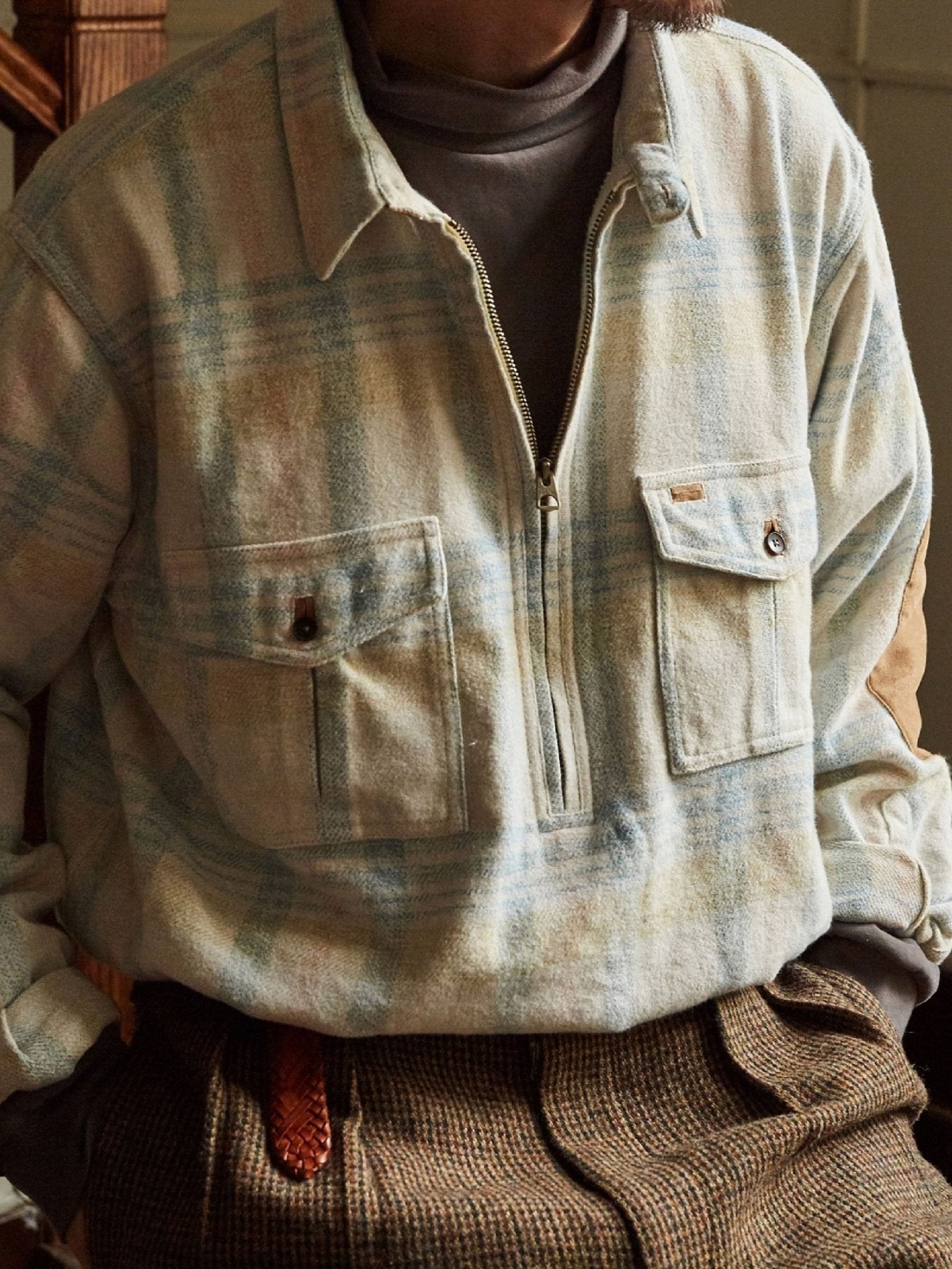 肘と襟の部分にはスエードの補強が施され、胸ポケットにはペンホルダーなどのディテールが備えられています。襟にはIDEALのジップが使われ、インナーウェアを見せるのに便利です。前身頃のダブルポケットデザインとペンホルダーのディテールが組み合わさり、雪山のようなミルキーホワイトと紅葉のようなグレイッシュブラウンと共に、クラシックなアイテムを再現しています。