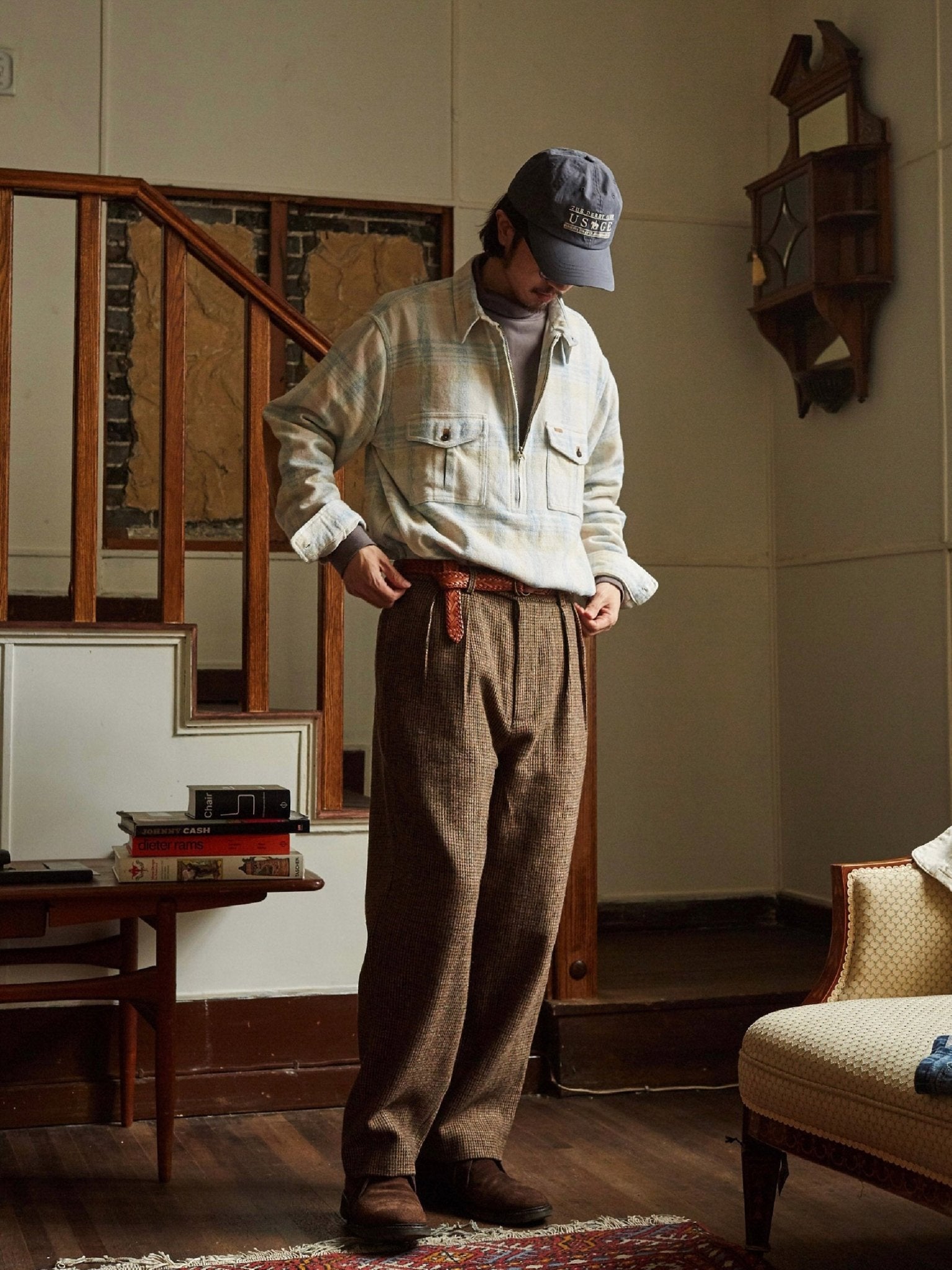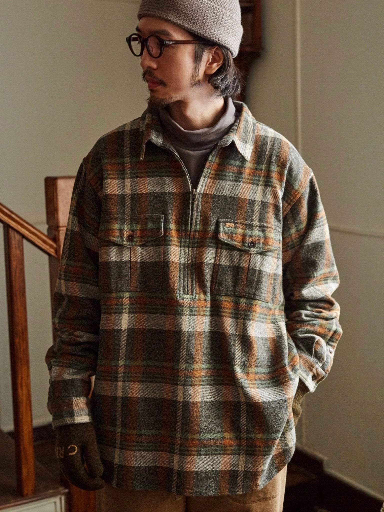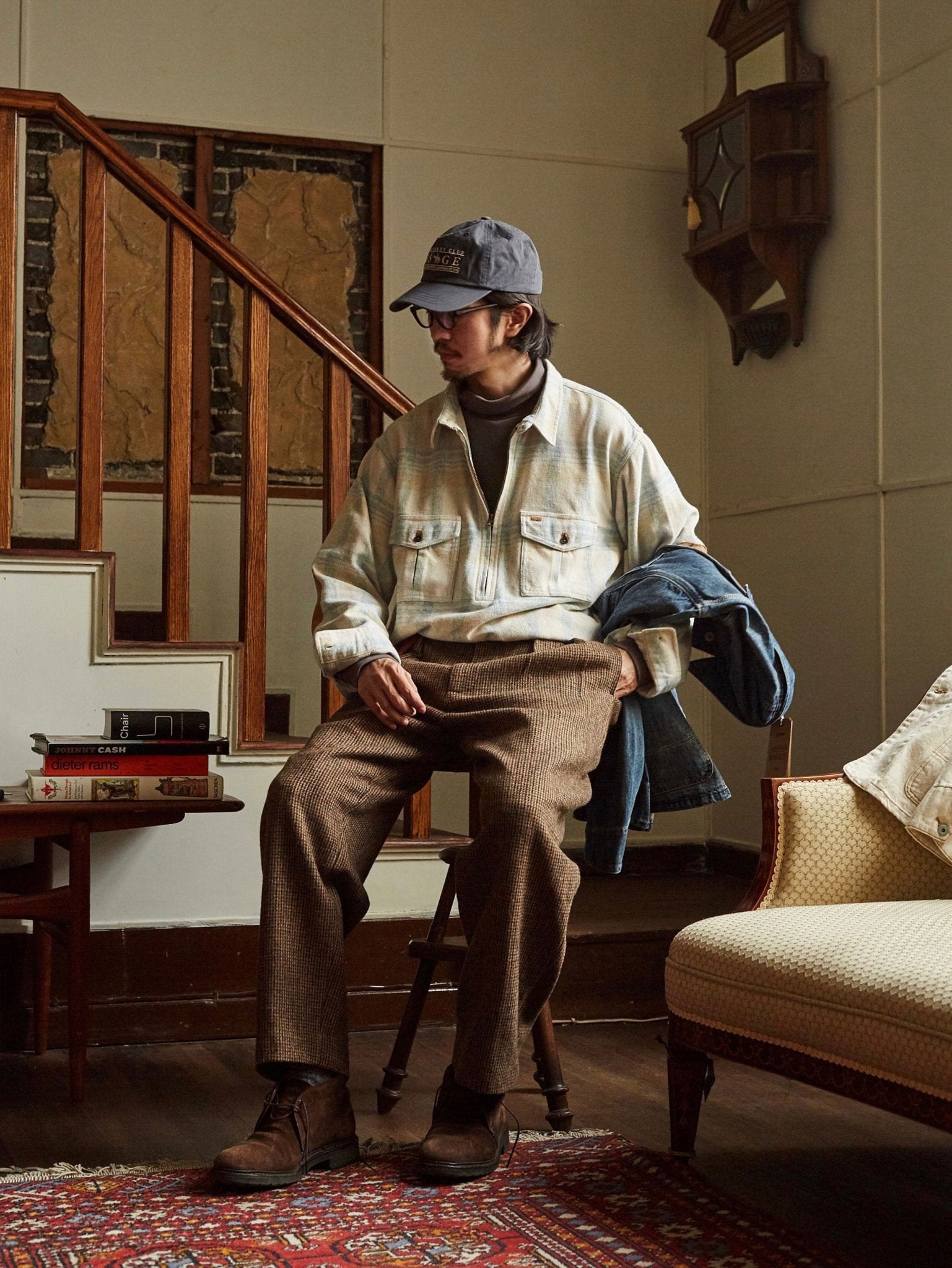 常に人気のあるシャツの中でも、プルオーバーシャツは伝統的なシャツに比べてよりカジュアルでレトロな雰囲気があります。三色糸と斜めのチェック柄によって、生地の色にヘザーグレーのようなカラー効果が加わり、古典的なレトロな雰囲気を持ち、プルオーバーシャツのディテールを豊かに演出しています。