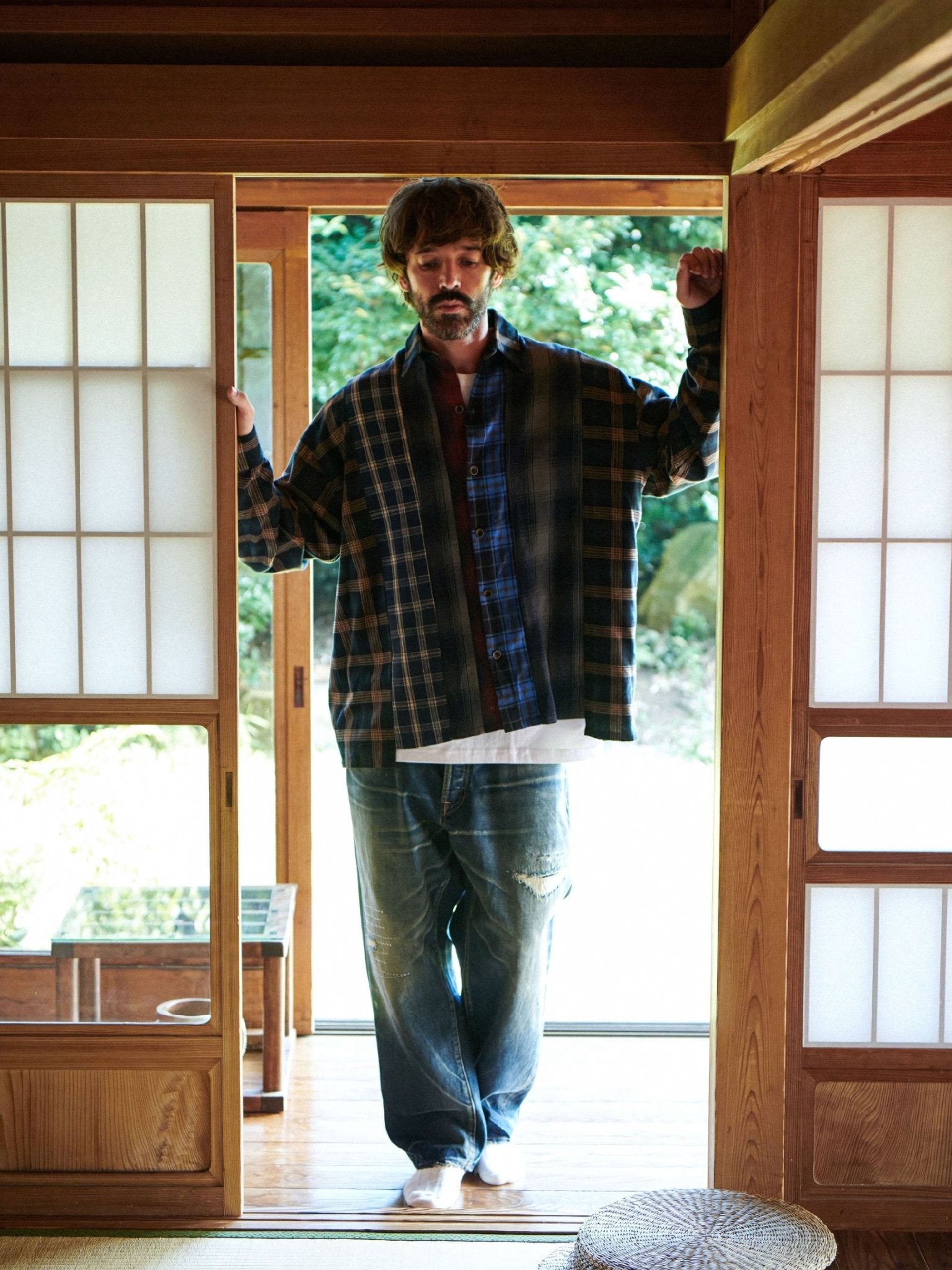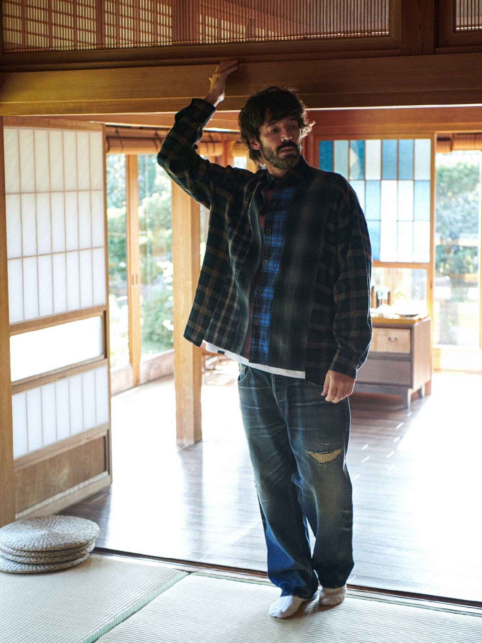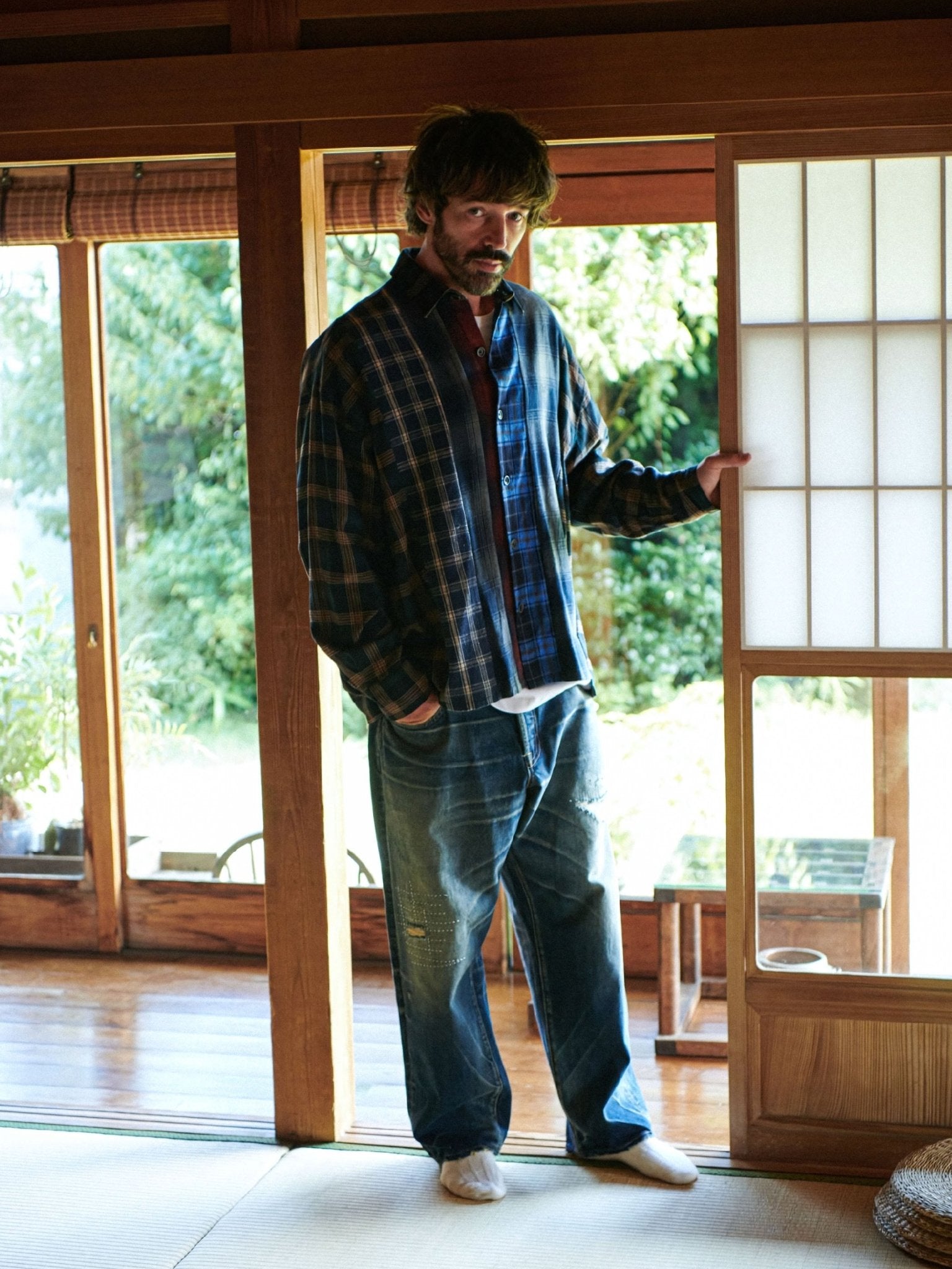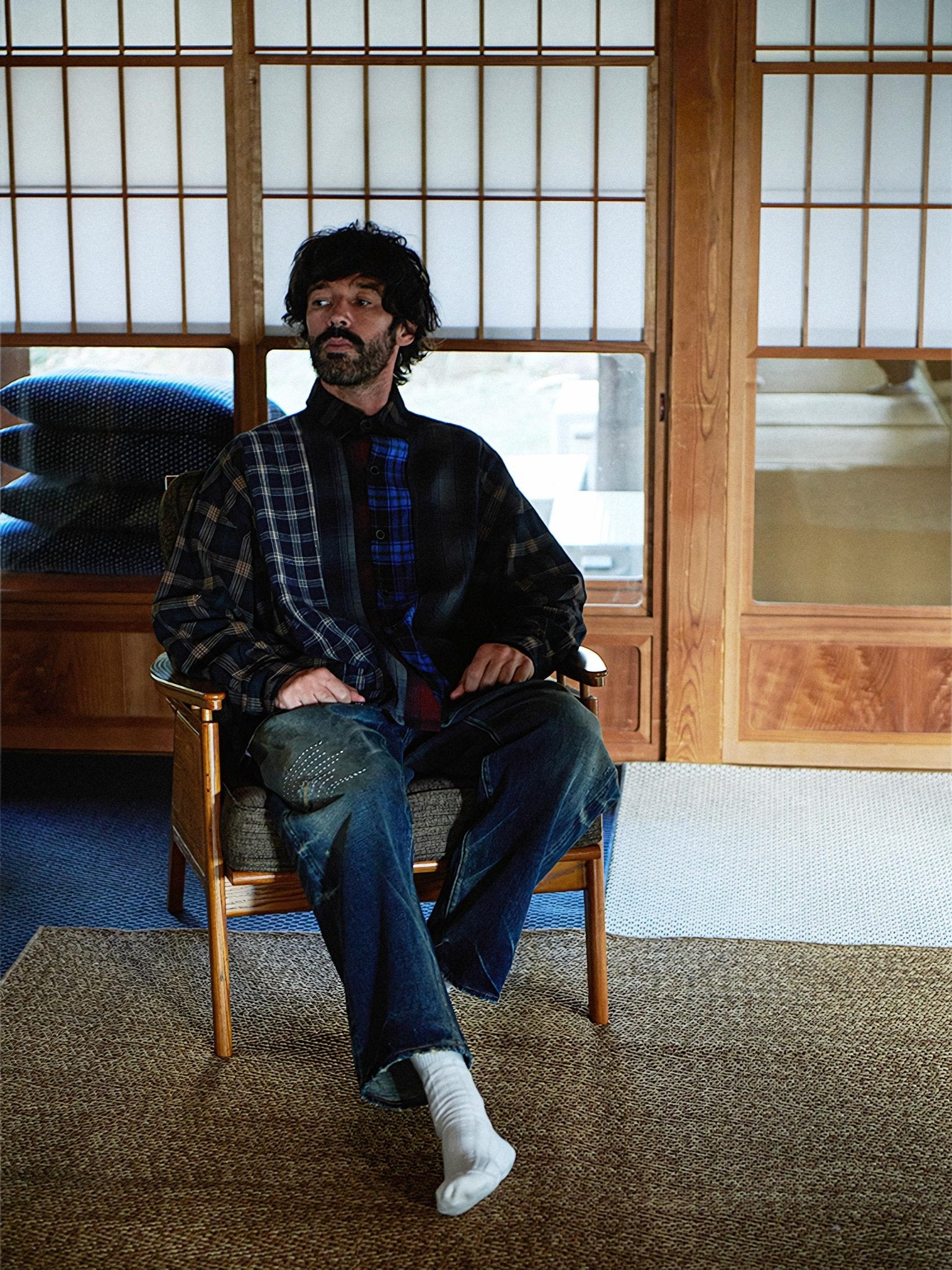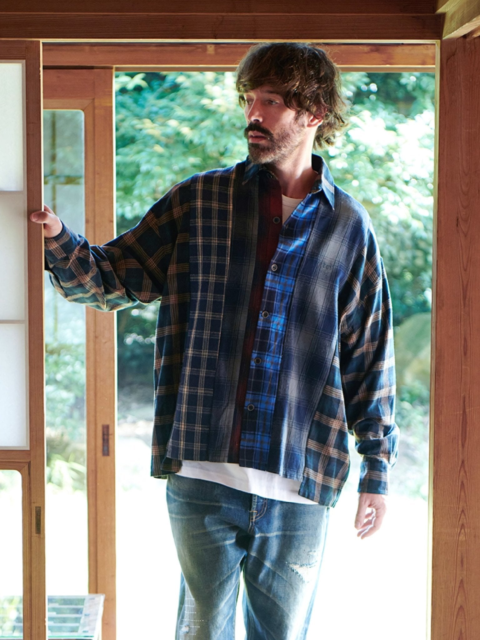 シャツの精緻なパッチワーク技術は、熟練した製作技術を見せており、5つの異なるチェック柄が巧妙に組み合わさり、豊かなパターンのレイヤーを呈しています。