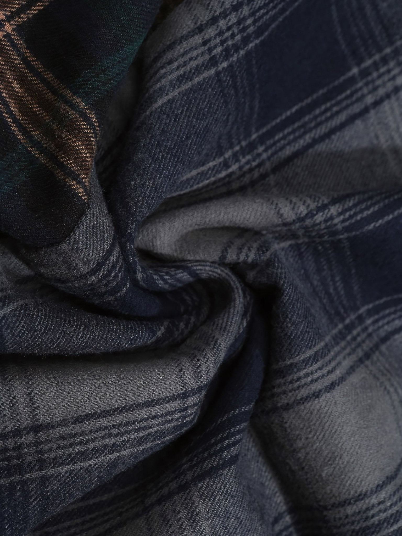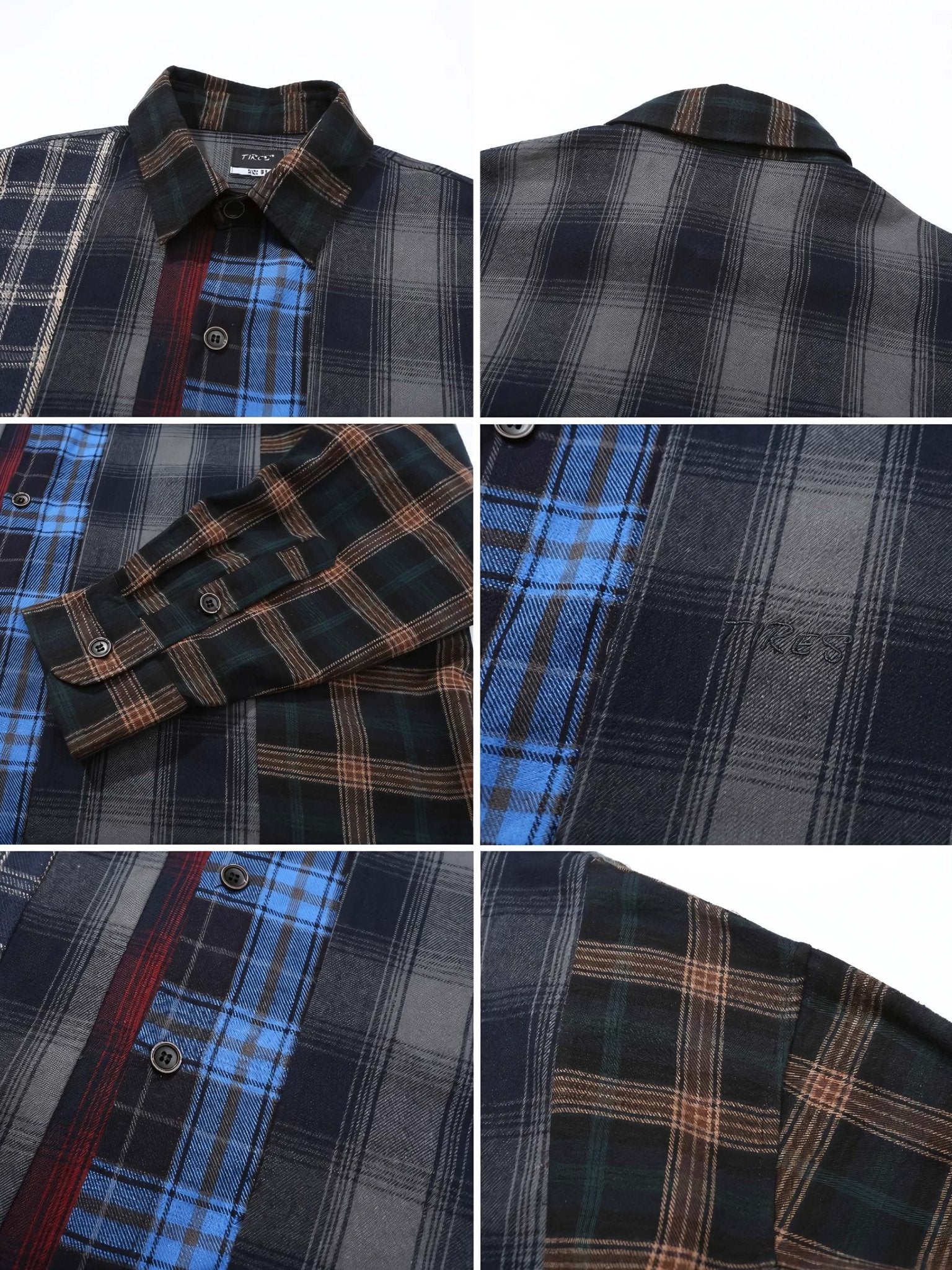 この長袖シャツは、パッチワークのチェック柄デザインが特徴で、異なる太さやパターンの5種類のチェック柄が巧みに組み合わさり、独特の視覚効果を醸し出しています。不規則な裾の形状は、シャツに芸術性とファッションの雰囲気を加えています。