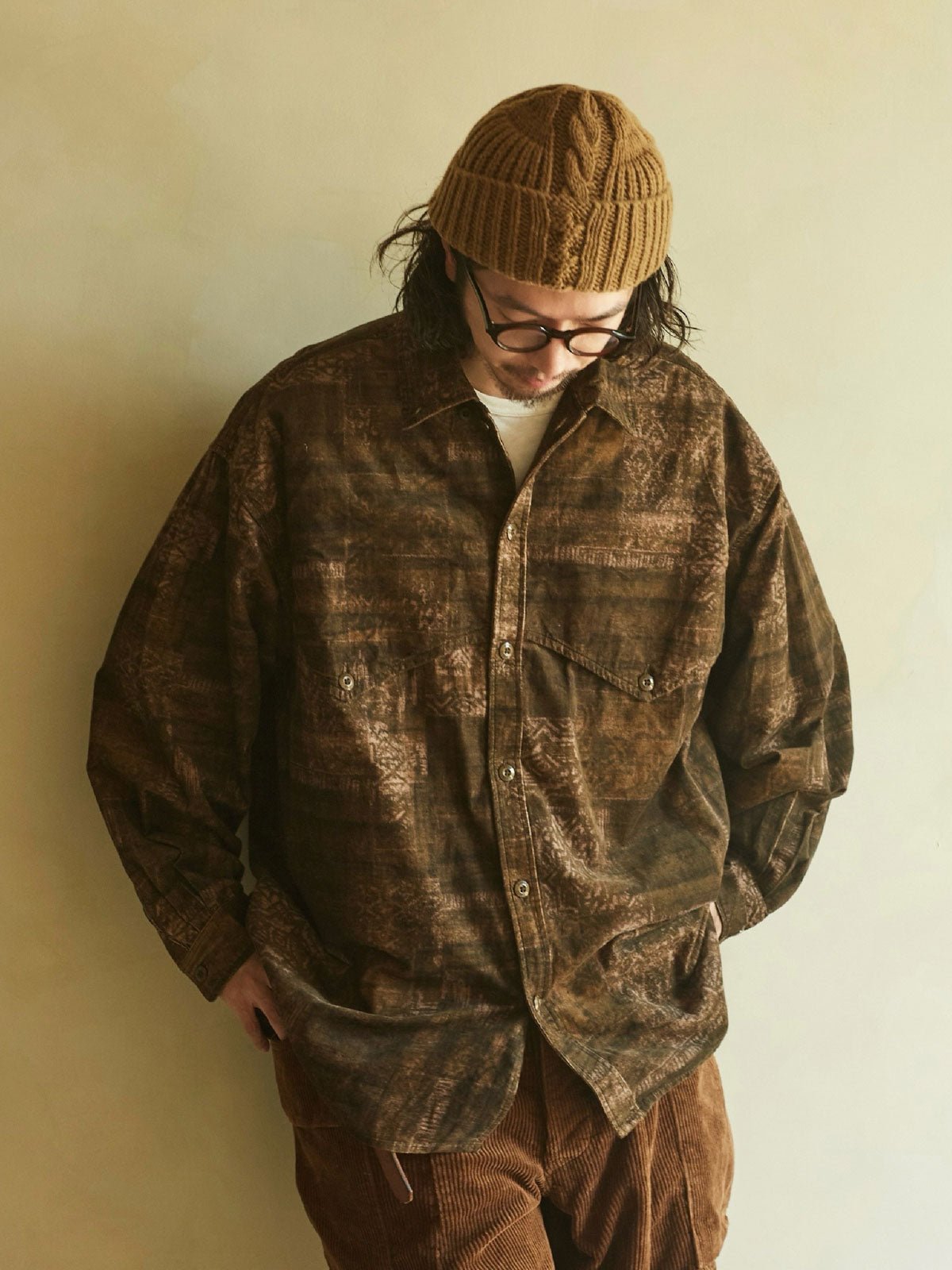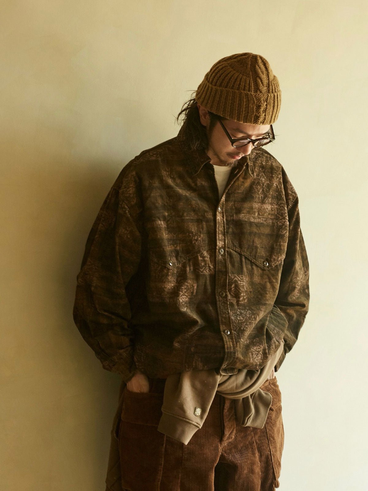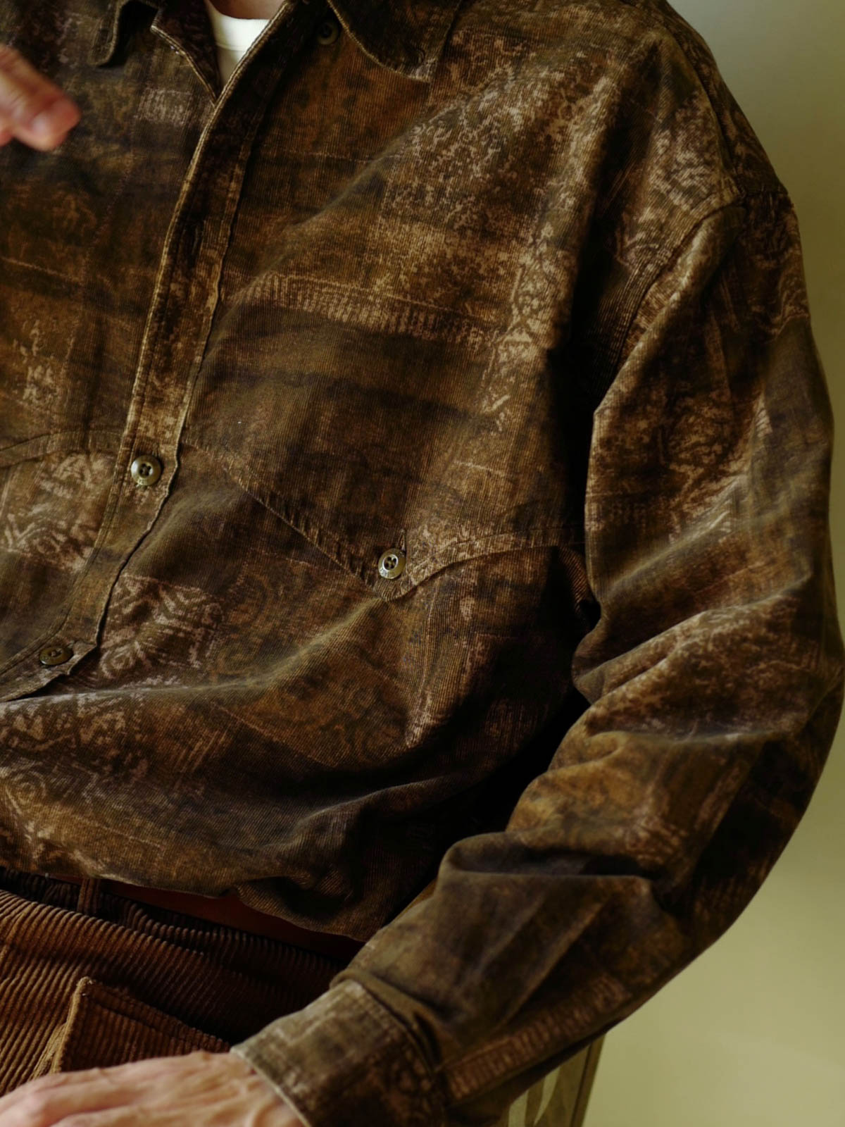 このコーデュロイウエスタンプリントシャツは、西部シャツのクラシックな要素を現代的な手法で再解釈し、レトロとモダンなスタイルを絶妙に融合させています。ウエスタンシャツは、初めて19世紀初頭に米国西部の開拓者とネイティブアメリカンによって実用的な衣類として作られました。このシャツは、伝統的なウエスタンシャツの特徴である両肩の三角形のパッチ、背中の三角形のライン、肘のパッチ、そして特徴的なフラップポケットを保持し、強調しています。