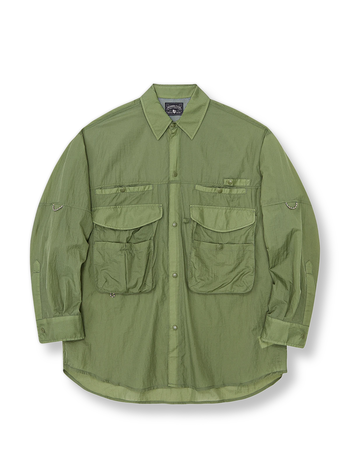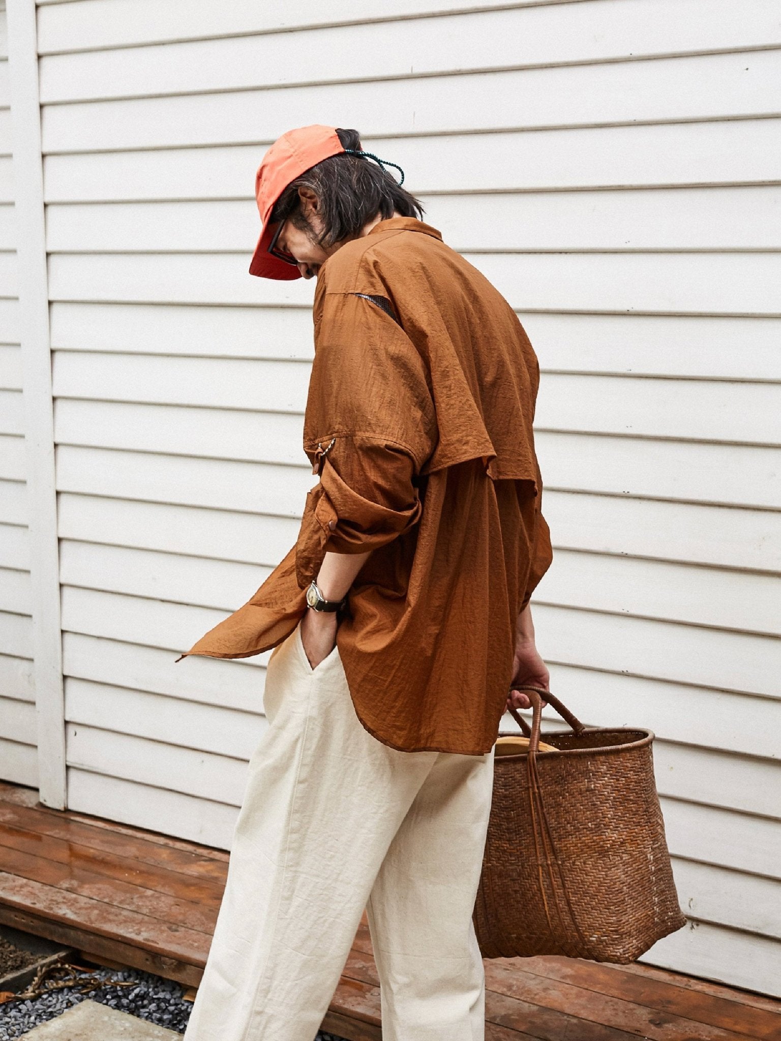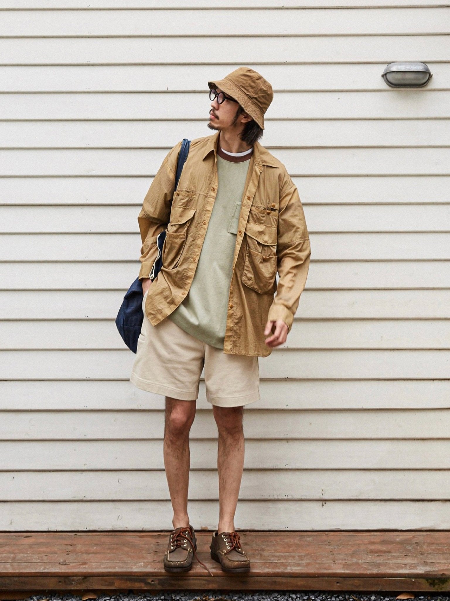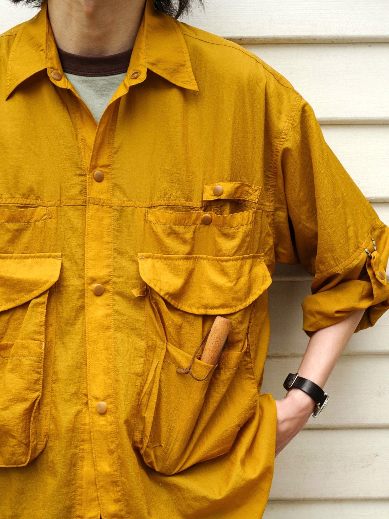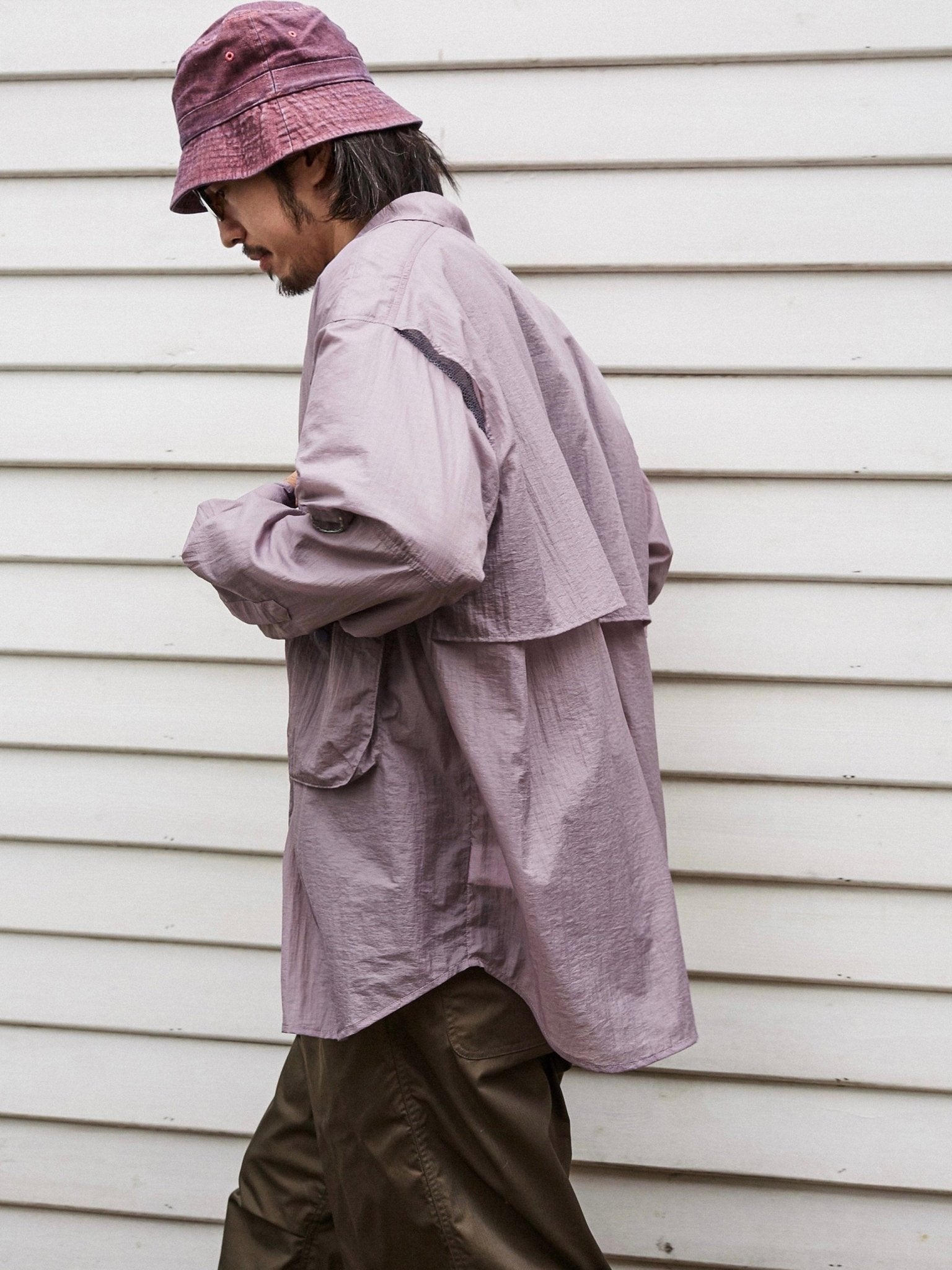 アウトドアのフィッシング用カバーを基にして、ゆったりとした微垂れ肩のシルエットが日常の着用に便利です。
