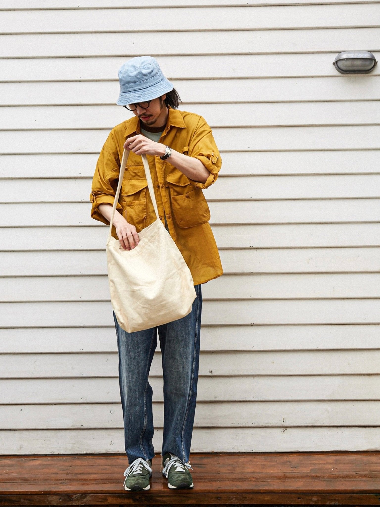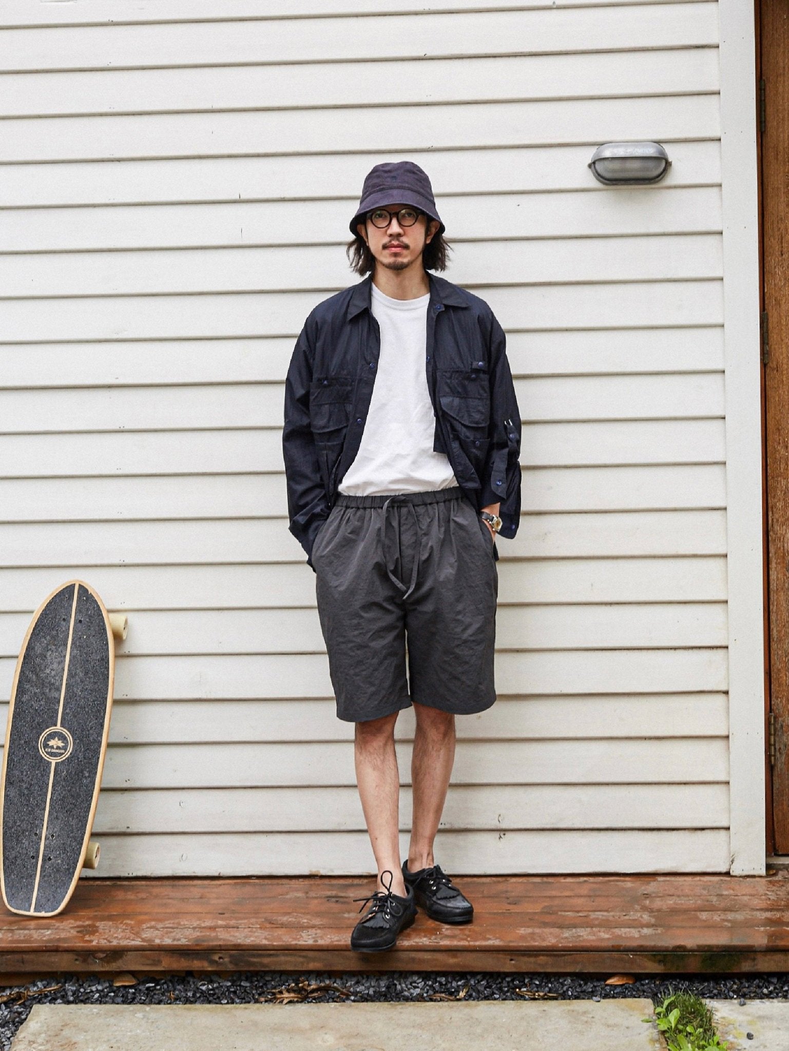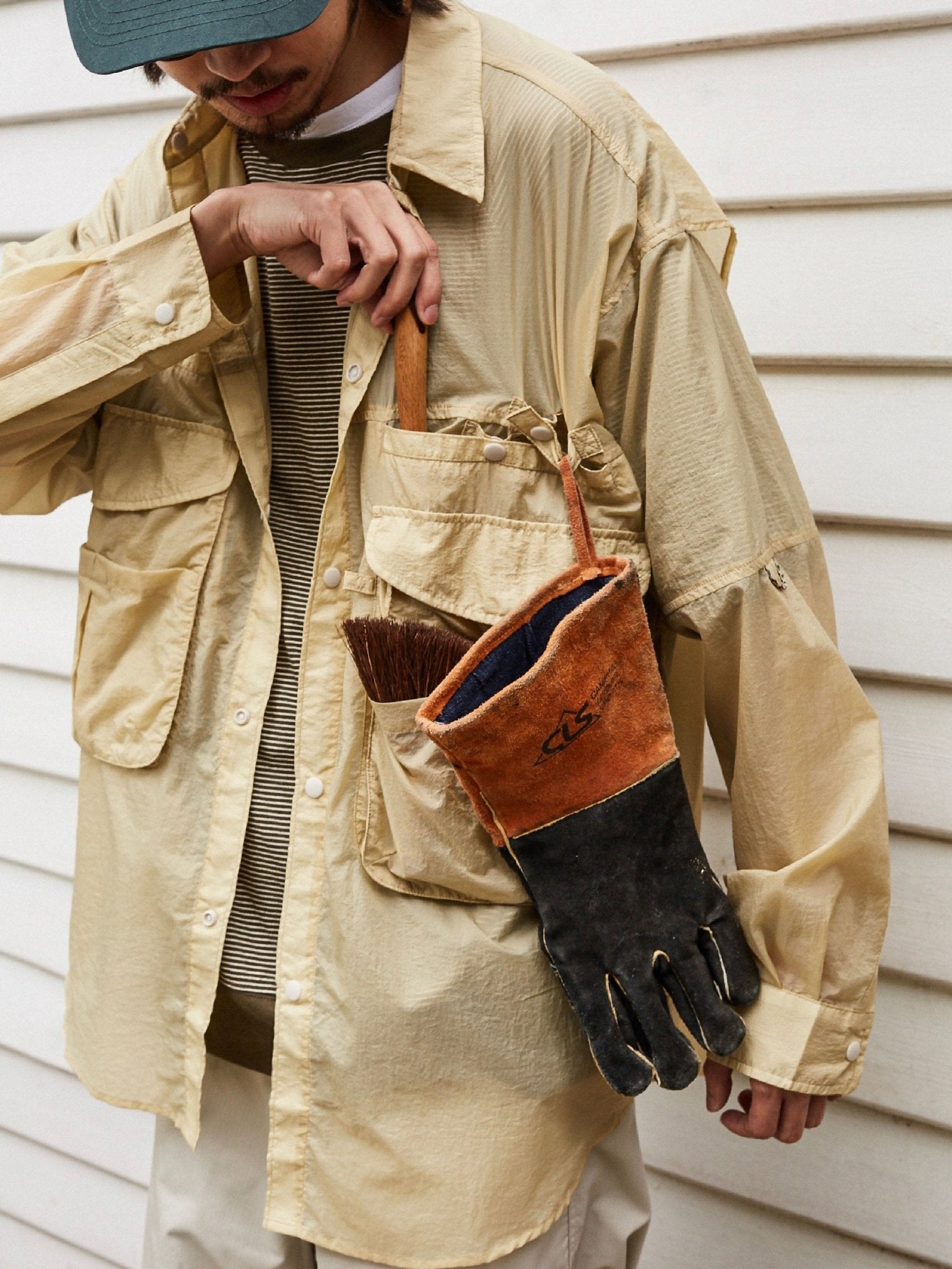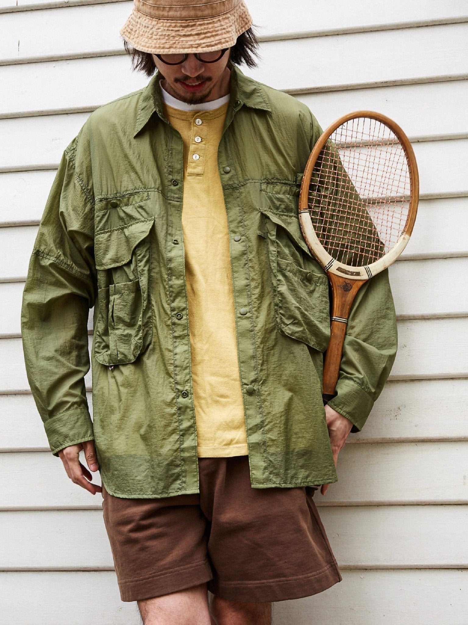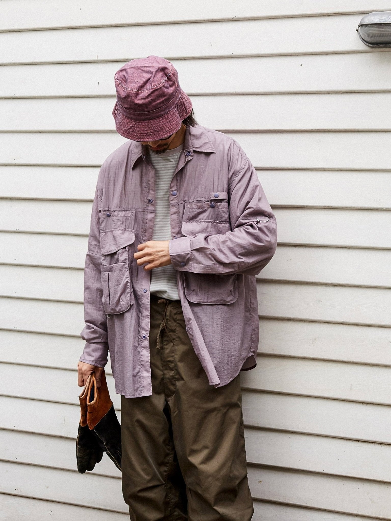 アウトドアのフィッシング用カバーを基にして、ゆったりとした微垂れ肩のシルエットが日常の着用に便利です。