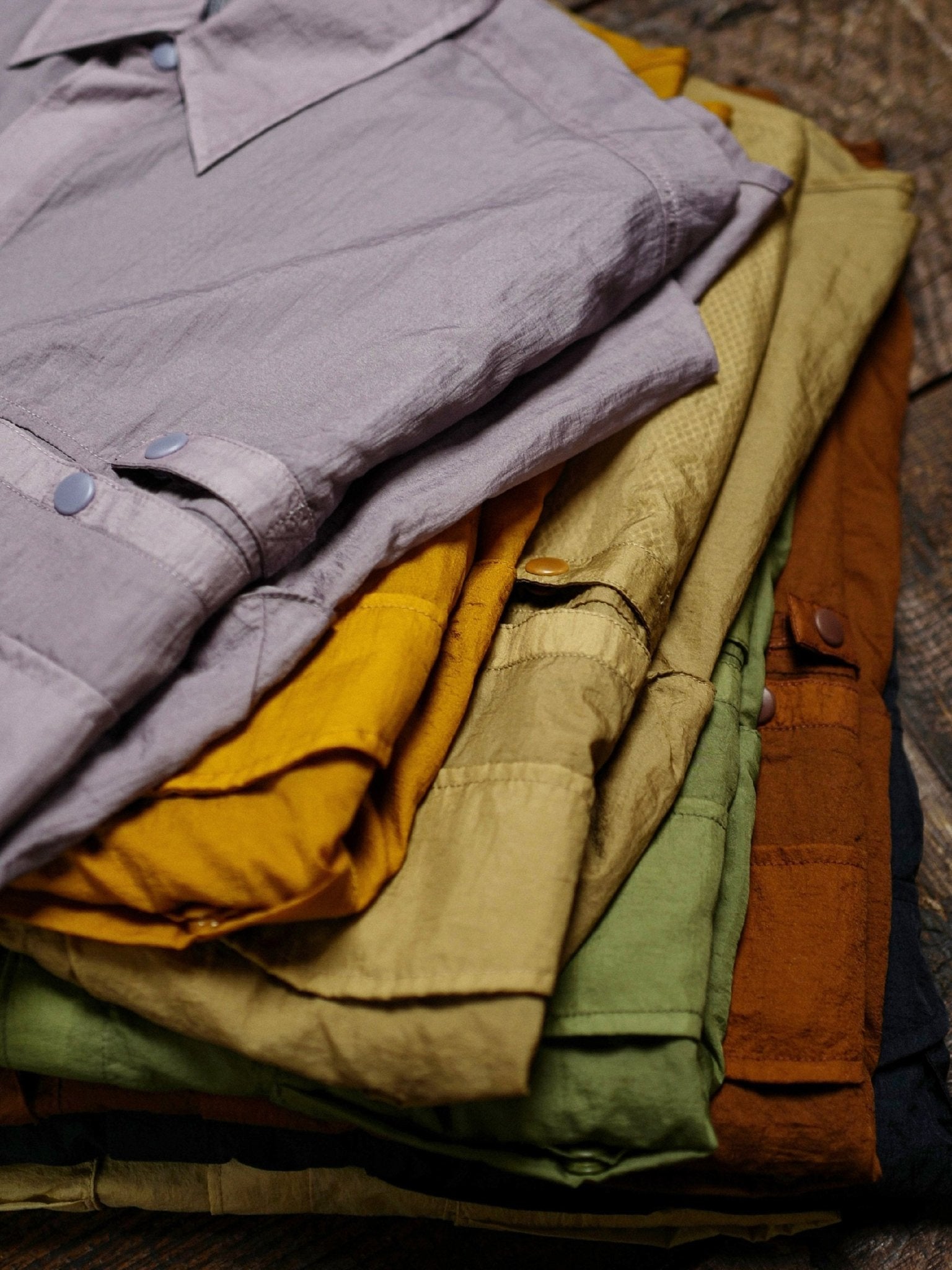 このアイテムは、20Dのナイロンを使用して、軽くて透け感のある柔らかさが特徴です。ウォッシュ加工により、生地の表面の凹凸感が際立ちます。素材は100%ナイロンですが、天然繊維の風合いも感じられ、太陽の光の下で蝉の羽のように軽やかで透明感があります。