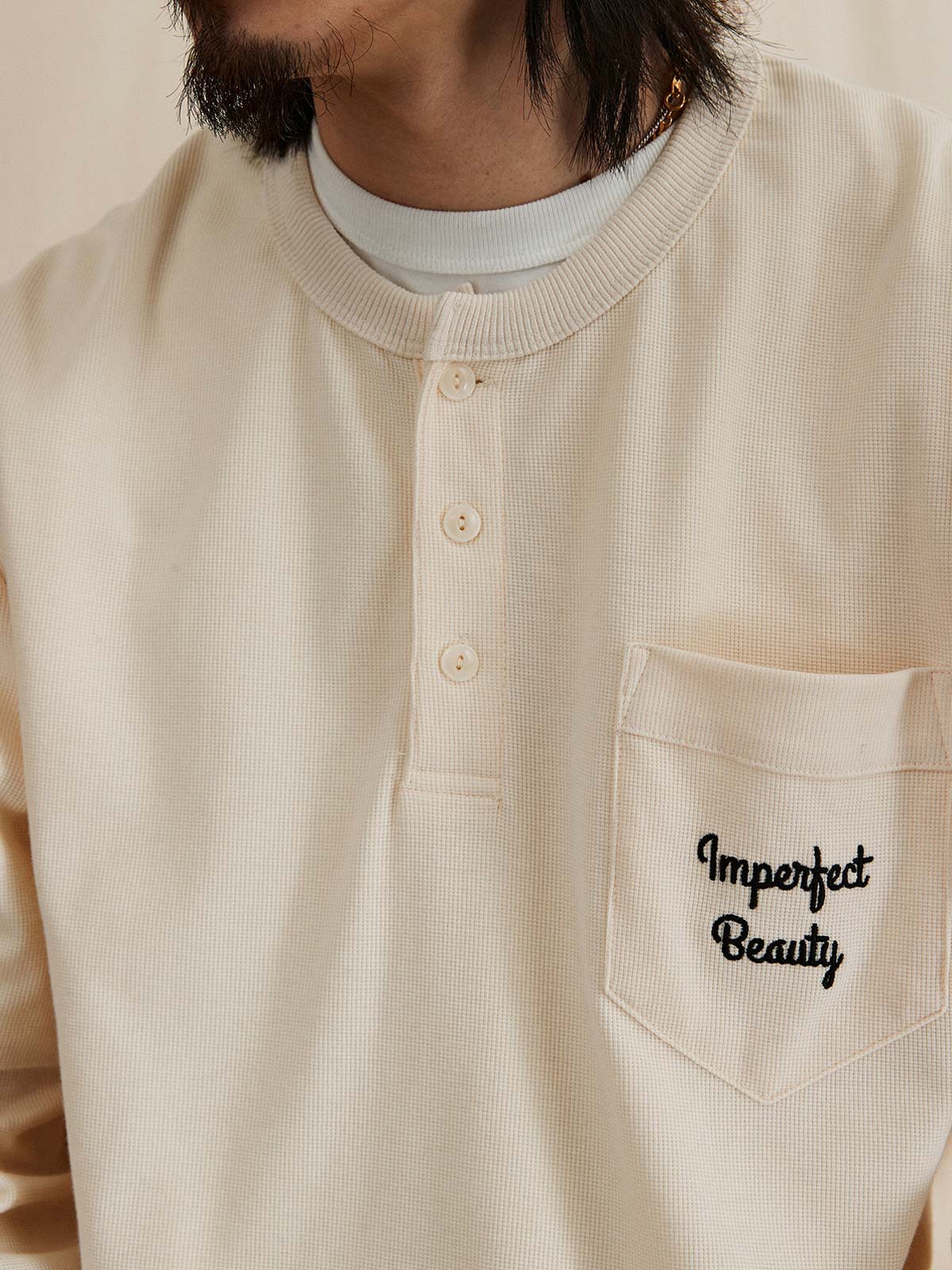 このヘンリーネック長袖Tシャツは、ワッフル生地を使用し、レトロなスタイルと現代の快適さを融合させた、スポーツとカジュアルの完璧な組み合わせ。