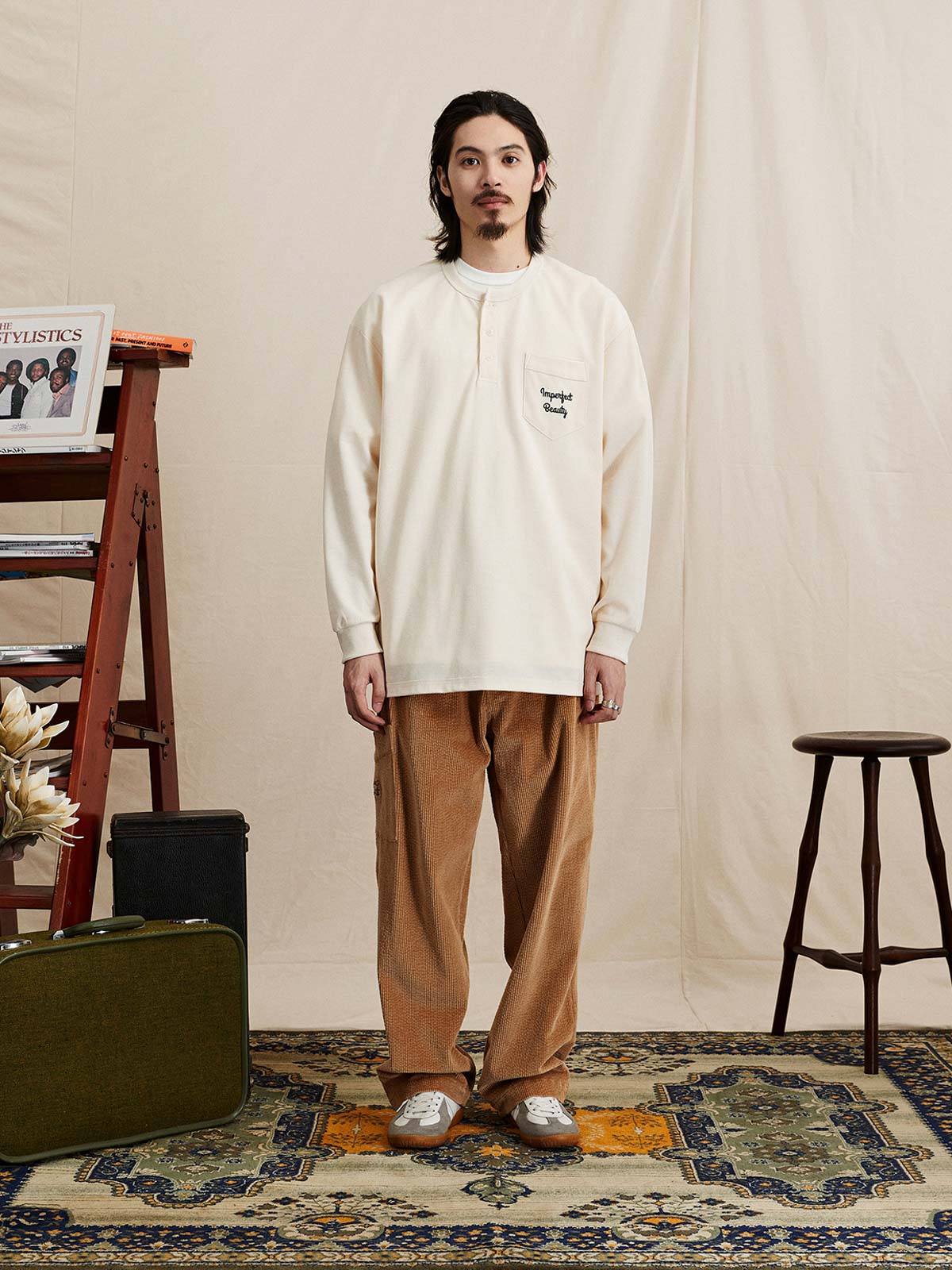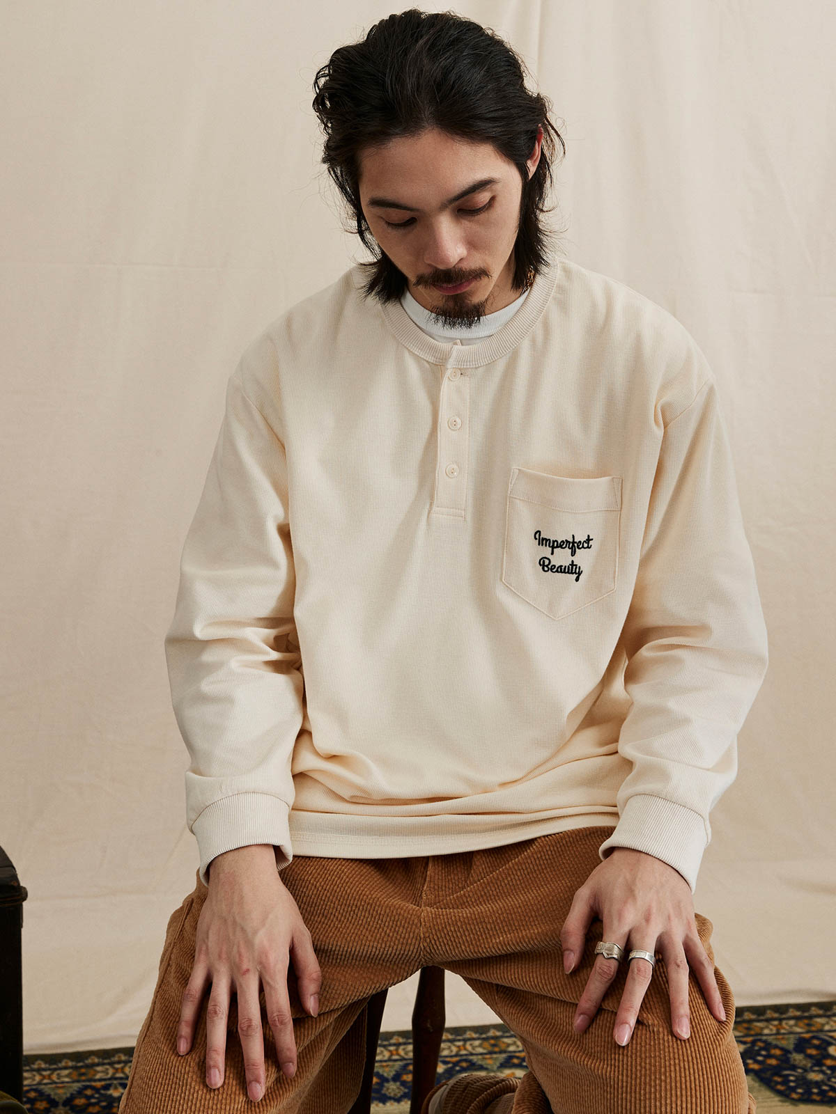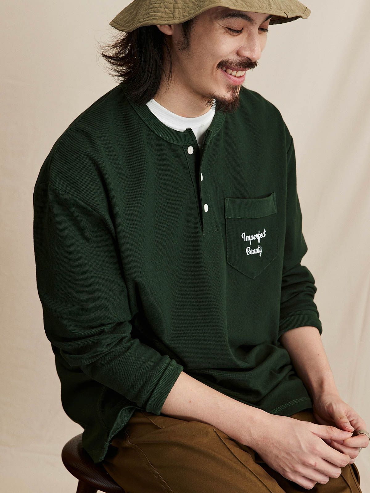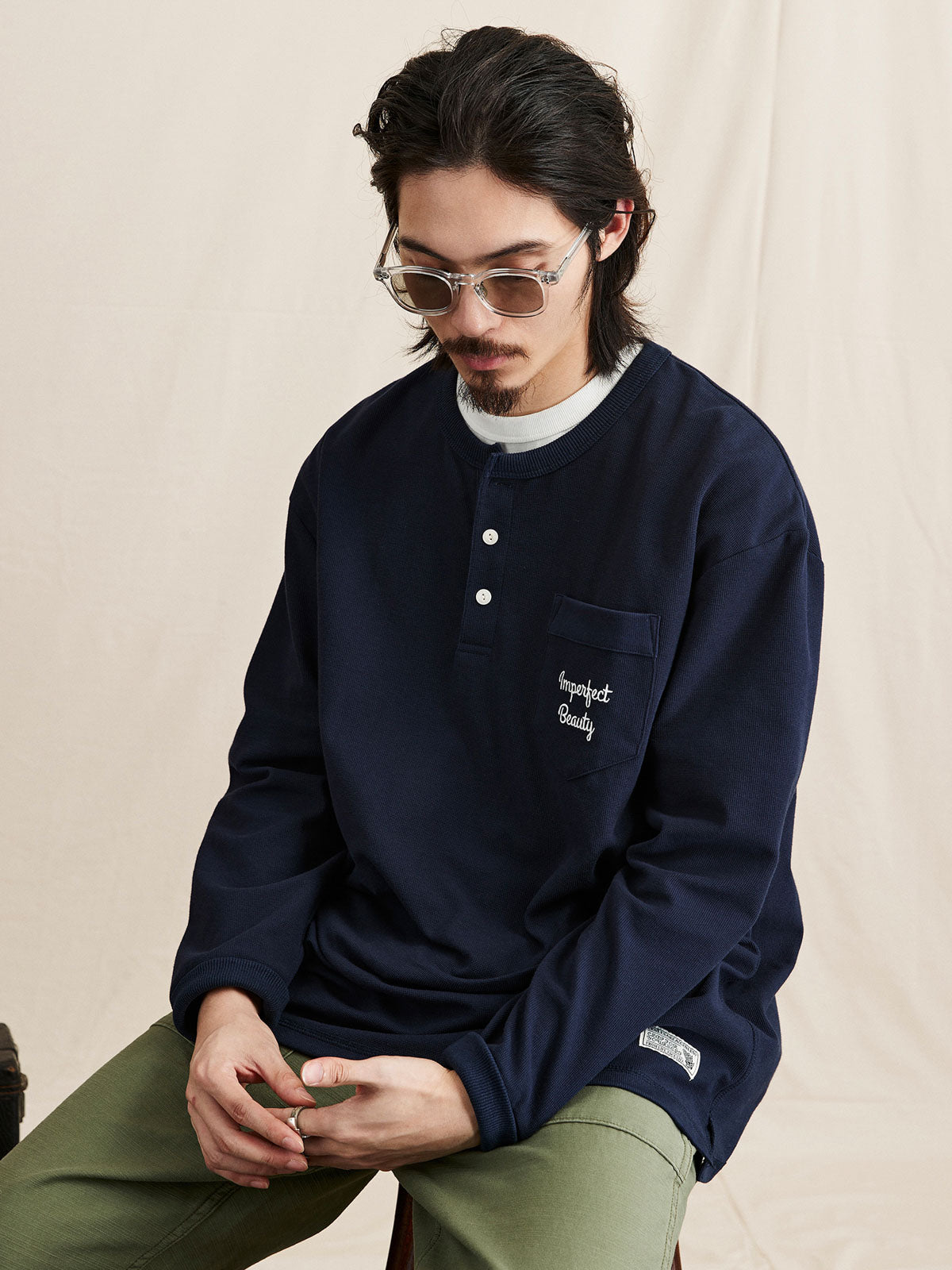 ヘンリーネックTシャツは、18世紀のボート競技から起源し、その襟なしデザインで首元の摩擦を軽減し、従来のポロシャツよりも涼しく快適です。半開きの襟デザインにより、着脱が簡単で通気性も向上し、インナーとしてもアウターとしても適しています。本Tシャツは230gのコットン混紡ワッフル生地を使用し、素材は41.3%コットン、53.4%ポリエステル、5.3%ポリウレタンで構成されています。細かい格子模様のテクスチャーが強く、ルーズフィットのシルエットが快適で通気性を提供します。サイドシームと裾の縫製にはハッスルステッチを採用し、視覚的および触感的に独特の魅力を演出しています。裾のスリットデザインとドロップショルダーのシルエットが自然でリラックスした着用感を提供し、レトロなスタイルを強調しています。胸ポケットのデザインはテクスチャーを巧みに分け、ユニークなデザイン感を増しています。このTシャツは、アイボリー、ネイビー、ダークグリーンの3つのクラシックな色合いで展開され、様々なコーディネートに適しており、秋冬の季節に多彩なレトロな風情を加えます。