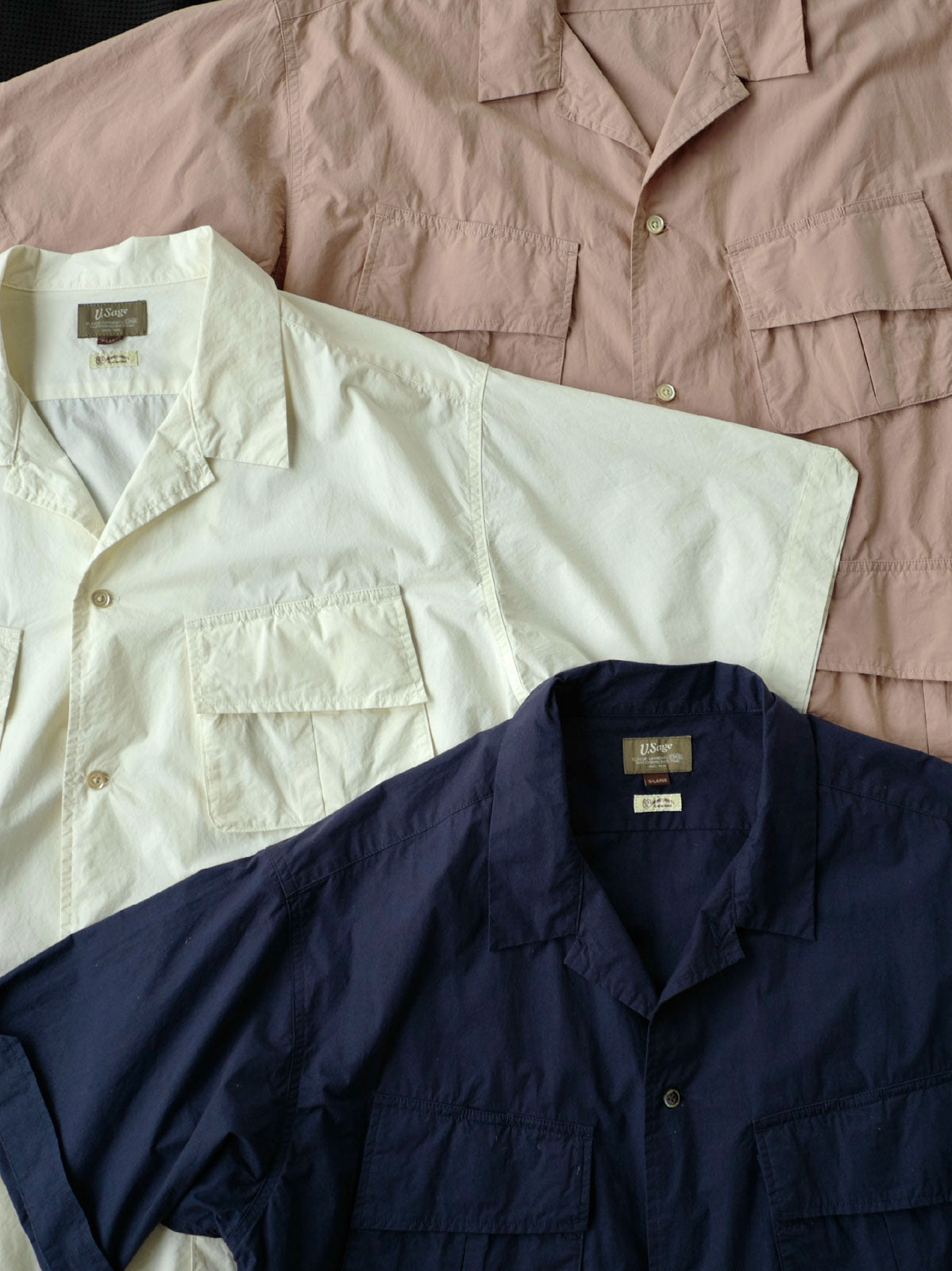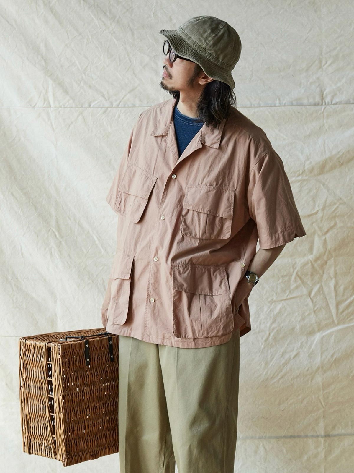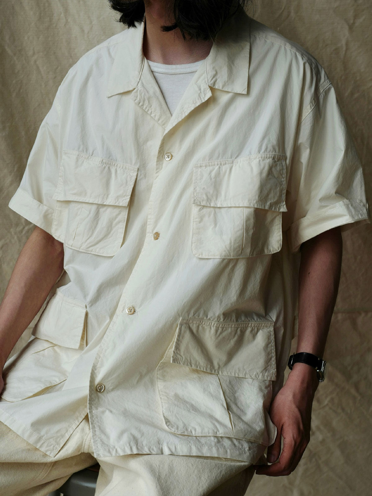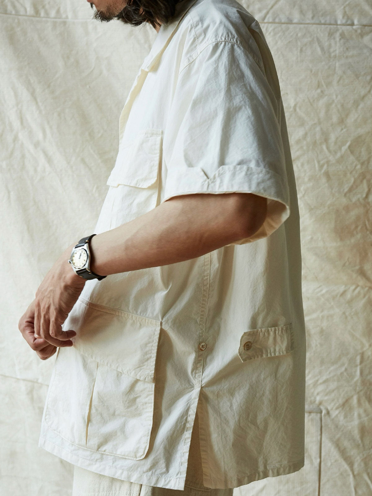 この半袖シャツは、クラシックなファティーグジャケットデザインとモダンな高支綿素材を融合し、優雅さと実用性を兼ね備えた夏の着用体験を提供する。