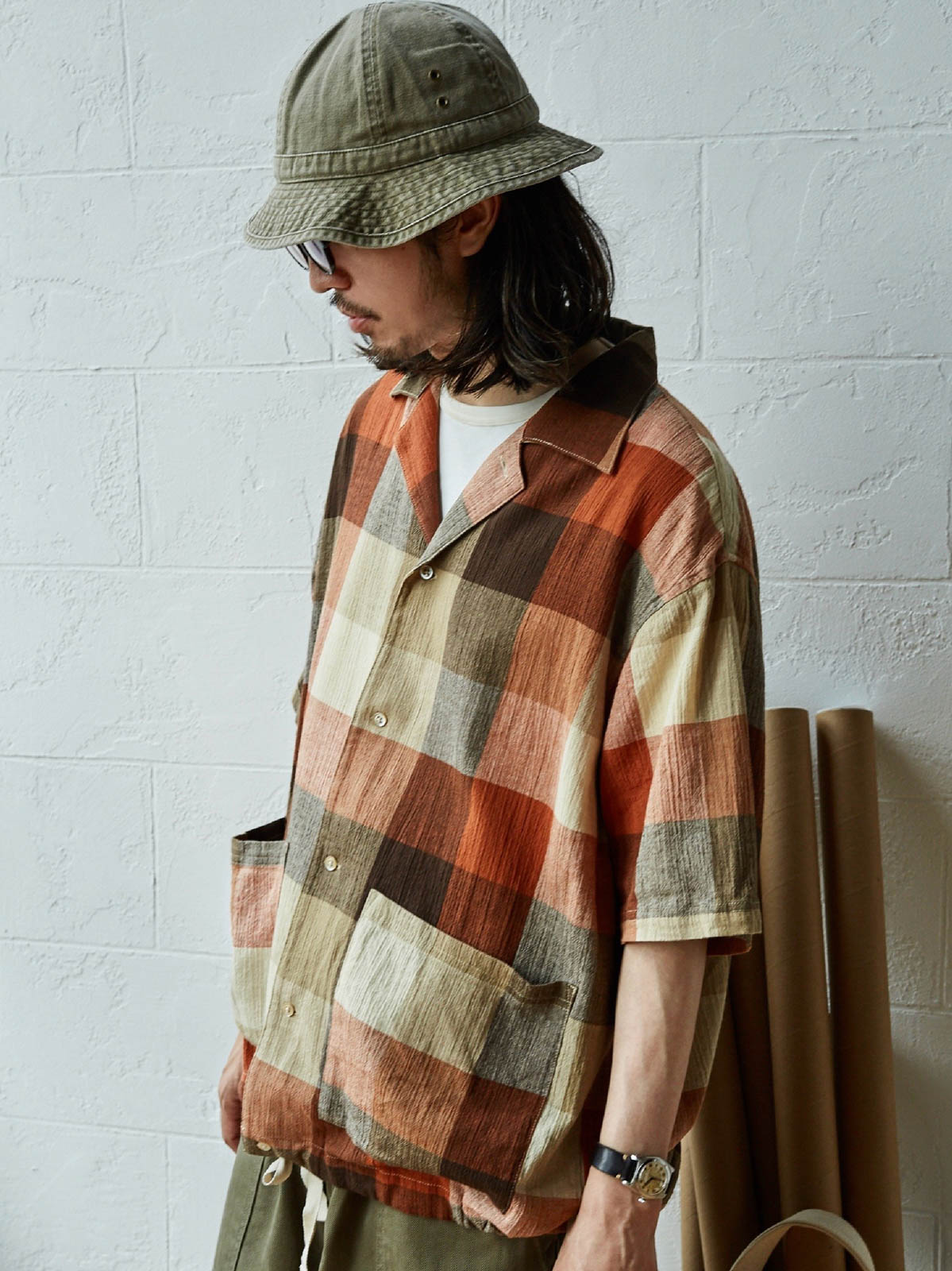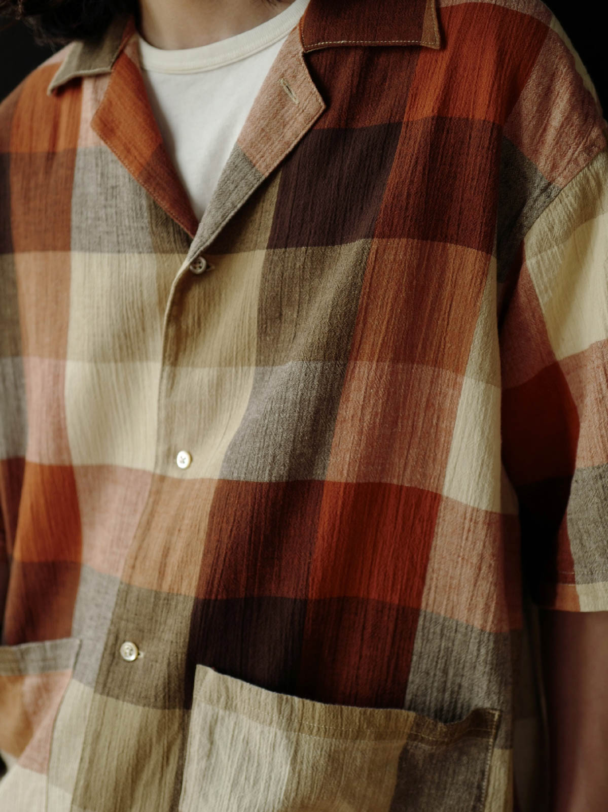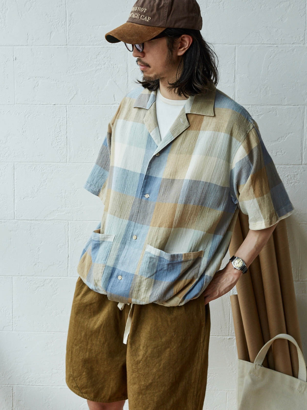 この半袖シャツは、Camp Collar Shirt(オープンカラーシャツ)というクラシックなデザインを基に、70%リネンと30%コットンの混紡素材を使用しており、通気性と快適性を確保しています。ユニークなキューバカラーのデザインは19世紀のフィリピンとキューバに由来し、現代のキューバシャツの原型です。ゆったりとしたシルエットと広いアームホールがシャツにリラックスしたカジュアルな雰囲気を与えます。低彩度の暗いオレンジと淡いブルーのチェックデザインは、明るさとヴィンテージ感のある落ち着きを兼ね備え、特に夏の着用に最適です。シャツは砂洗いと立体乾燥の後加工で、布地に微妙な自然なシワが加わり、立体感と懐かしさが増しています。2つの四角い大きなポケットとカスタムシェルボタンのフロント、裾のドローストリングデザインが実用性とスタイルの多様性を高め、クラシックとモダンを完璧に組み合わせたファッショナブルなアイテムです。
