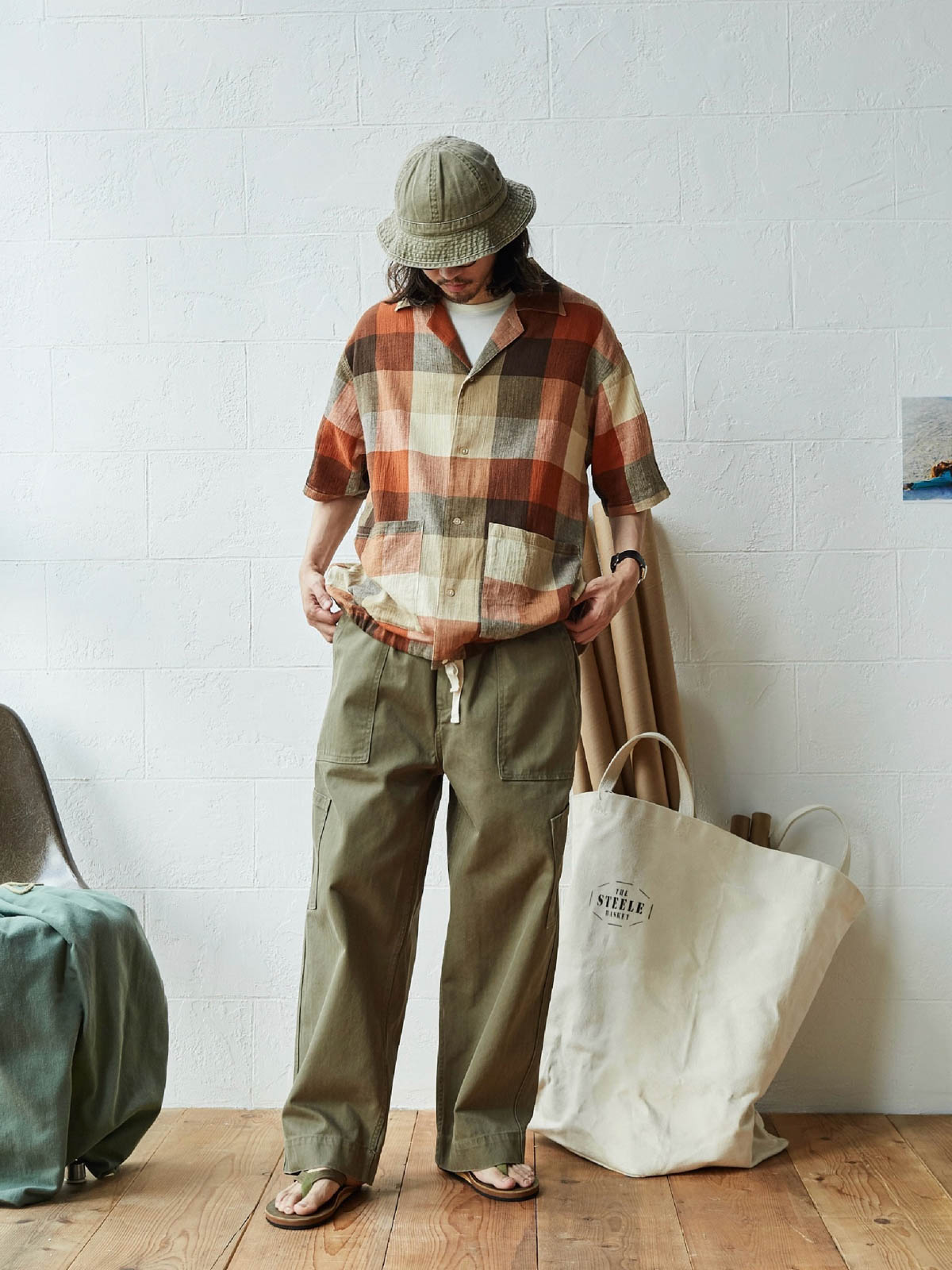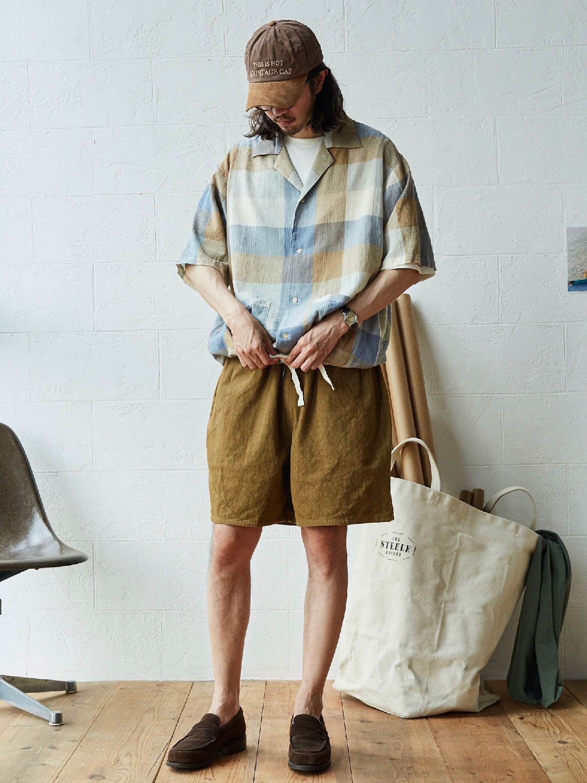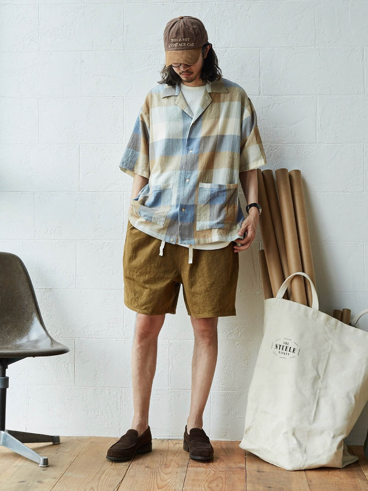 この半袖シャツは、Camp Collar Shirt(オープンカラーシャツ)というクラシックなデザインを基に、70%リネンと30%コットンの混紡素材を使用しており、通気性と快適性を確保しています。ユニークなキューバカラーのデザインは19世紀のフィリピンとキューバに由来し、現代のキューバシャツの原型です。ゆったりとしたシルエットと広いアームホールがシャツにリラックスしたカジュアルな雰囲気を与えます。低彩度の暗いオレンジと淡いブルーのチェックデザインは、明るさとヴィンテージ感のある落ち着きを兼ね備え、特に夏の着用に最適です。シャツは砂洗いと立体乾燥の後加工で、布地に微妙な自然なシワが加わり、立体感と懐かしさが増しています。2つの四角い大きなポケットとカスタムシェルボタンのフロント、裾のドローストリングデザインが実用性とスタイルの多様性を高め、クラシックとモダンを完璧に組み合わせたファッショナブルなアイテムです。