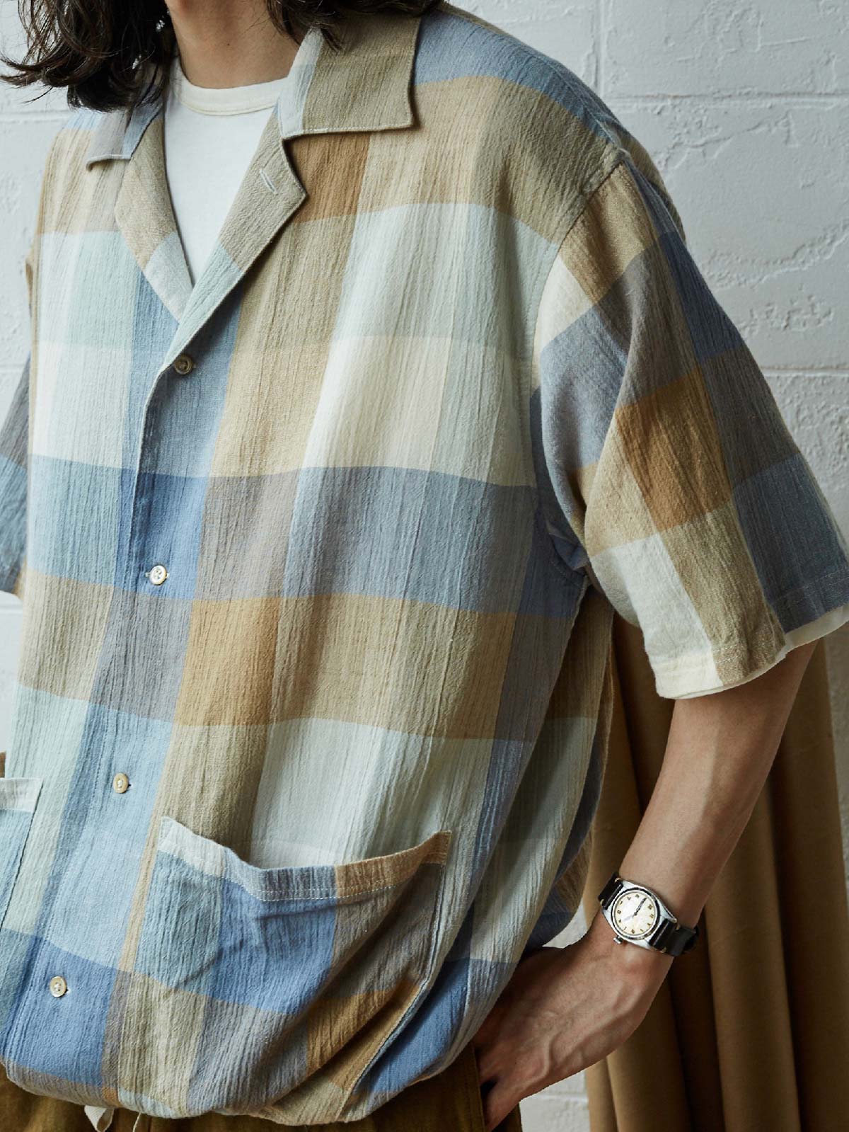 このリネンチェックオープンカラーシャツは、クラシックなキューバカラーと現代的な素材を組み合わせ、夏に快適で通気性の良いヴィンテージスタイルを提供する。