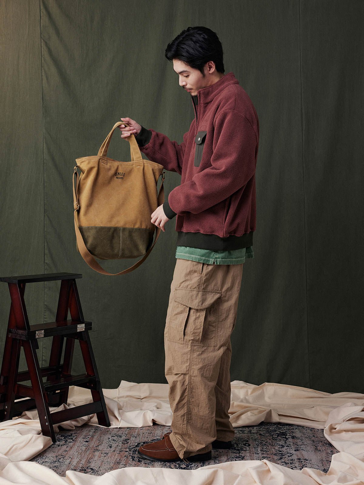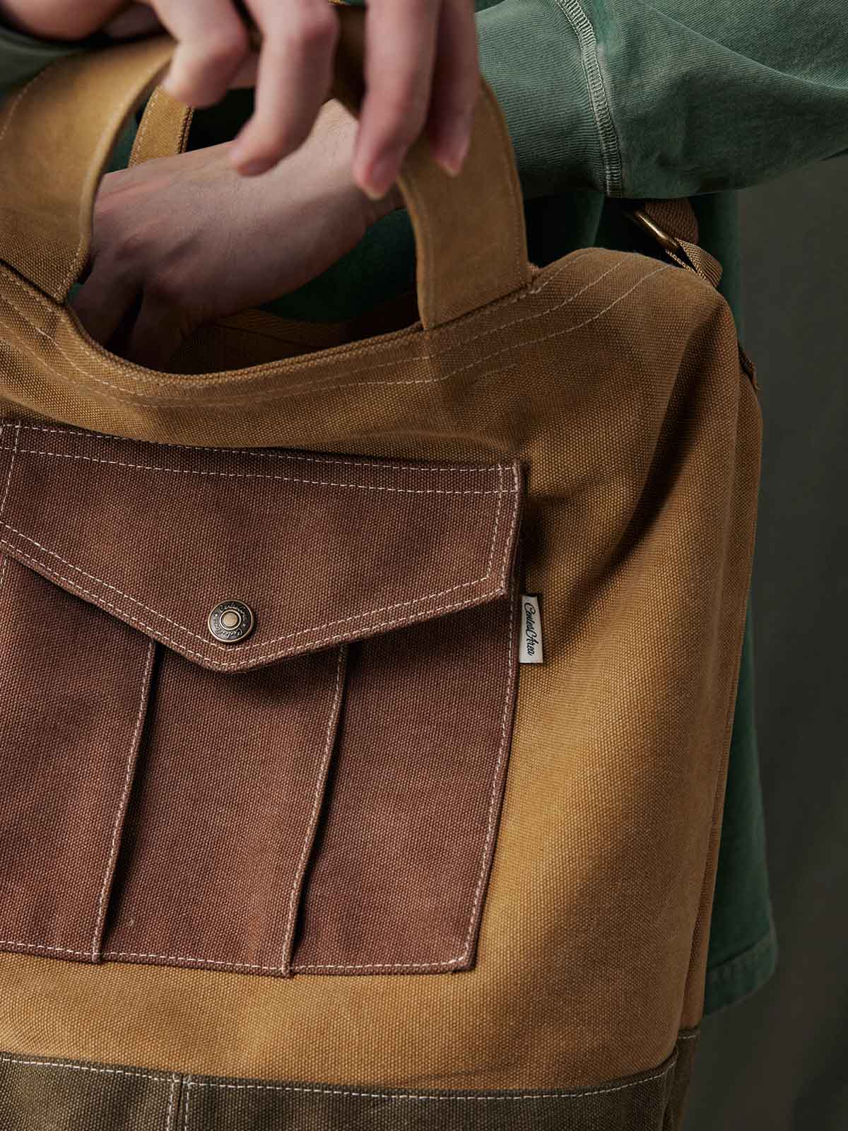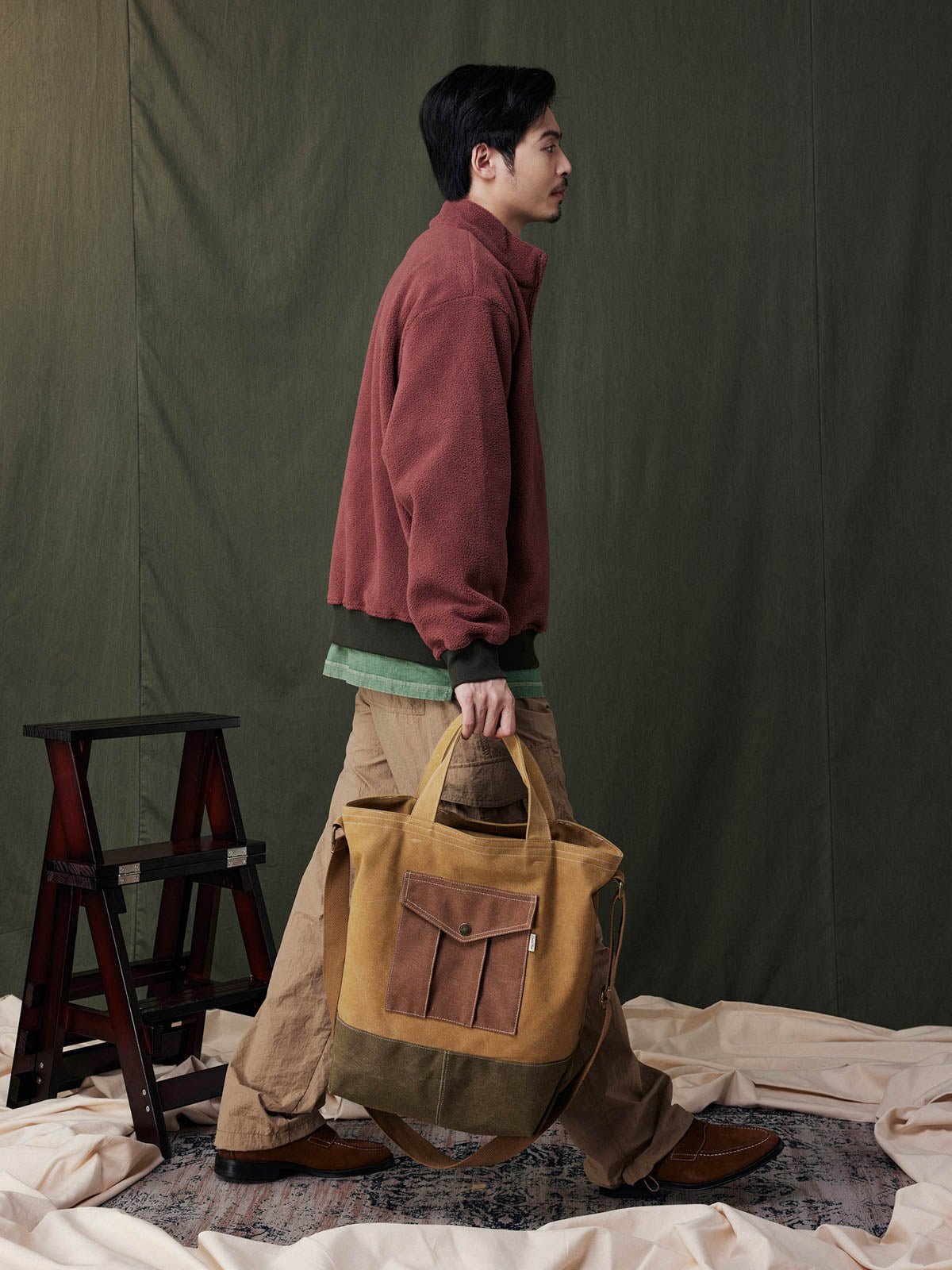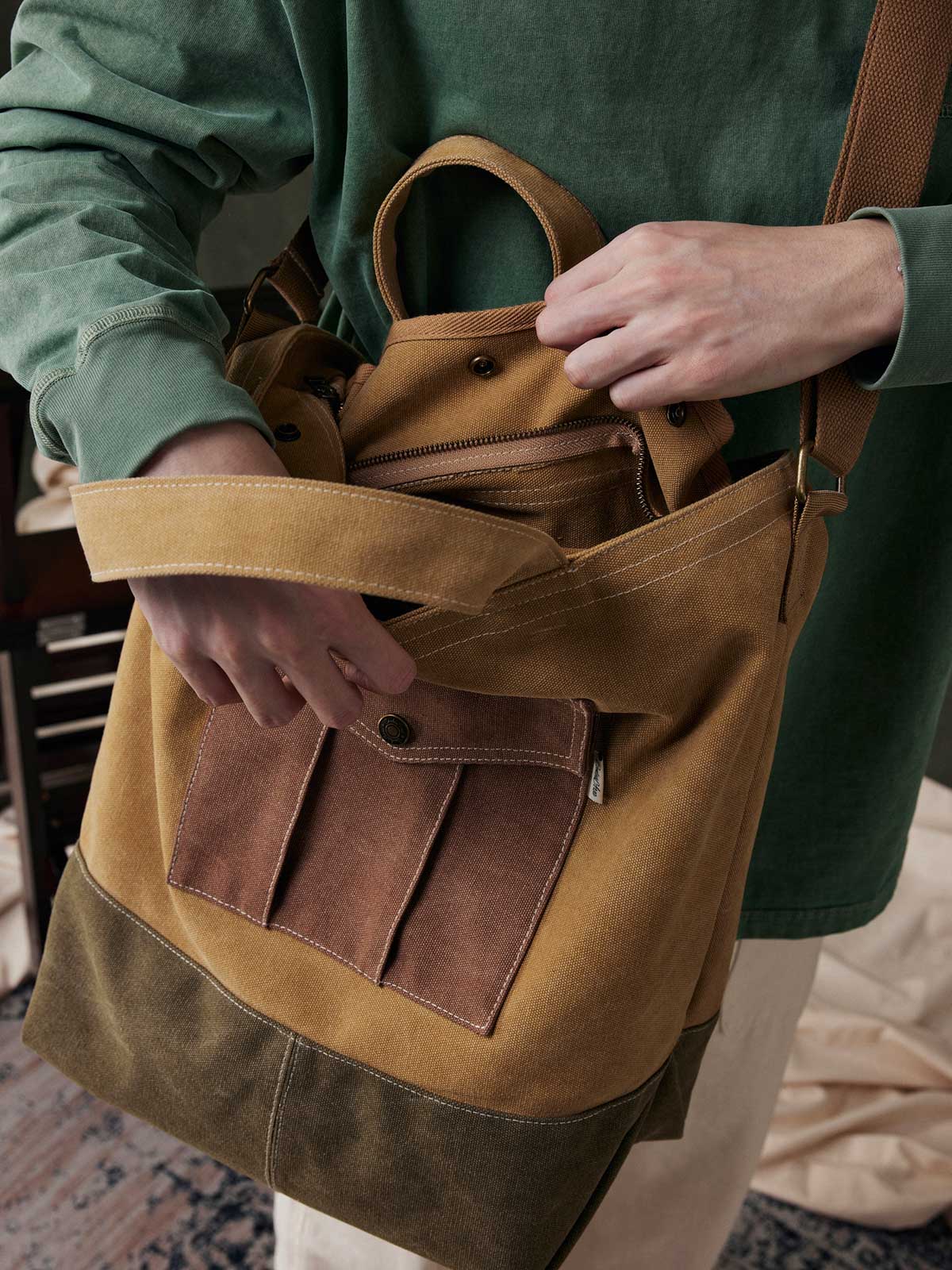 高品質のウォッシュドキャンバスを使用し、精密な縫製技術を組み合わせることで耐久性が向上しています。時間の経過と共に表れる摩耗はバッグにユニークな個性をもたらします。カラーブロックのポケットデザインは、ファッション性と実用性を両立させています。
