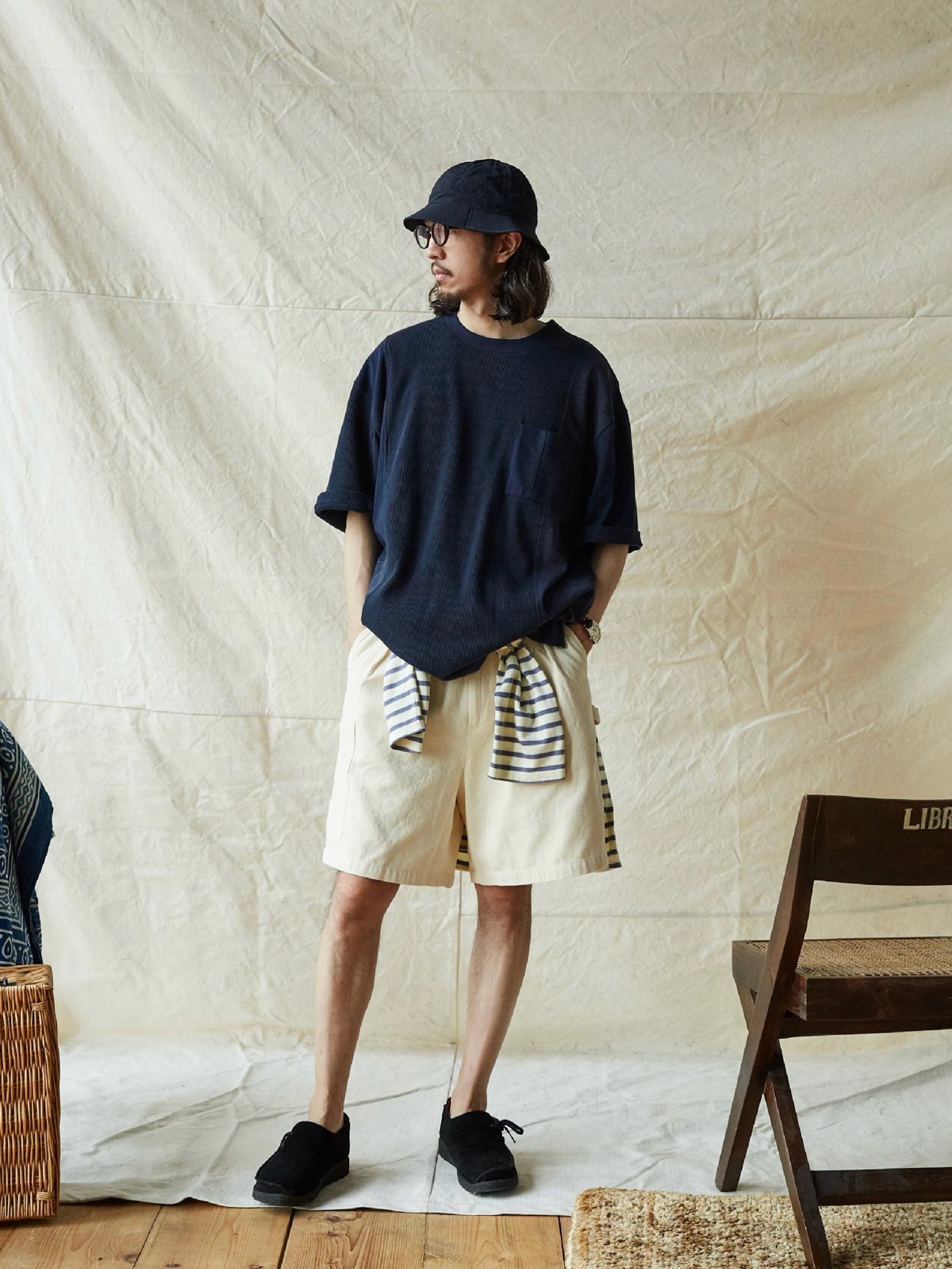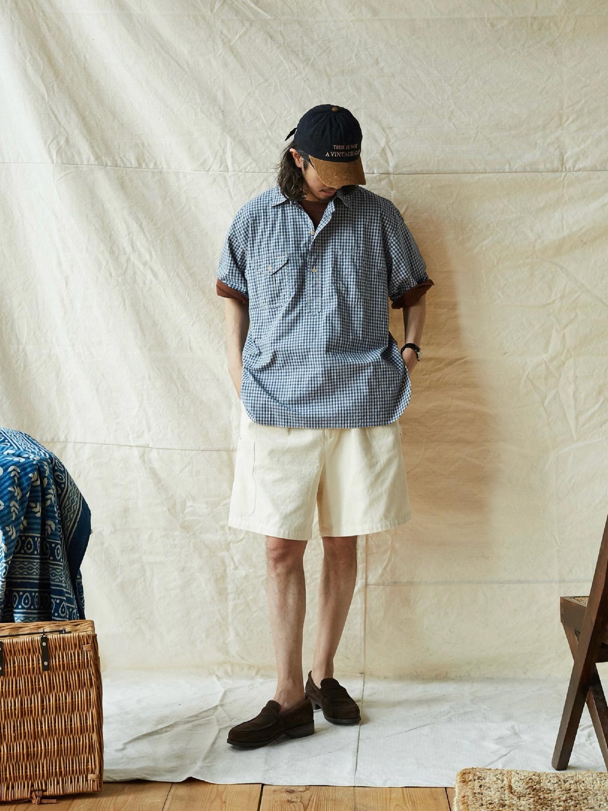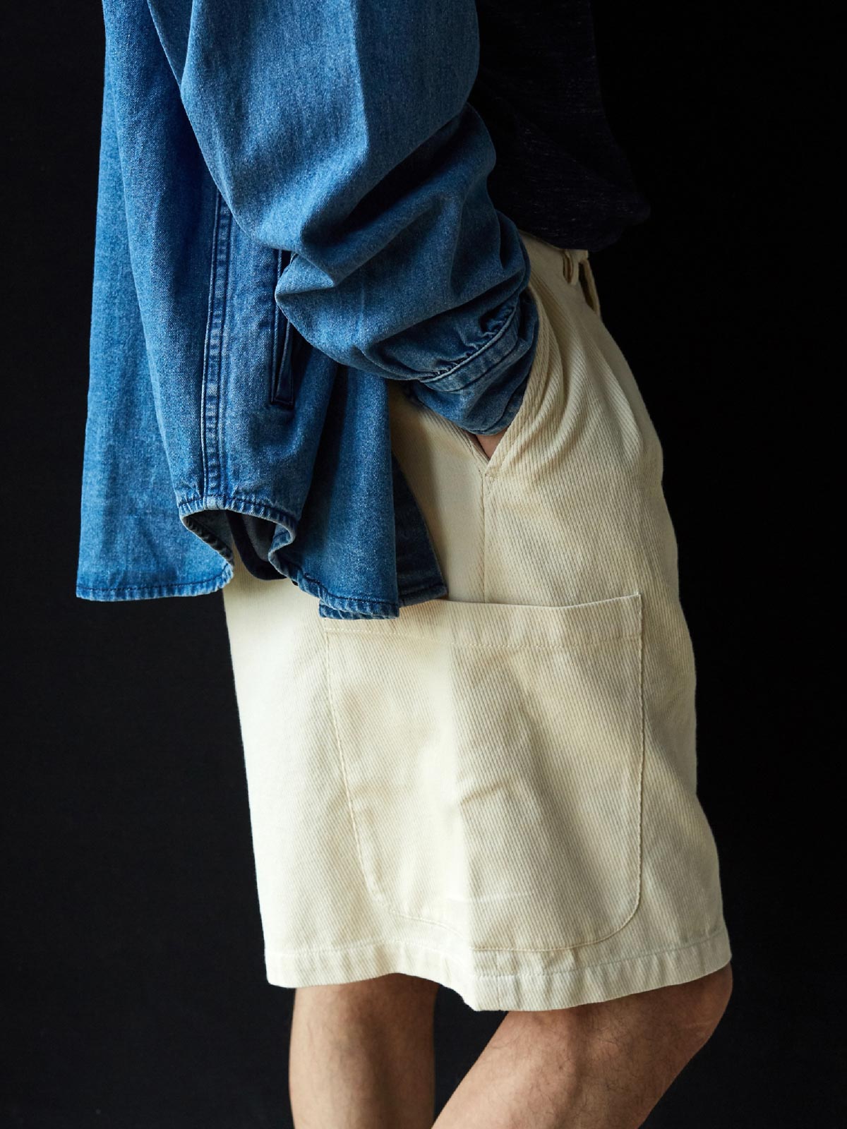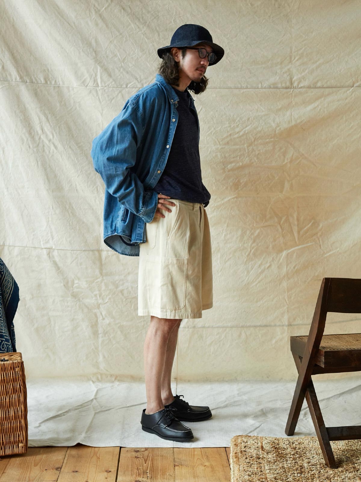 このショーツは、1920年代のクラシックなペインターパンツからインスピレーションを得ており、多機能ポケットデザインは画家が様々なツールを収納するために作られました。320gのダブルツイル酵素洗いオールコットン生地を使用しており、細かく立体的な質感が特徴です。天然酵素洗い処理により、素材は柔らかく肌に優しく、夏に最適な快適な着用感を提供します。ミディアムレングスのカジュアルフィットカットは、クラシックなメンズウェアのダブルプリーツデザインとペインターパンツの象徴的なハンマーループディテールを取り入れています。ウエストの内側にはヴィンテージプリントが施され、全体のファッション性を高めています。オフホワイトとネイビーブルーの配色により、アメリカンヴィンテージのショーツに涼しげで実用的な一面が加わり、夏の必須アイテムとなっています。
