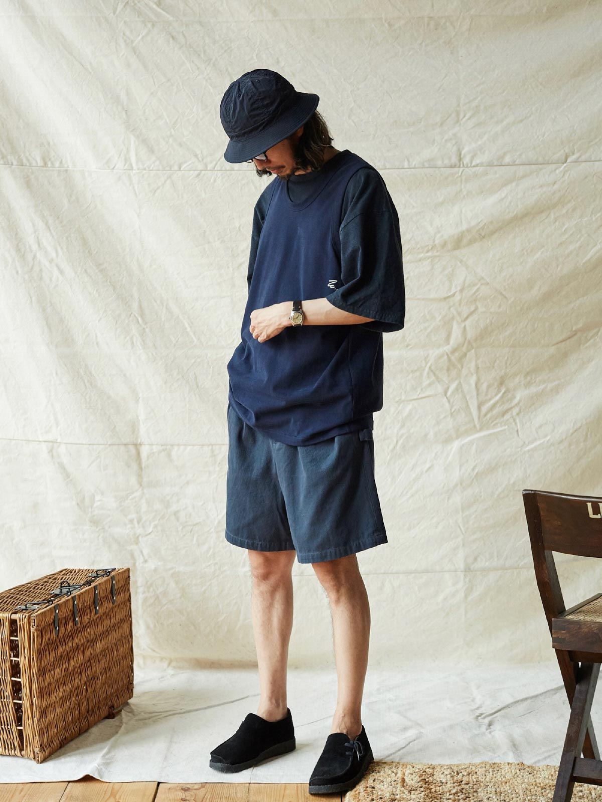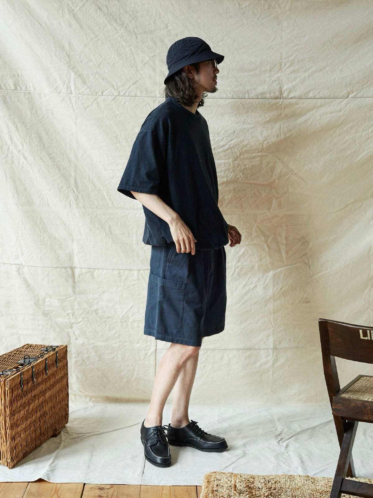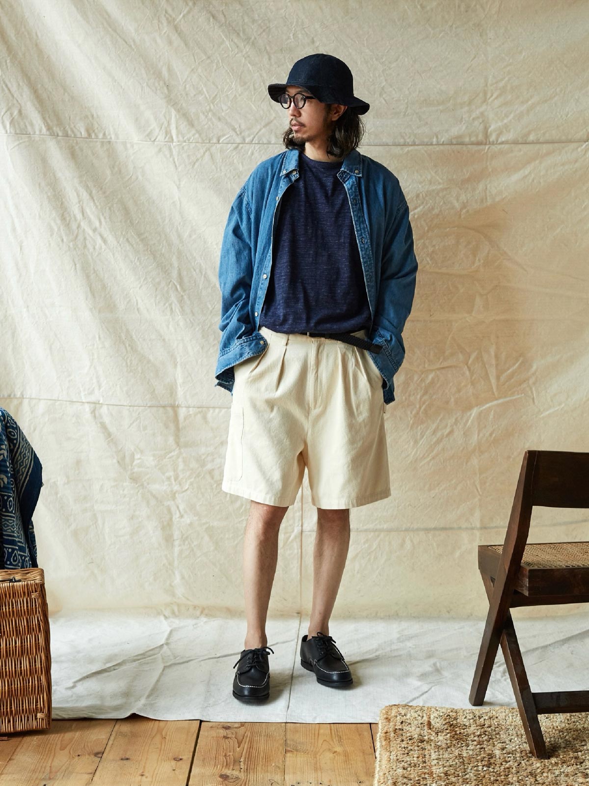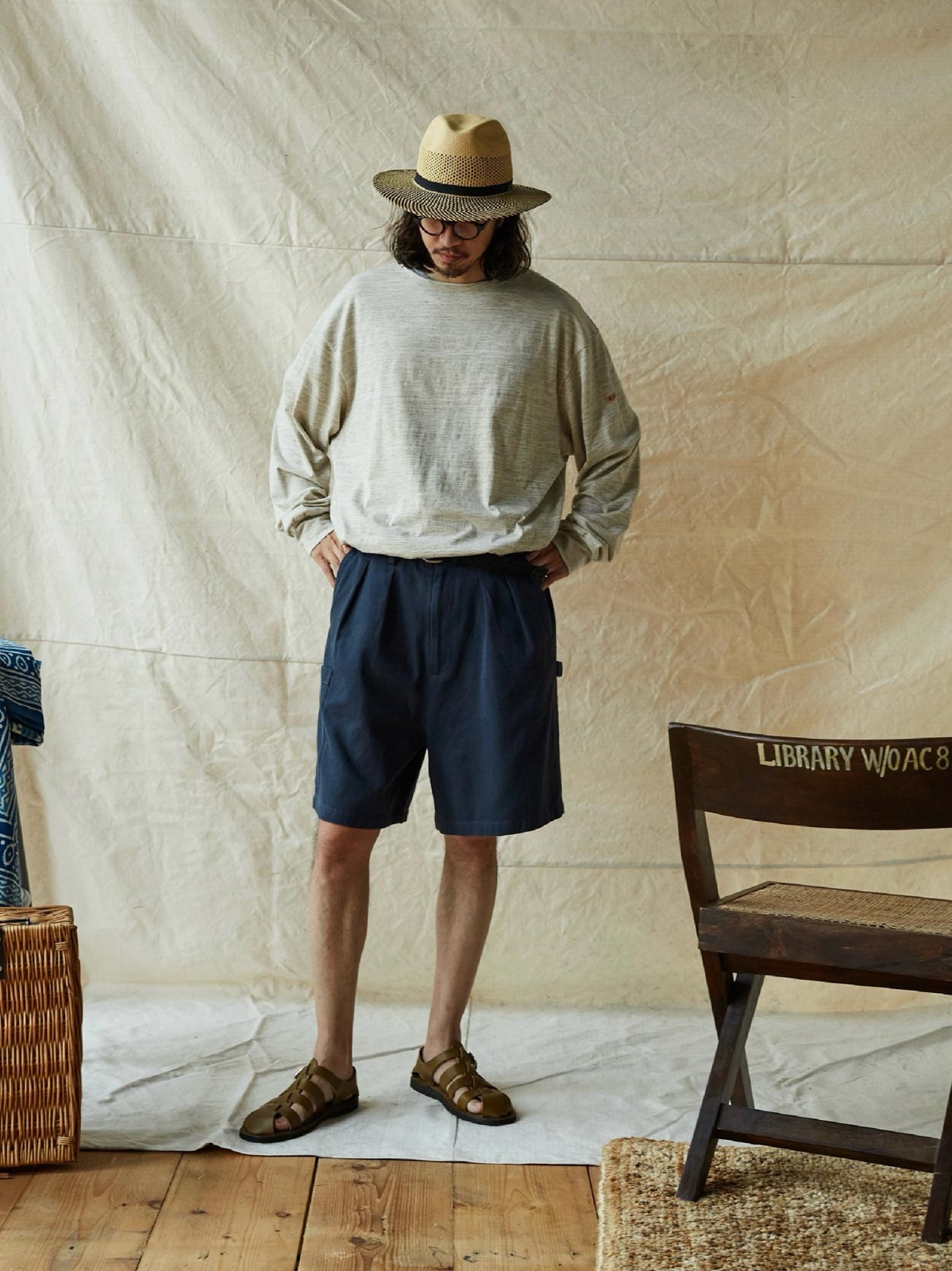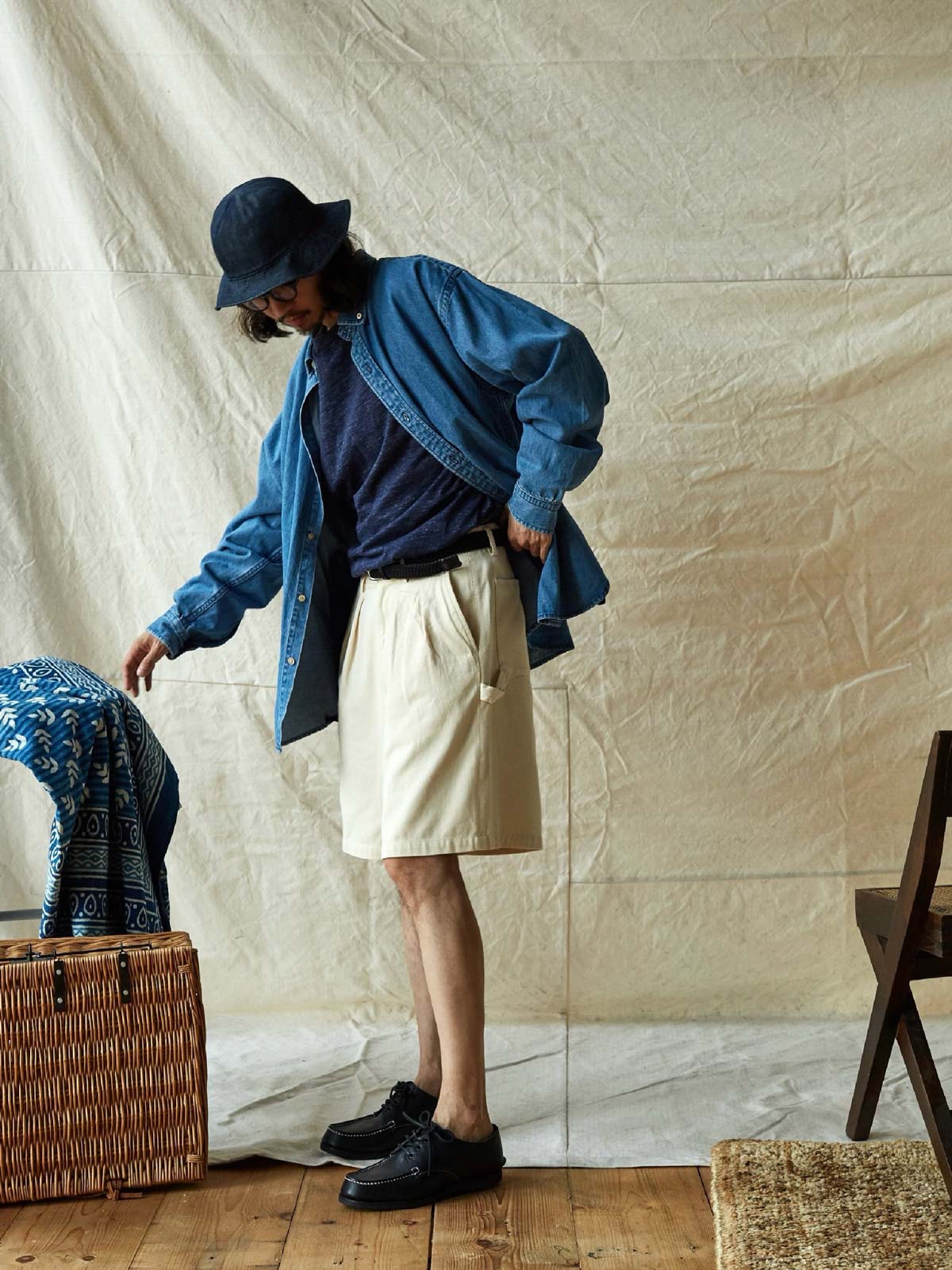 このショーツは、1920年代のクラシックなペインターパンツからインスピレーションを得ており、多機能ポケットデザインは画家が様々なツールを収納するために作られました。320gのダブルツイル酵素洗いオールコットン生地を使用しており、細かく立体的な質感が特徴です。天然酵素洗い処理により、素材は柔らかく肌に優しく、夏に最適な快適な着用感を提供します。ミディアムレングスのカジュアルフィットカットは、クラシックなメンズウェアのダブルプリーツデザインとペインターパンツの象徴的なハンマーループディテールを取り入れています。ウエストの内側にはヴィンテージプリントが施され、全体のファッション性を高めています。オフホワイトとネイビーブルーの配色により、アメリカンヴィンテージのショーツに涼しげで実用的な一面が加わり、夏の必須アイテムとなっています。
