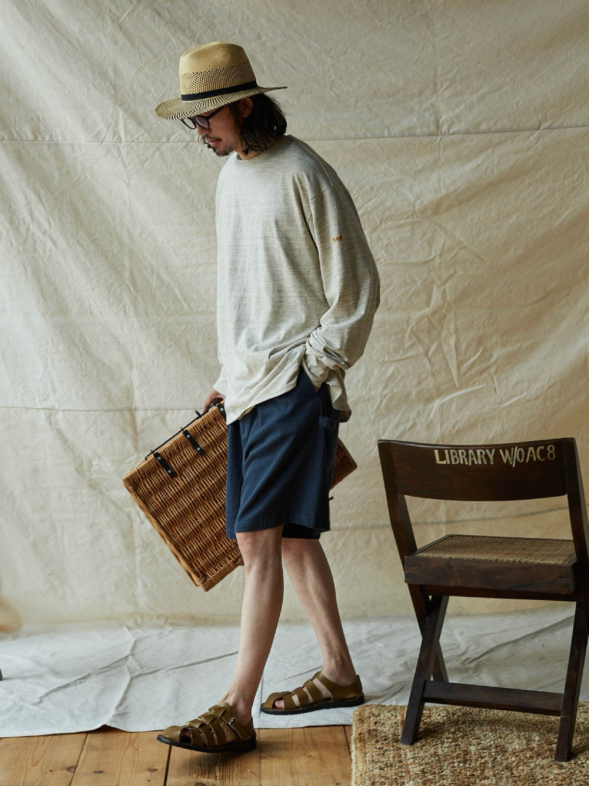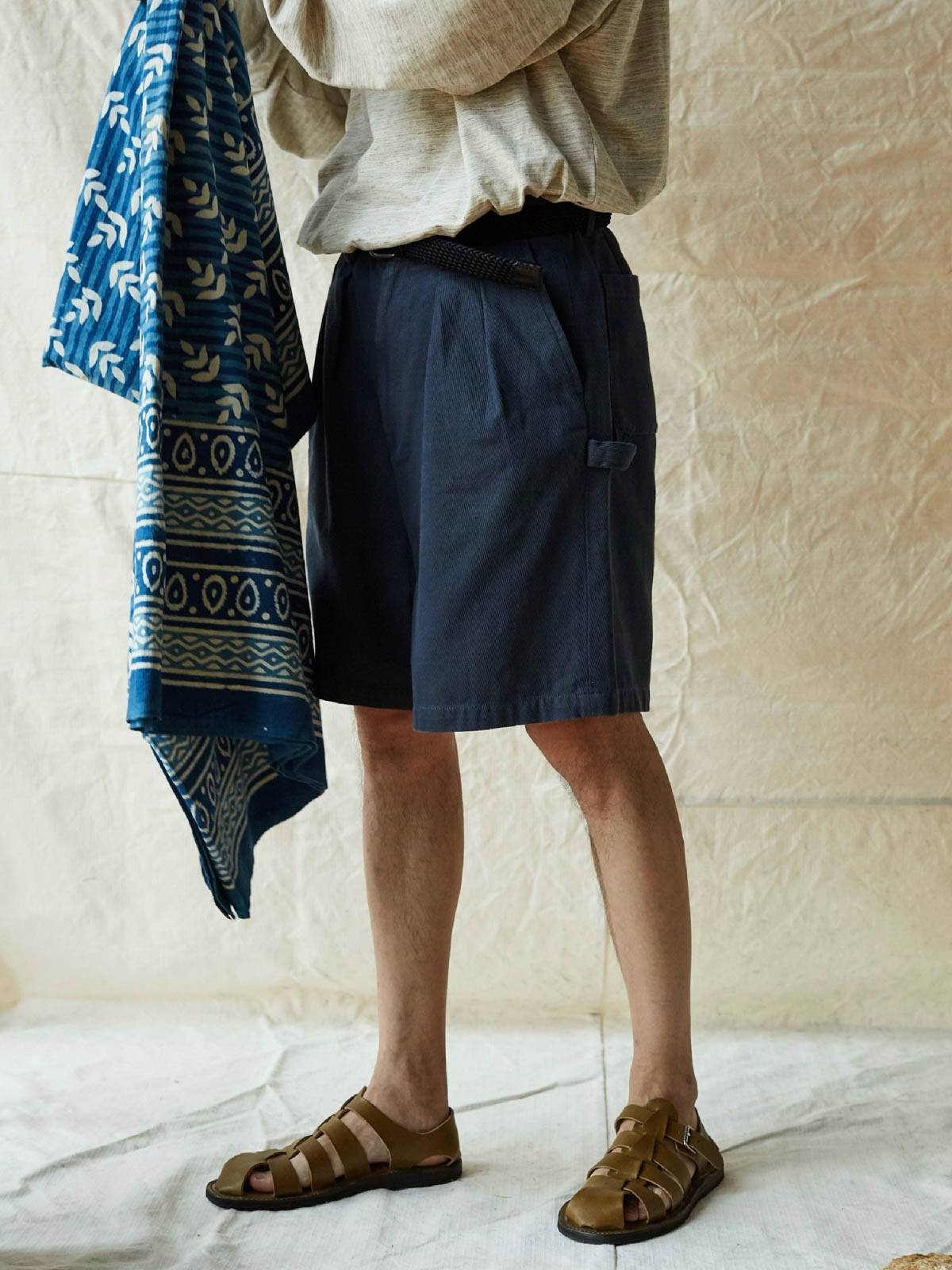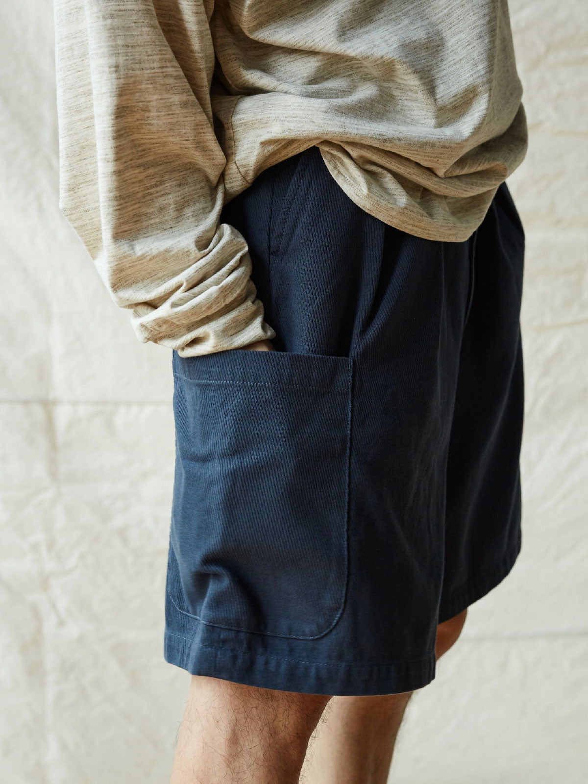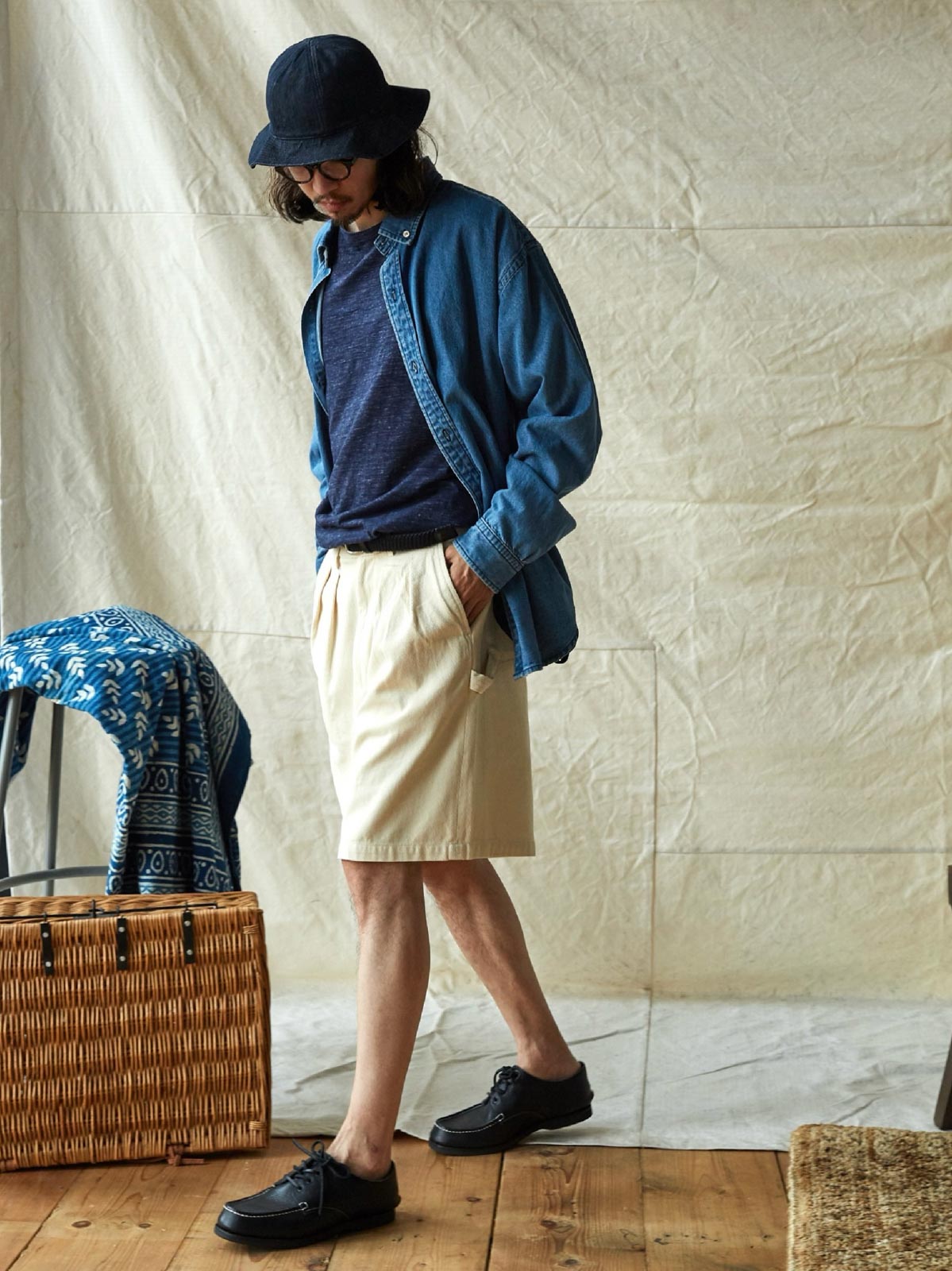 このショーツは、1920年代のクラシックなペインターパンツからインスピレーションを得ており、多機能ポケットデザインは画家が様々なツールを収納するために作られました。320gのダブルツイル酵素洗いオールコットン生地を使用しており、細かく立体的な質感が特徴です。天然酵素洗い処理により、素材は柔らかく肌に優しく、夏に最適な快適な着用感を提供します。ミディアムレングスのカジュアルフィットカットは、クラシックなメンズウェアのダブルプリーツデザインとペインターパンツの象徴的なハンマーループディテールを取り入れています。ウエストの内側にはヴィンテージプリントが施され、全体のファッション性を高めています。オフホワイトとネイビーブルーの配色により、アメリカンヴィンテージのショーツに涼しげで実用的な一面が加わり、夏の必須アイテムとなっています。