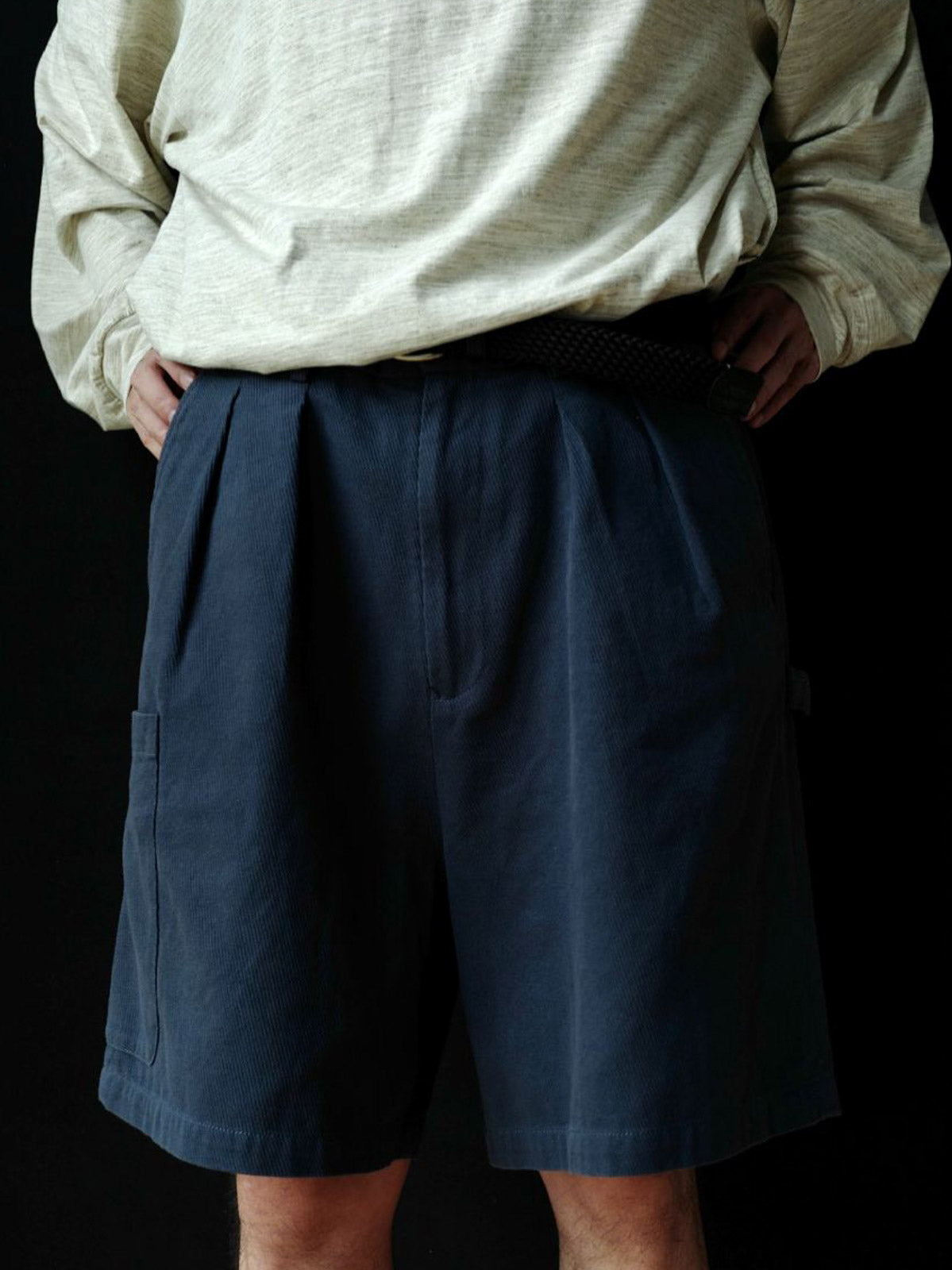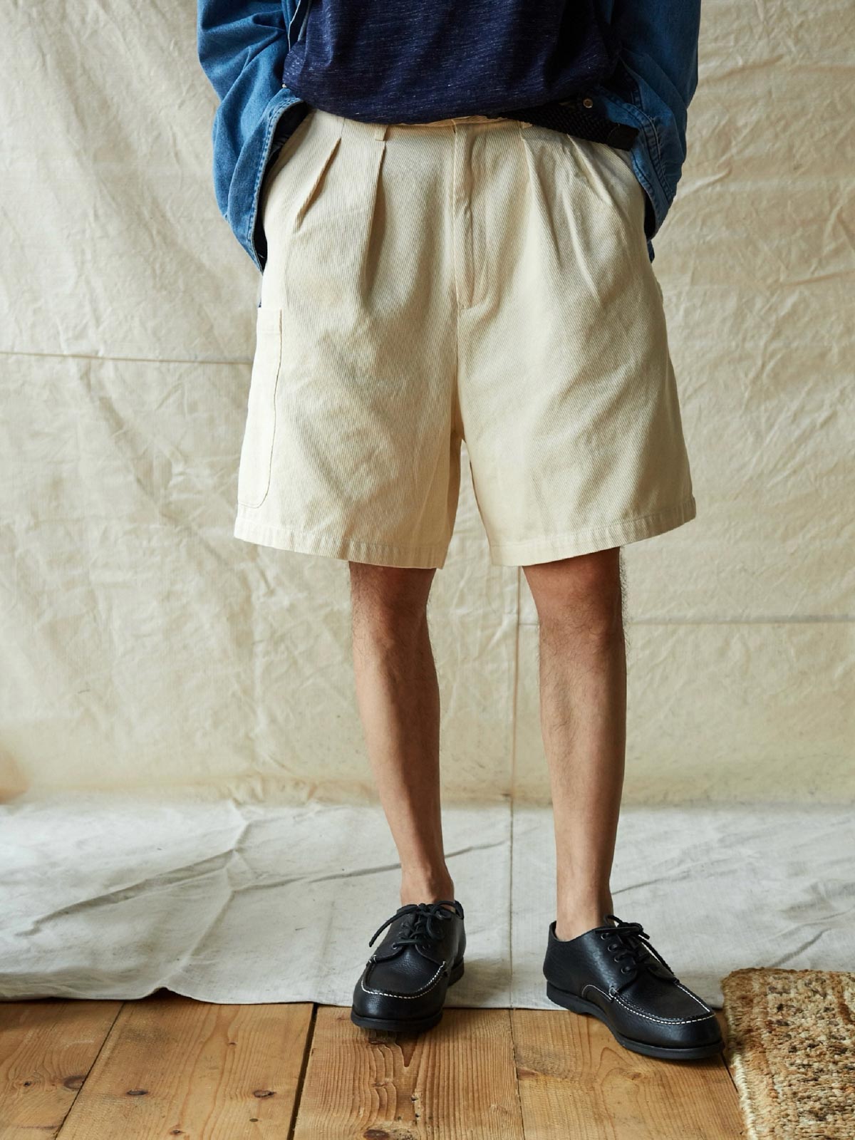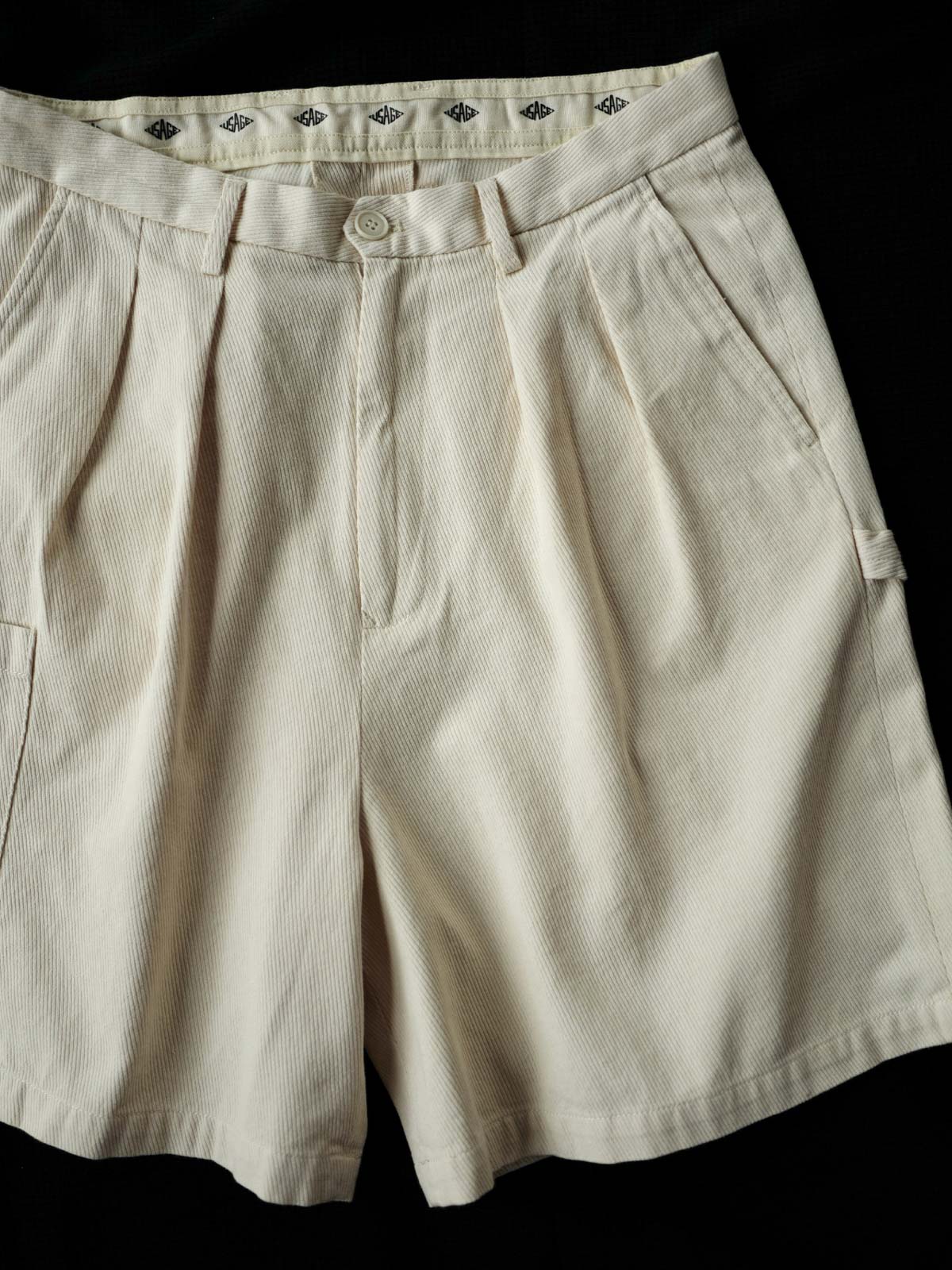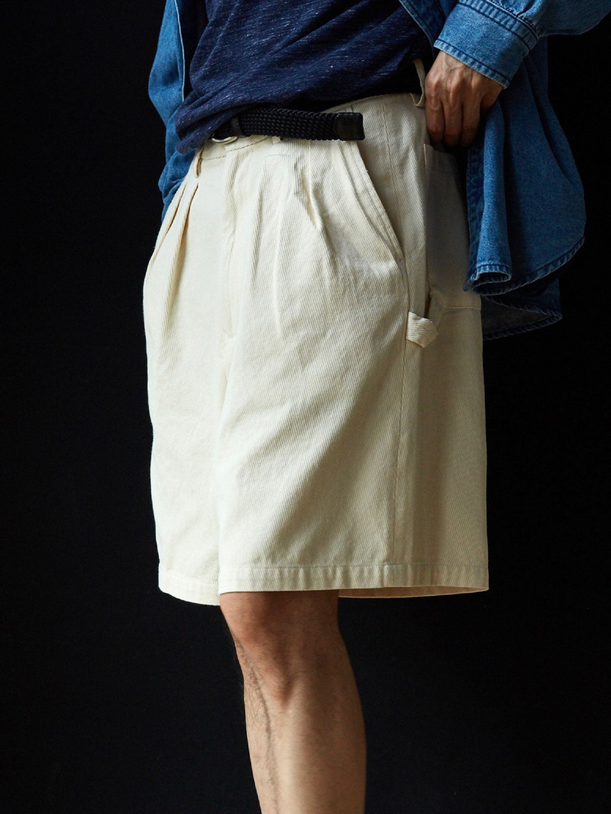 このヴィンテージダブルプリーツショーツは、クラシックなペインターパンツの機能性デザインと現代の快適性を融合し、夏の実用的かつスタイリッシュな選択肢を提供。