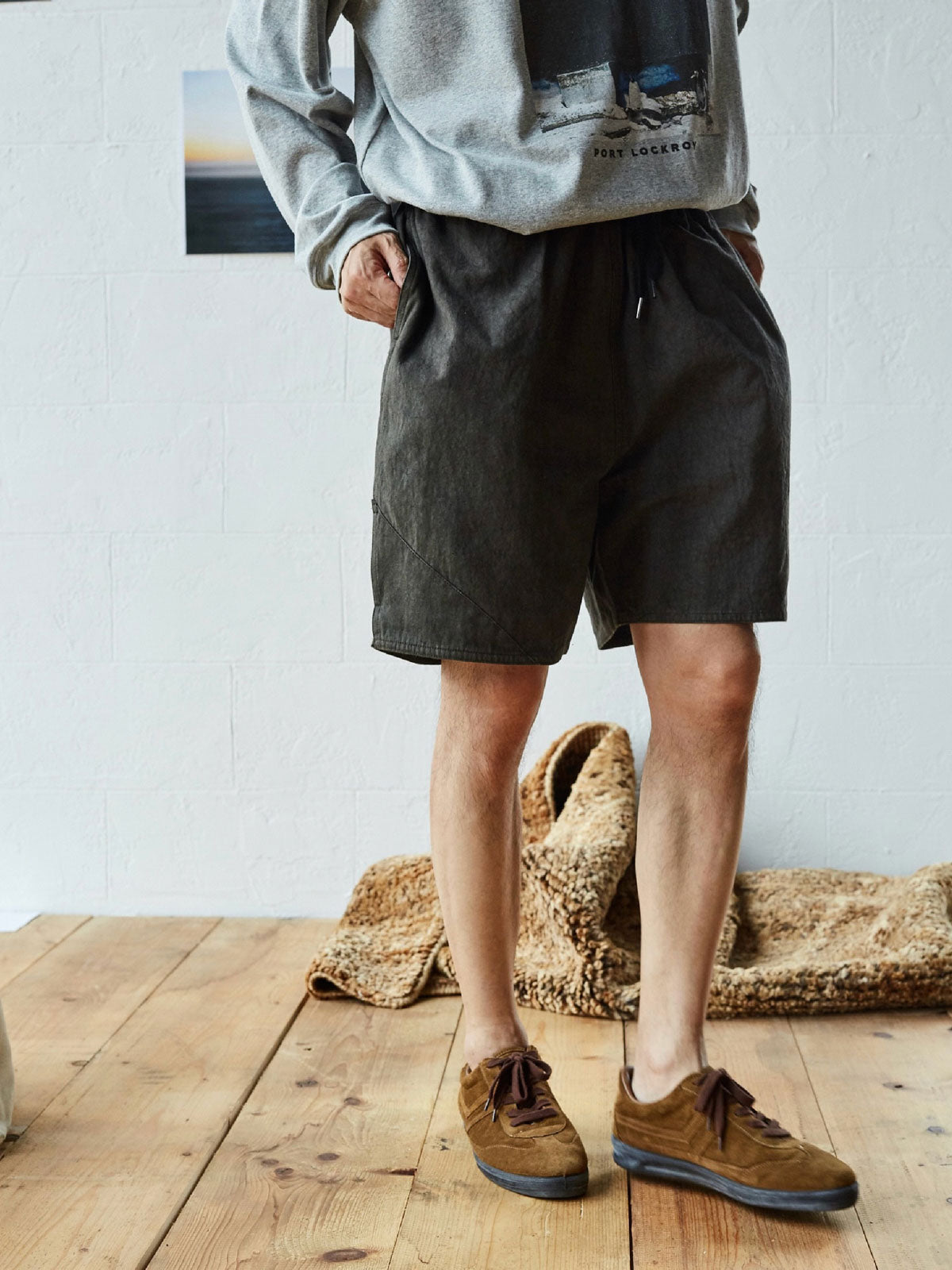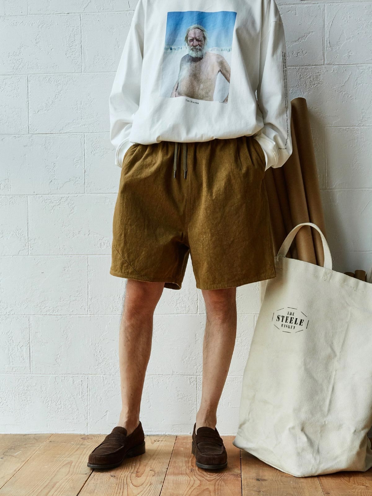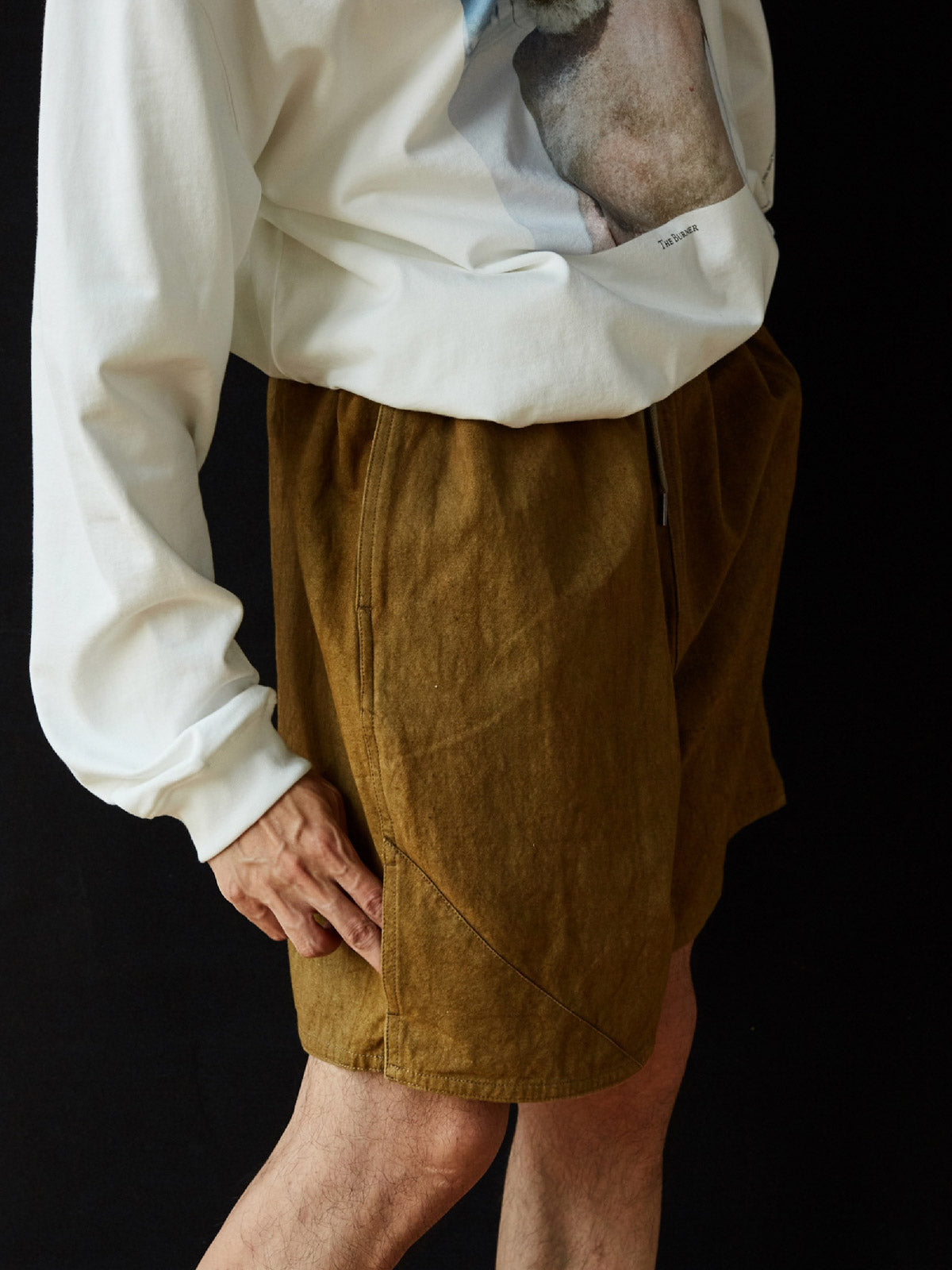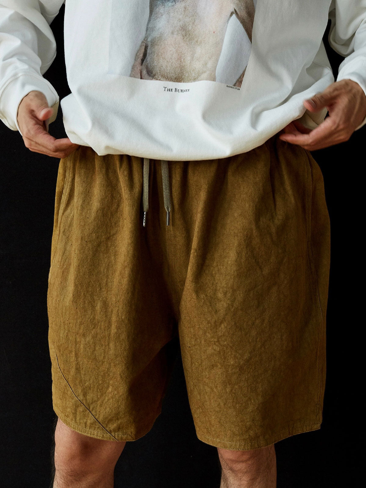 このトレーニングショーツは、1960年代の海軍トレーニングショーツから着想を得て、軽量感と快適なシルエットが特徴です。コットン100%のタイダイ染めキャンバス素材を使用しており、しっかりとした手触りで独特な質感を持っています。通常のスポーツウェアとは異なり、タイダイ染めのキャンバスはしっかりしており、ナチュラルな色合いのブラウンと深緑色のタイダイ染めが施されており、自然なムラ感があり、キャンバスの粗い質感と相まって独特な風合いが感じられます。穿き込むほどに味わい深さが増し、大人っぽい雰囲気を醸し出します。デザインは昔のトレーニングショーツのシルエットを踏襲し、ウエストはゴムとドローコードで調節可能です。後ろ腰部のヴィンテージ風のプリント文字が、豊かな視覚的ディテールを加えており、レトロなスタイルと現代的な快適性を兼ね備えた理想的なショーツです。