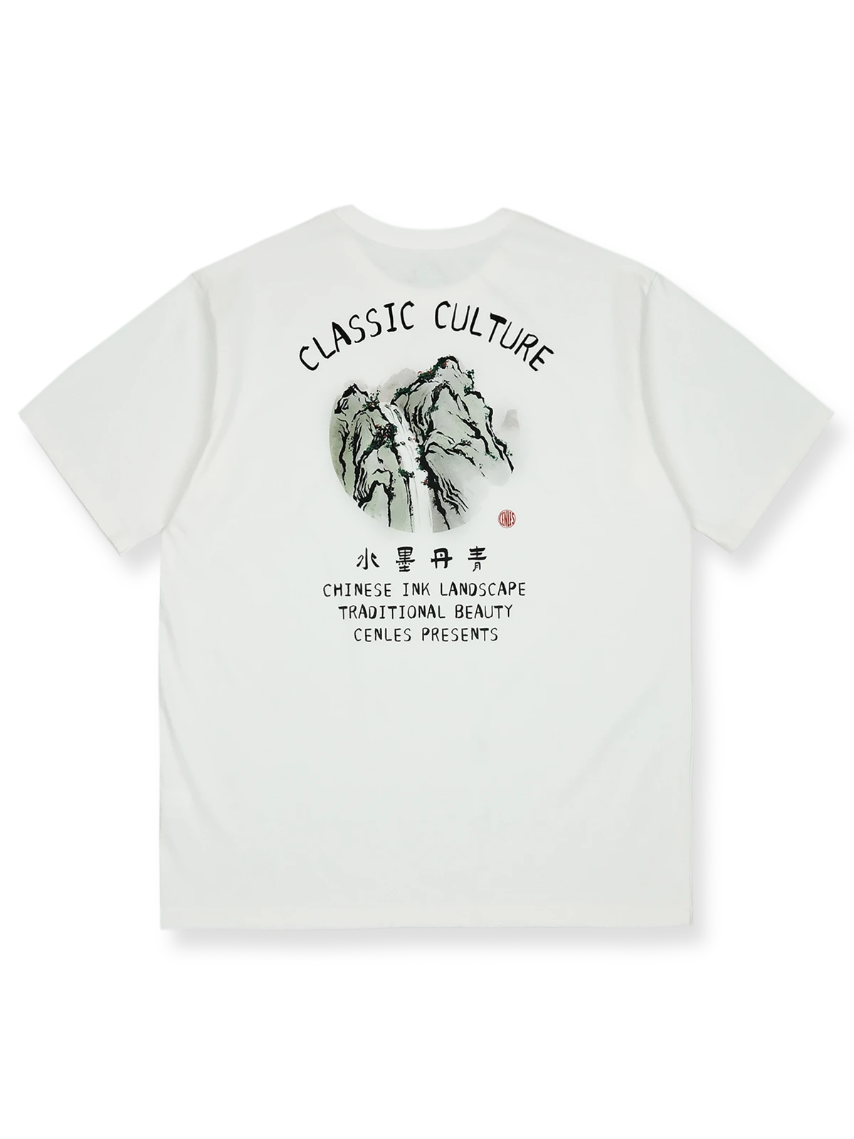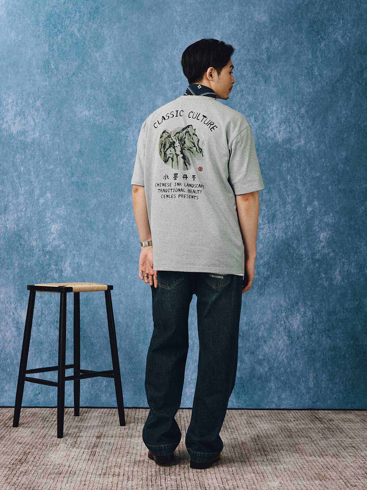 このTシャツは中国伝統の水墨画にインスピレーションを得ており、現代の服に山水画の美を再現しています。水墨画は千年以上の歴史を持ち、墨色の濃淡や意境の深さを通じて東洋美学の真髄を表現しています。PESSOAのデザインでは、自然景観の調和と淡雅さを取り入れ、東洋文化の深い意味を世界に示しています。