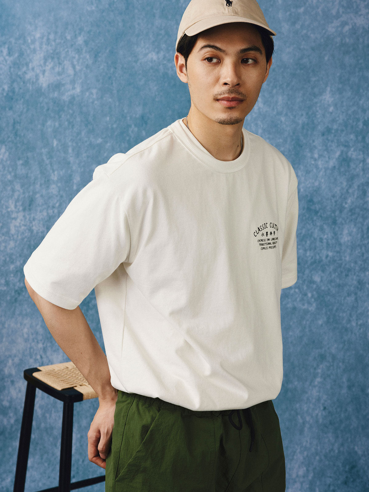 100%コットンの270Gニット生地を使用し、リラックスフィットとドロップショルダーのカットが柔らかさと耐久性を提供します。丁寧にデザインされたネックラインとダブルステッチのショルダーラインが、快適さと耐久性を保証しています。