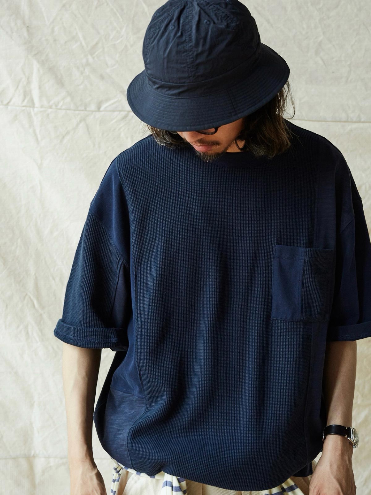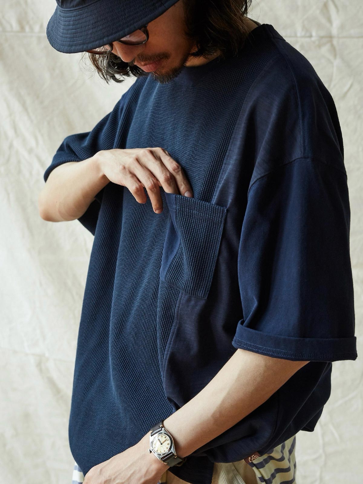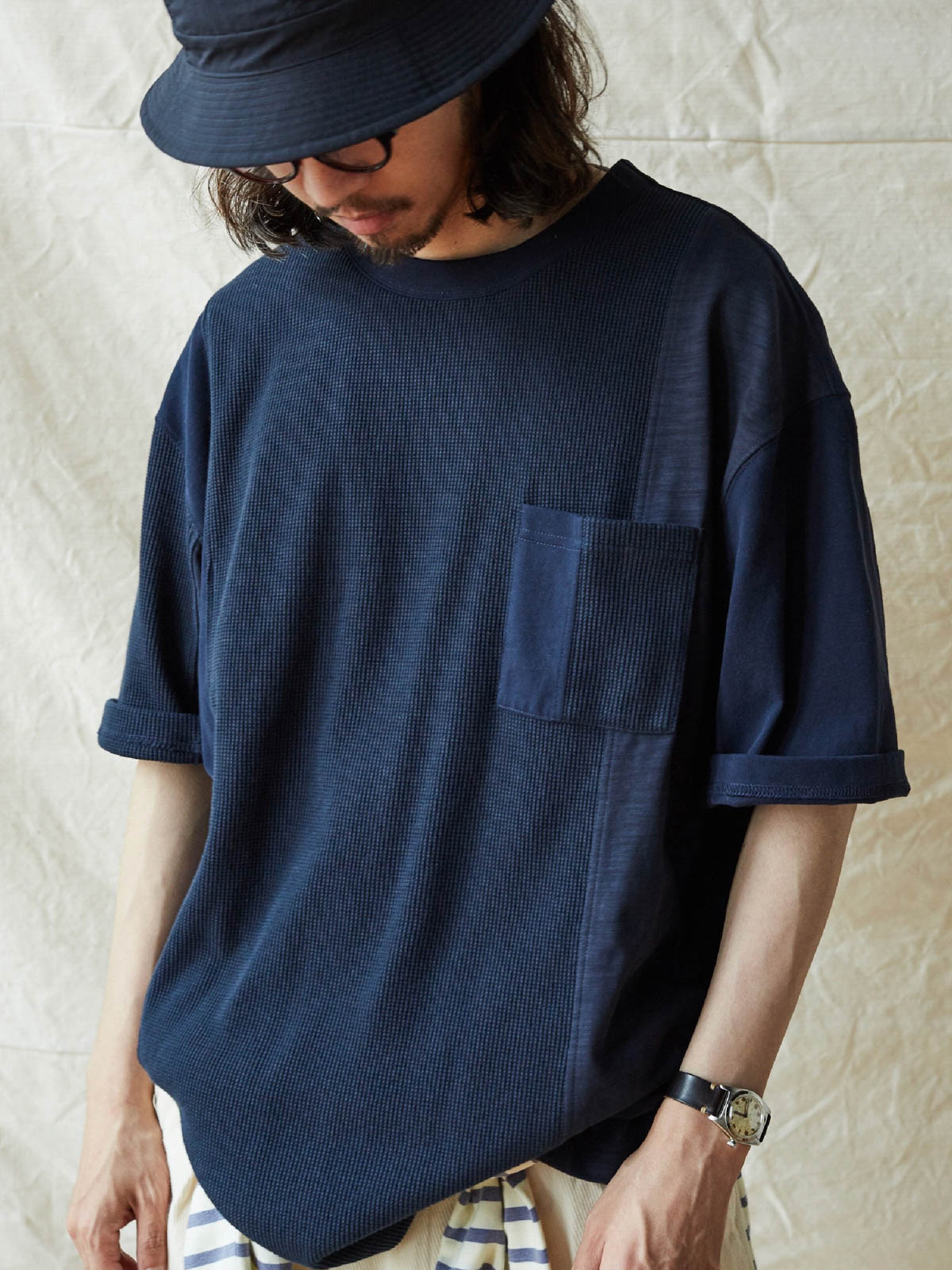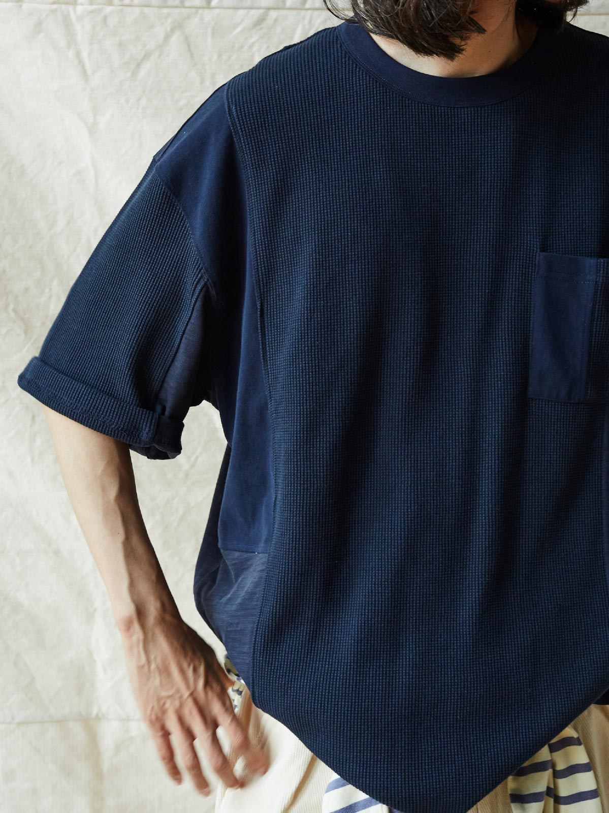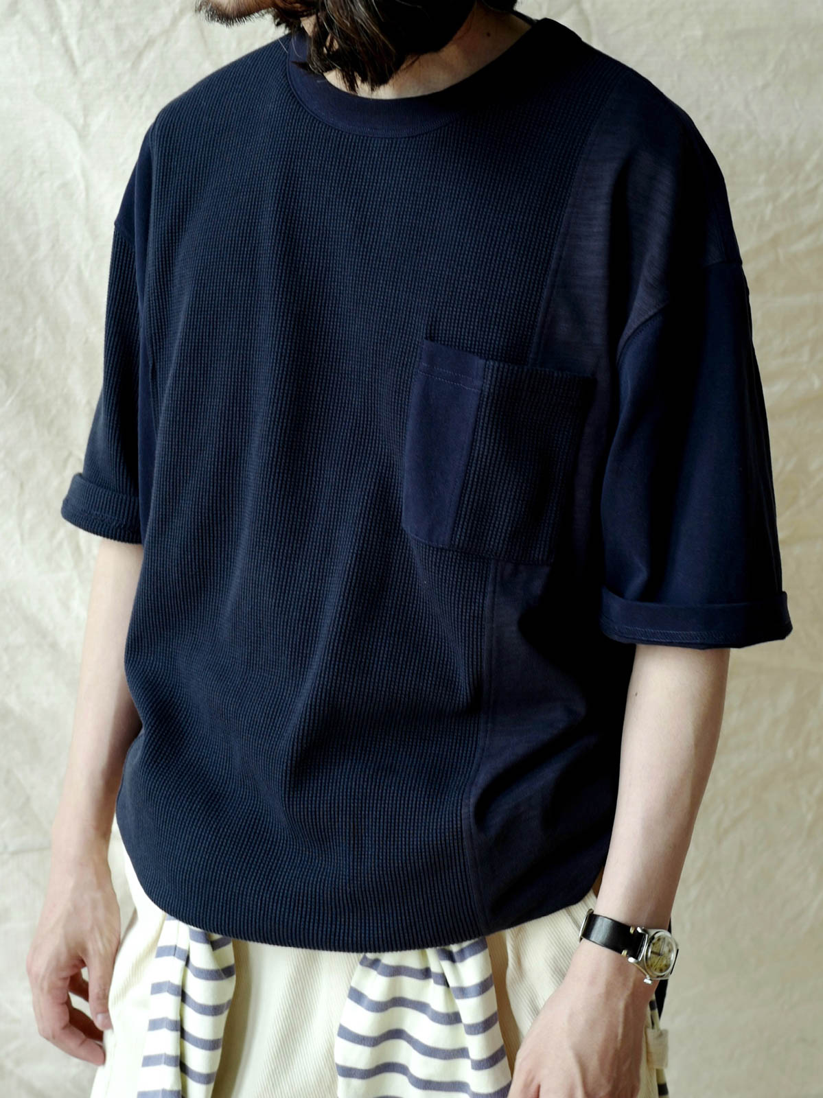 このTシャツは、クラシックなワッフルテクスチャーをベースに、竹節コットンと全綿ニット素材を融合させています。巧妙なパッチワークデザインにより、豊かな視覚効果と触感のレイヤーを生み出します。遠目にはシンプルなネイビーカラーですが、近くで見ると細かいテクスチャーの変化が楽しめ、ユニークな着こなしを提供します。オーバーサイズのルーズフィットデザインで、快適なスペースを確保。前後で長さの異なる裾と両サイドのスリットデザインがファッション性と動きやすさをプラスしています。通常のリブネック、パッチワークチェストポケット、ブランドの象徴である船の錨の装飾タグが全体のデザインを引き締めます。製品は洗い加工されており、縮みを防ぐとともに、異なる素材の自然な結合を実現し、爽やかで快適な着心地を提供します。夏の必須アイテムです。