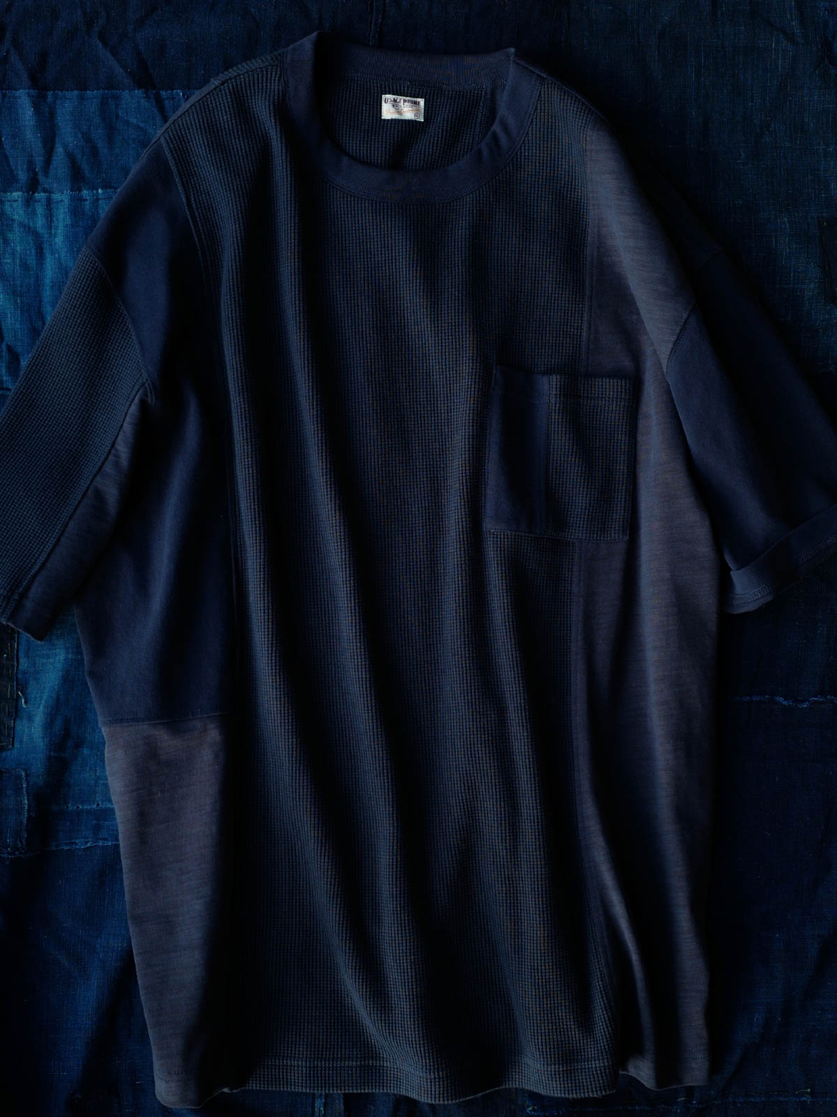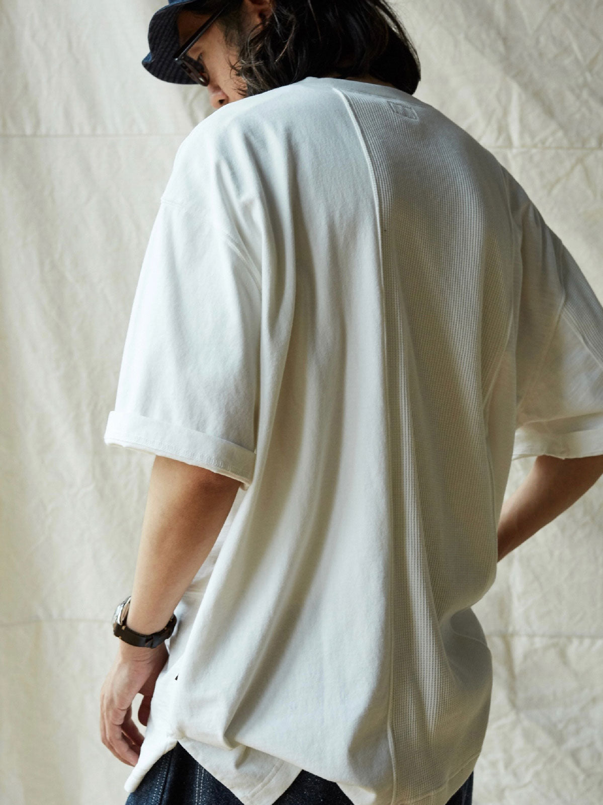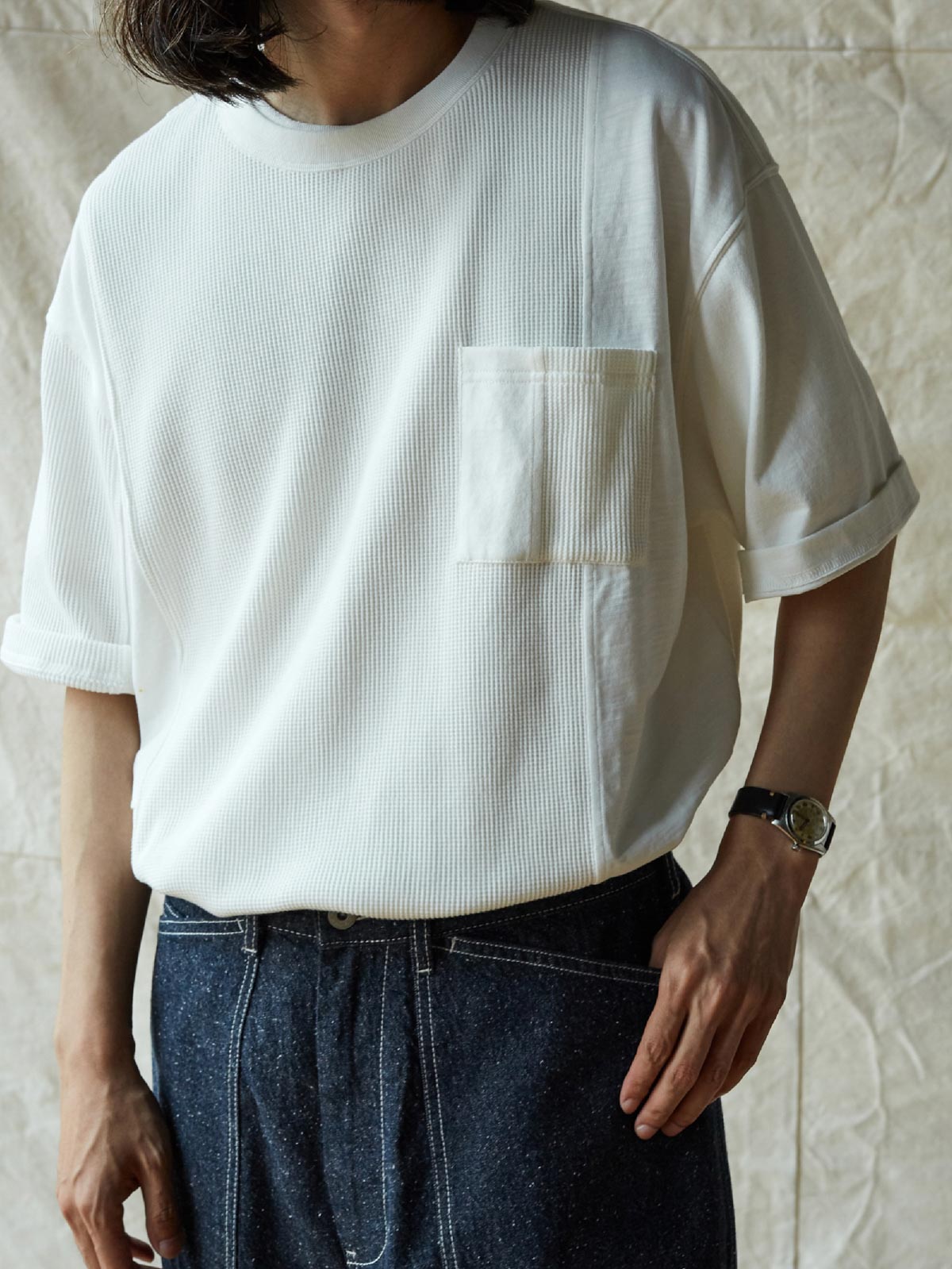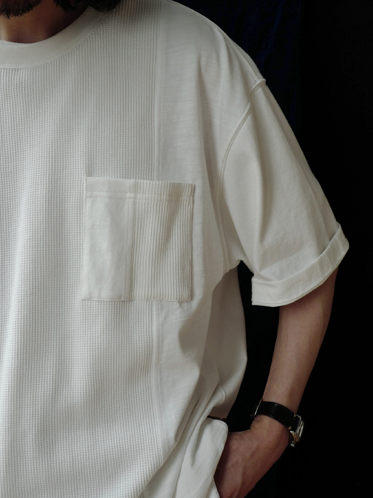 このTシャツは、クラシックなワッフルテクスチャーをベースに、竹節コットンと全綿ニット素材を融合させています。巧妙なパッチワークデザインにより、豊かな視覚効果と触感のレイヤーを生み出します。遠目にはシンプルなネイビーカラーですが、近くで見ると細かいテクスチャーの変化が楽しめ、ユニークな着こなしを提供します。オーバーサイズのルーズフィットデザインで、快適なスペースを確保。前後で長さの異なる裾と両サイドのスリットデザインがファッション性と動きやすさをプラスしています。通常のリブネック、パッチワークチェストポケット、ブランドの象徴である船の錨の装飾タグが全体のデザインを引き締めます。製品は洗い加工されており、縮みを防ぐとともに、異なる素材の自然な結合を実現し、爽やかで快適な着心地を提供します。夏の必須アイテムです。