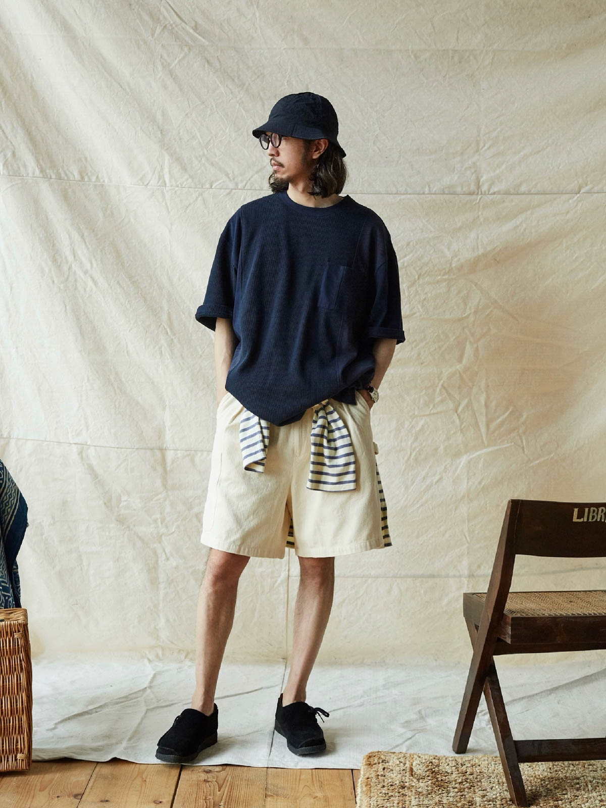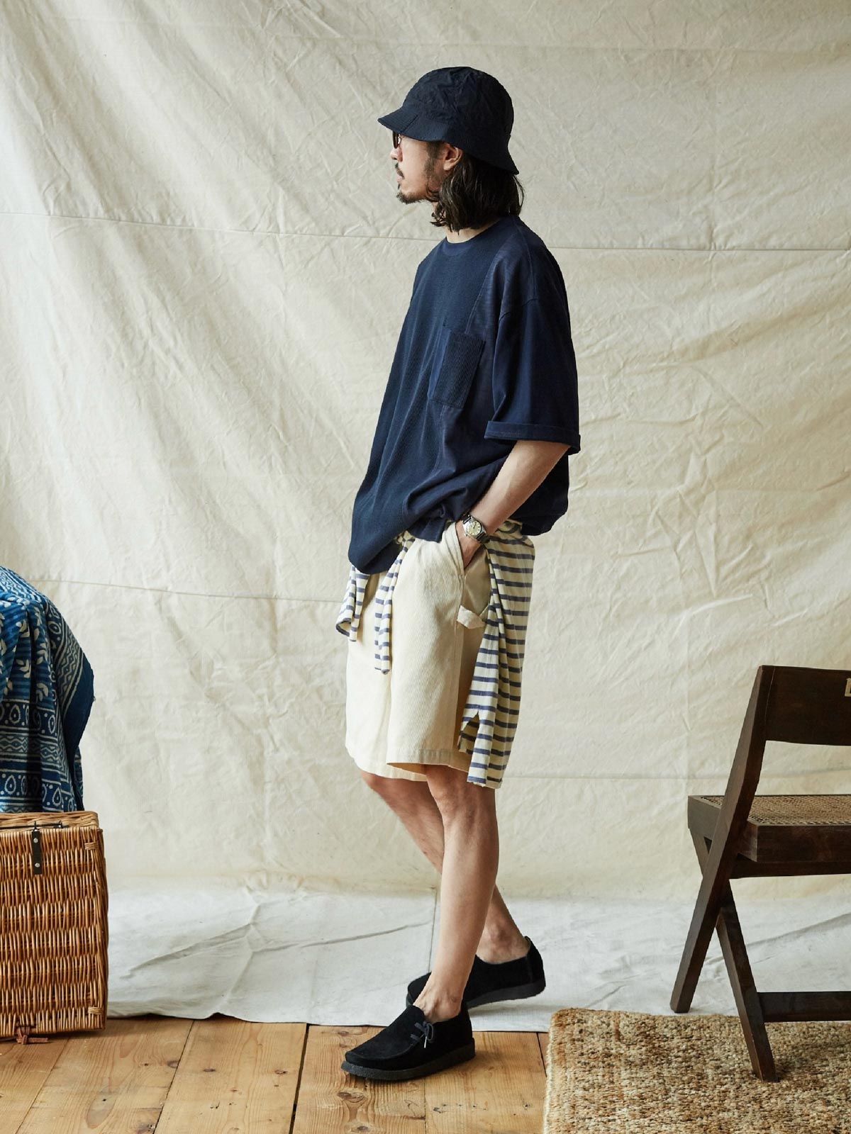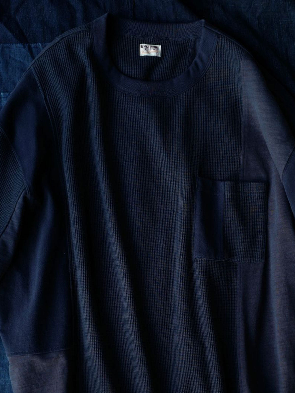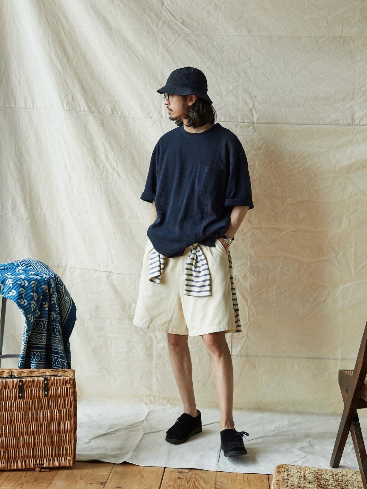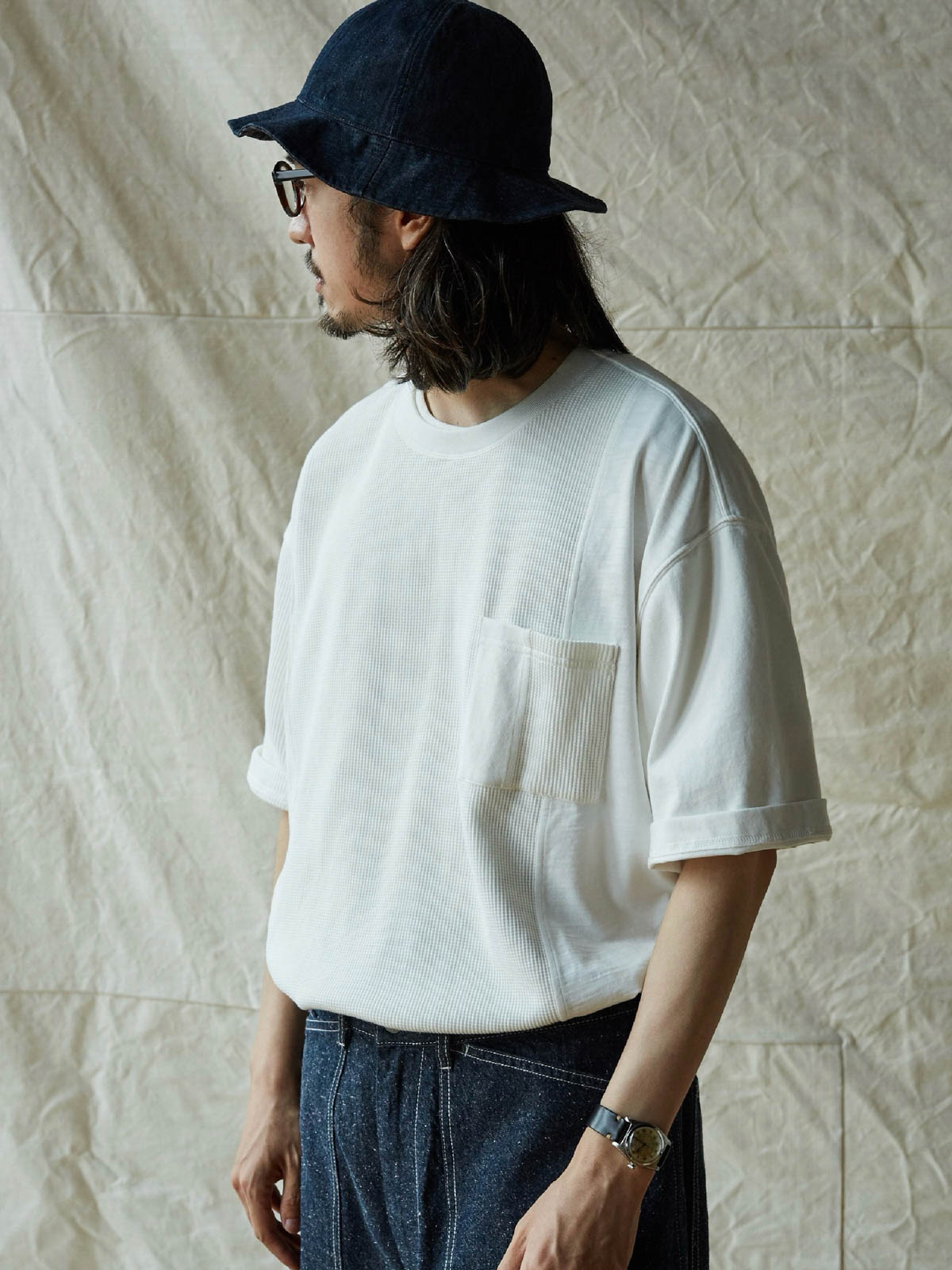 このTシャツは、クラシックなワッフルテクスチャーをベースに、竹節コットンと全綿ニット素材を融合させています。巧妙なパッチワークデザインにより、豊かな視覚効果と触感のレイヤーを生み出します。遠目にはシンプルなネイビーカラーですが、近くで見ると細かいテクスチャーの変化が楽しめ、ユニークな着こなしを提供します。オーバーサイズのルーズフィットデザインで、快適なスペースを確保。前後で長さの異なる裾と両サイドのスリットデザインがファッション性と動きやすさをプラスしています。通常のリブネック、パッチワークチェストポケット、ブランドの象徴である船の錨の装飾タグが全体のデザインを引き締めます。製品は洗い加工されており、縮みを防ぐとともに、異なる素材の自然な結合を実現し、爽やかで快適な着心地を提供します。夏の必須アイテムです。