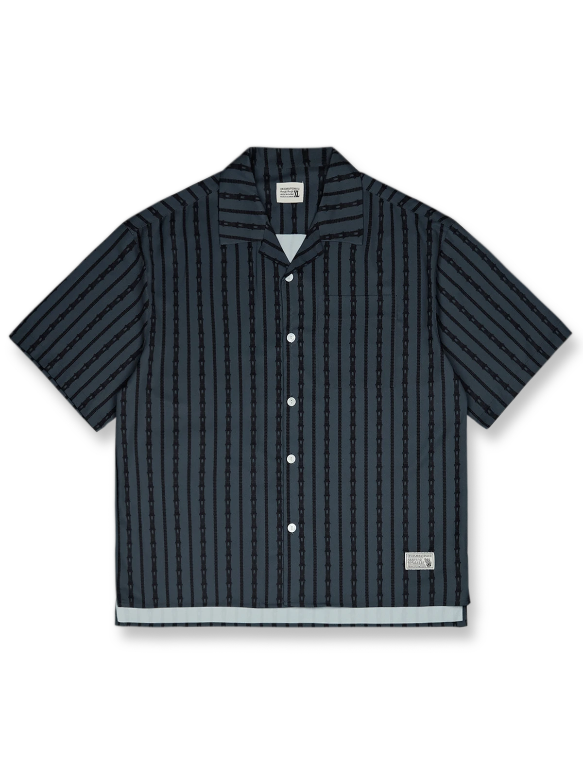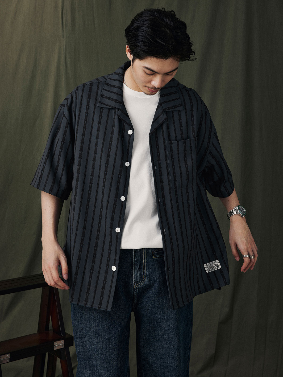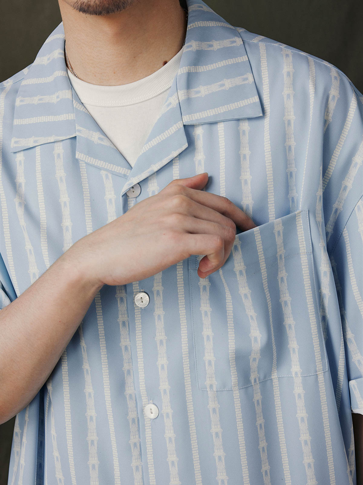 このハワイアンシャツは、独特な教会建築のストライプデザインを特徴としており、古典的な建築美学と現代ファッションの融合を表現しています。歴史と現代、伝統とカジュアルの調和を細部にわたる配慮で示しています。