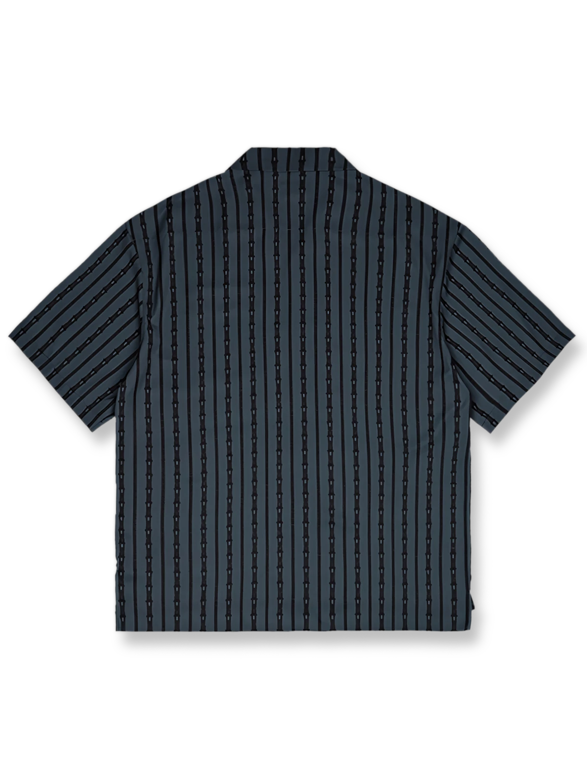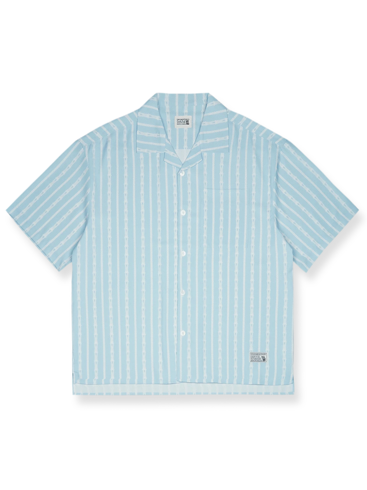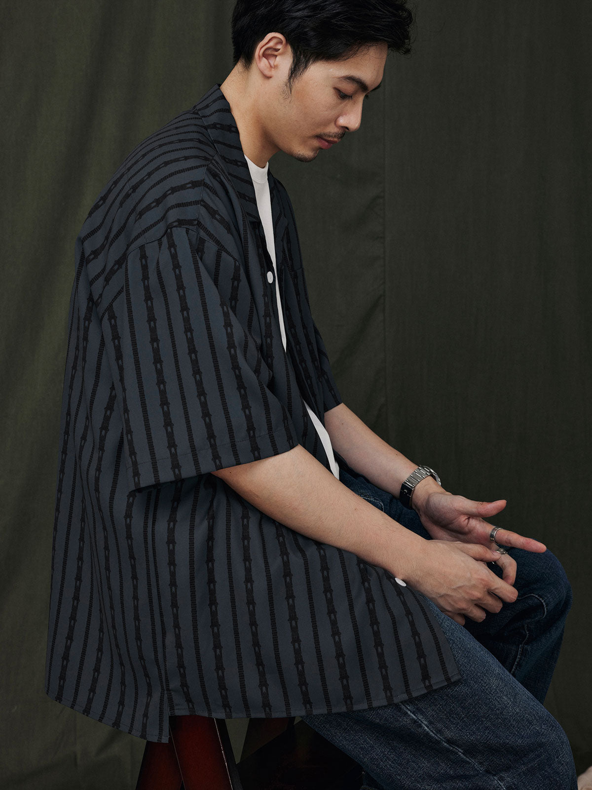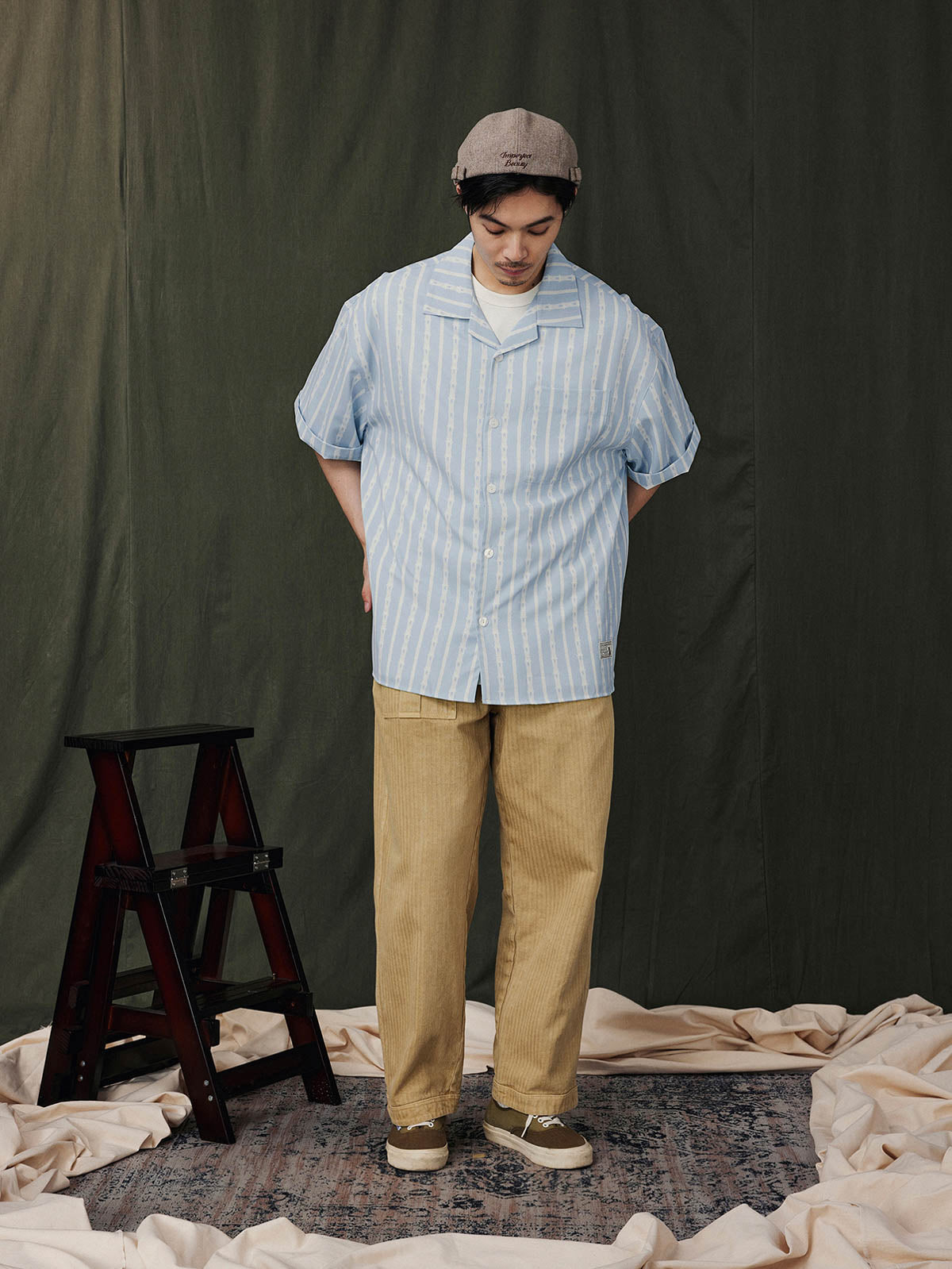 このハワイアンシャツは、独特な教会建築のストライプデザインを特徴としており、古典的な建築美学と現代ファッションの融合を表現しています。歴史と現代、伝統とカジュアルの調和を細部にわたる配慮で示しています。