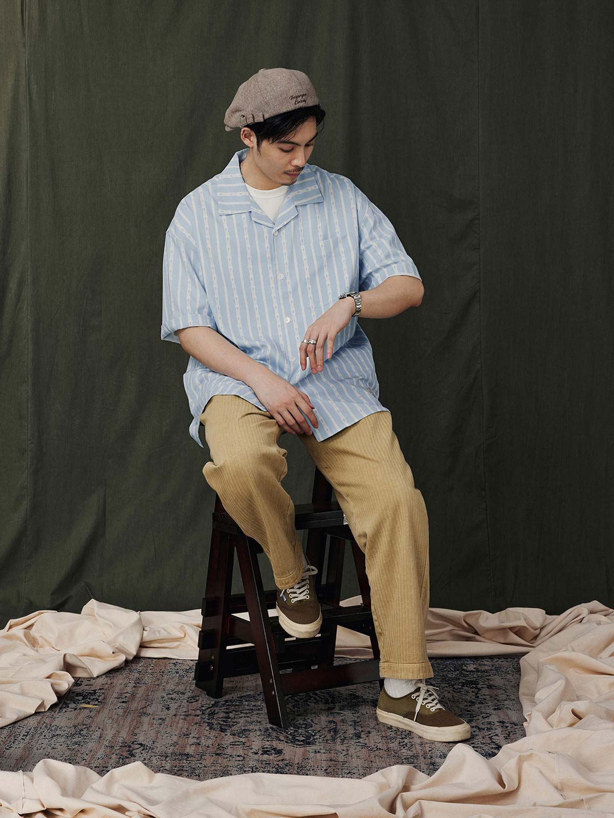 天青色とダークグレーの2色展開で、様々な場面や気分に合わせやすいです。シンプルなフラットフロントパンツやカジュアルショーツを合わせると、リラックスしたビーチリゾートスタイルが完成します。さらに、涼しげなキャンバスシューズを組み合わせることで、日常のカジュアルな装いが完成します。