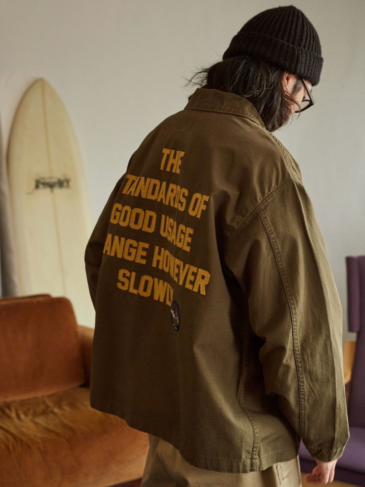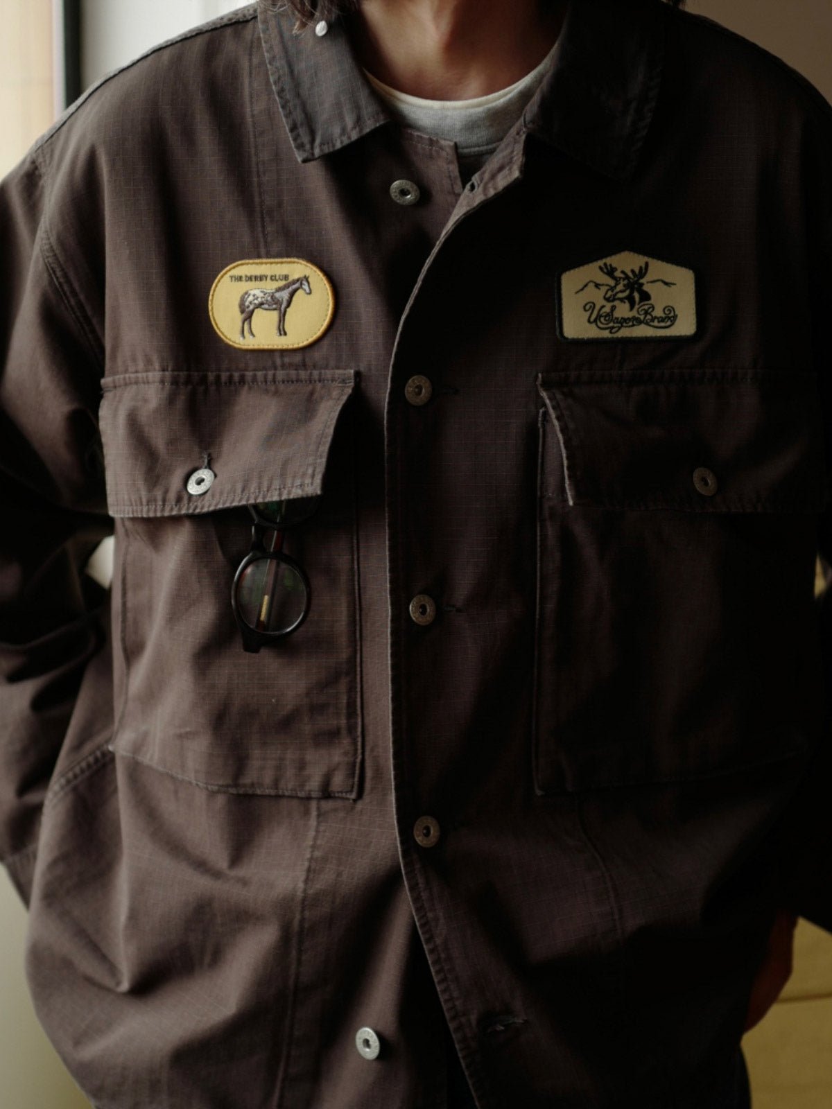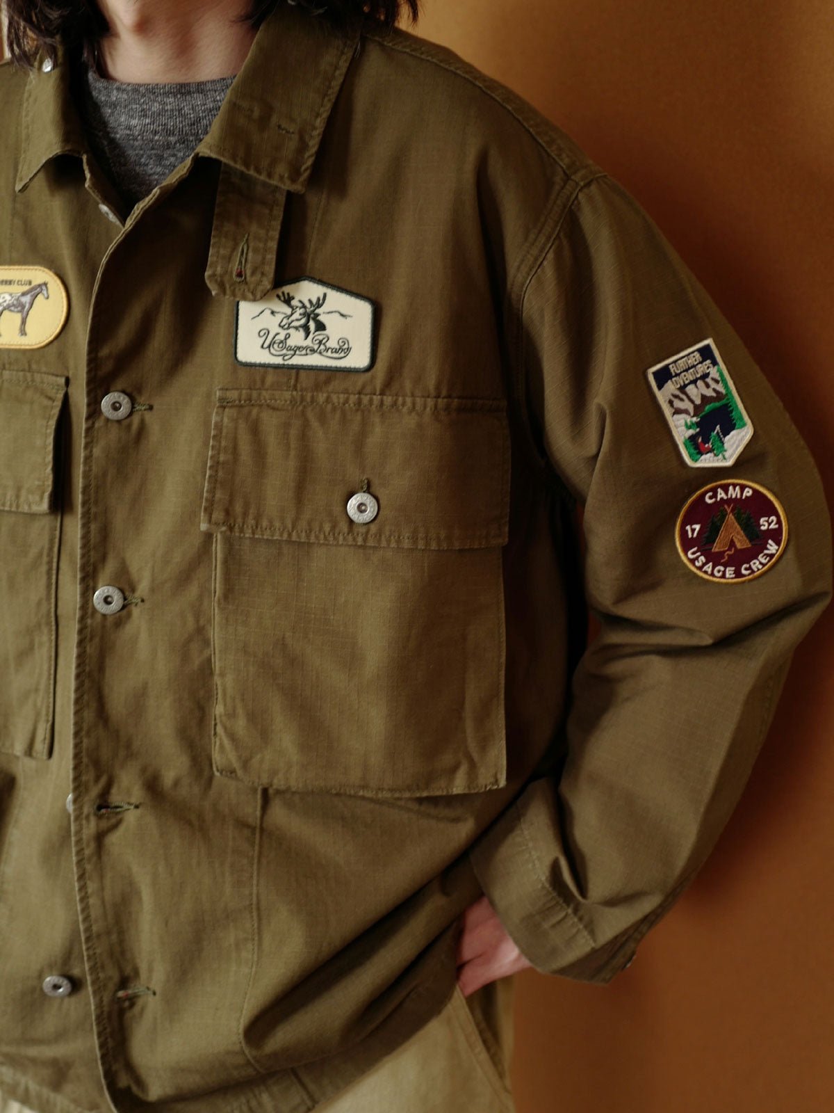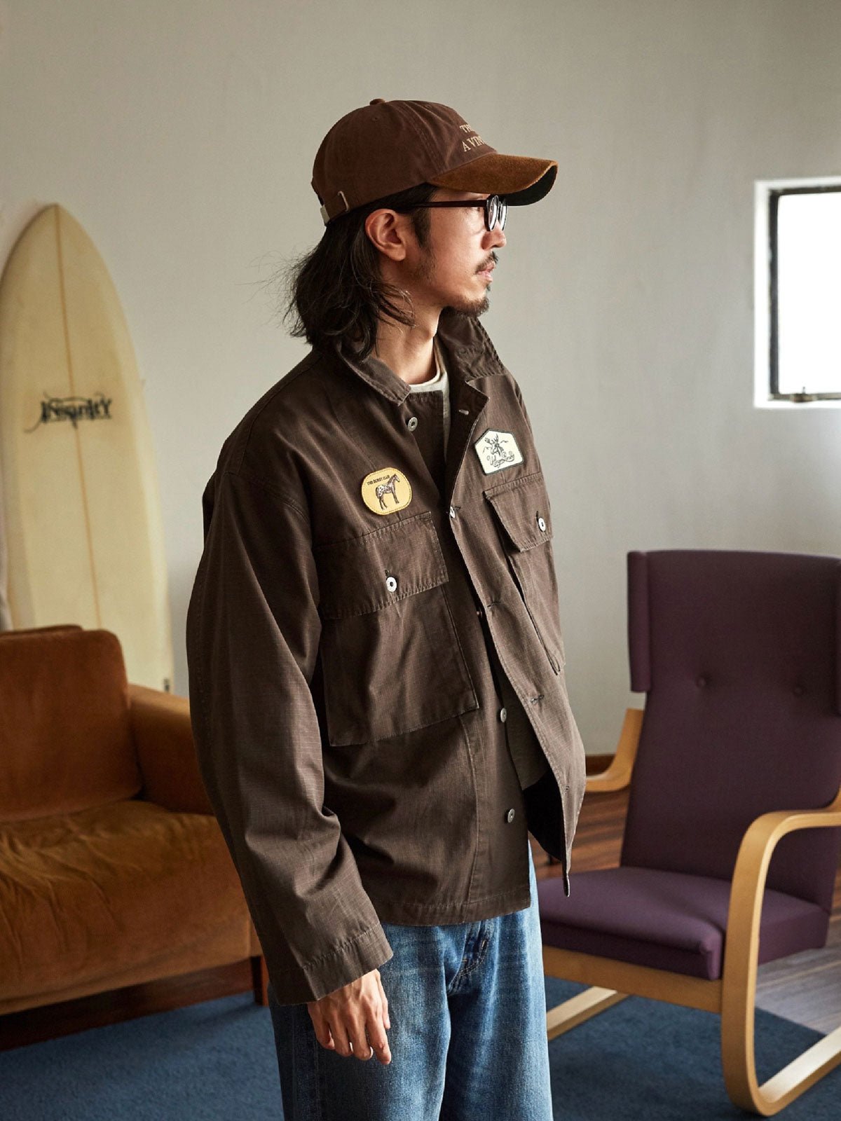 このシャツジャケットは、第二次世界大戦中のアメリカ軍用ジャケットM43をモチーフにしたデザインです。当時の軍服の機能性とスタイルを受け継ぎつつ、現代のファッションに合わせてアレンジされています。貼り付けられた手作りのパッチと刺繍は、個性と歴史的な要素を加えており、それぞれのパッチがストーリーを語っています。