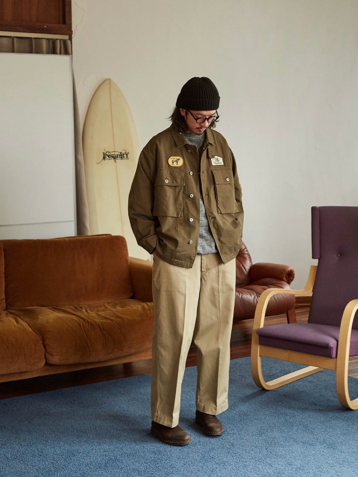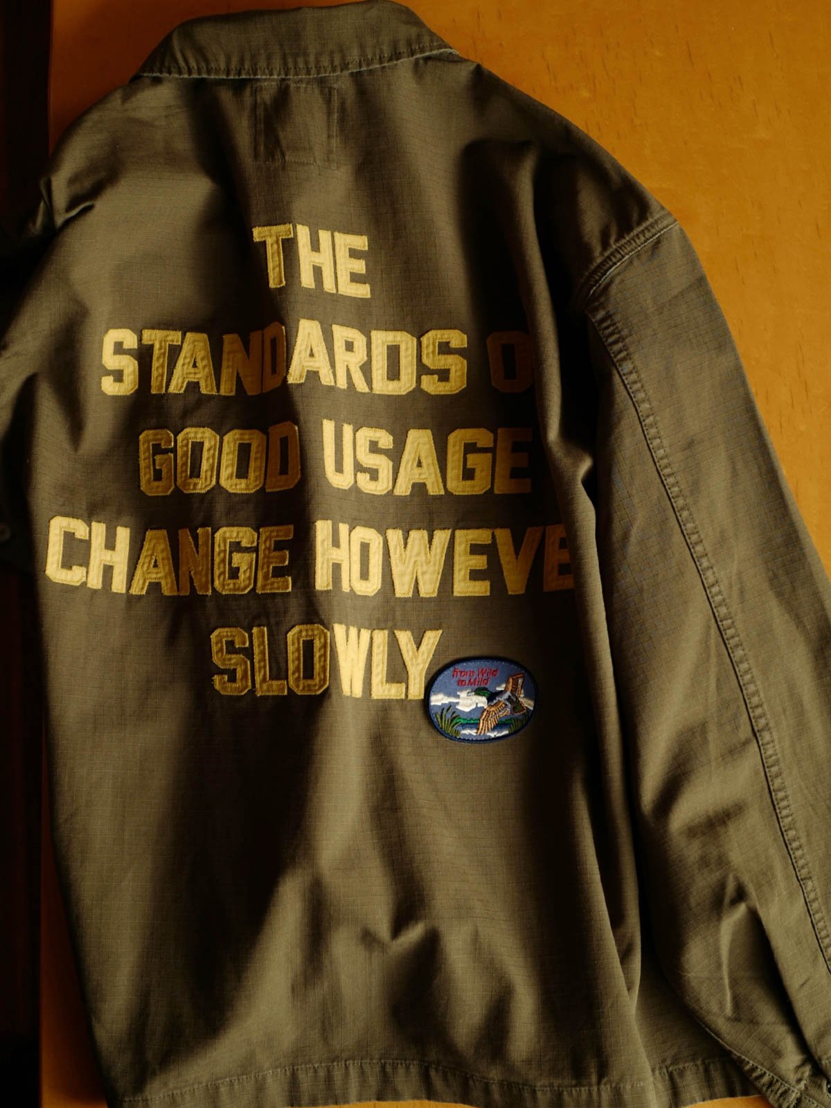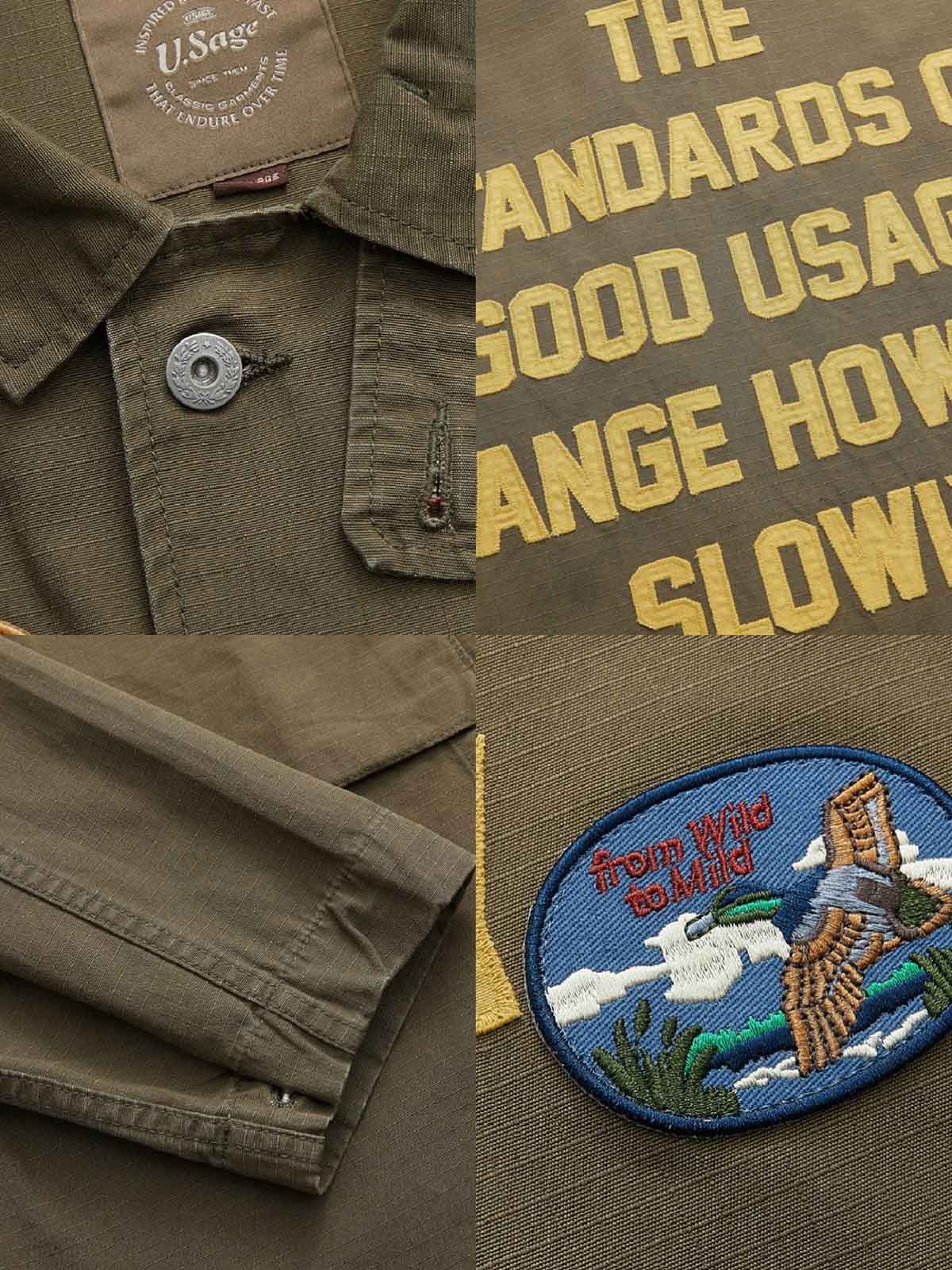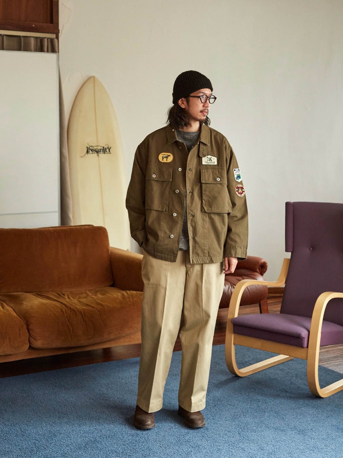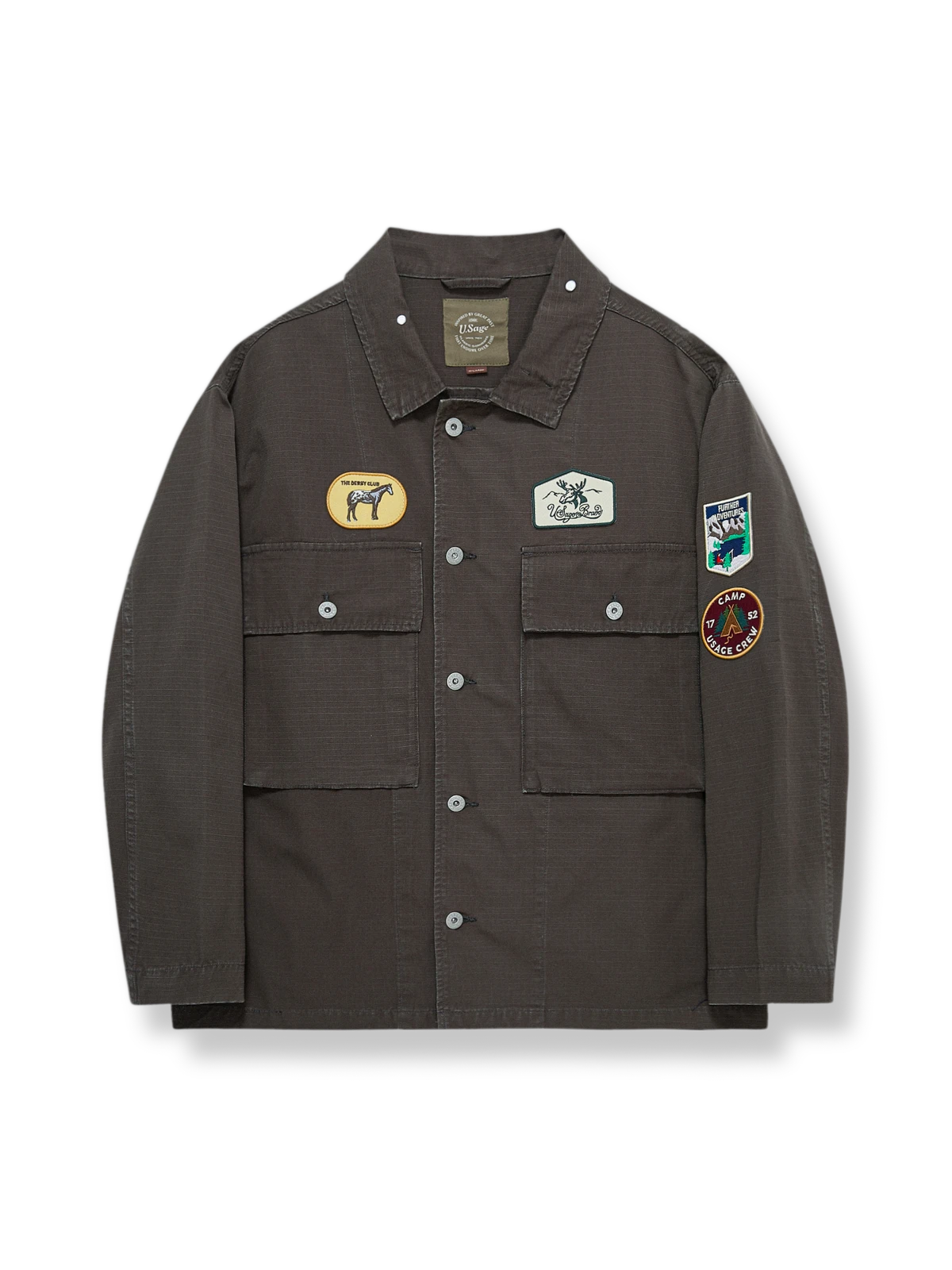 このシャツジャケットは、第二次世界大戦中のアメリカ軍用ジャケットM43をモチーフにしたデザインです。当時の軍服の機能性とスタイルを受け継ぎつつ、現代のファッションに合わせてアレンジされています。貼り付けられた手作りのパッチと刺繍は、個性と歴史的な要素を加えており、それぞれのパッチがストーリーを語っています。