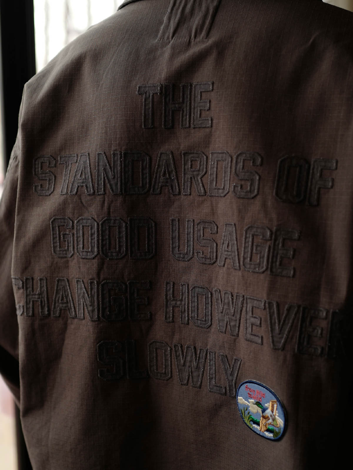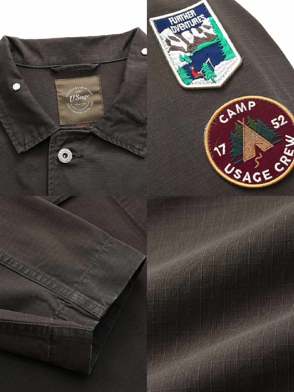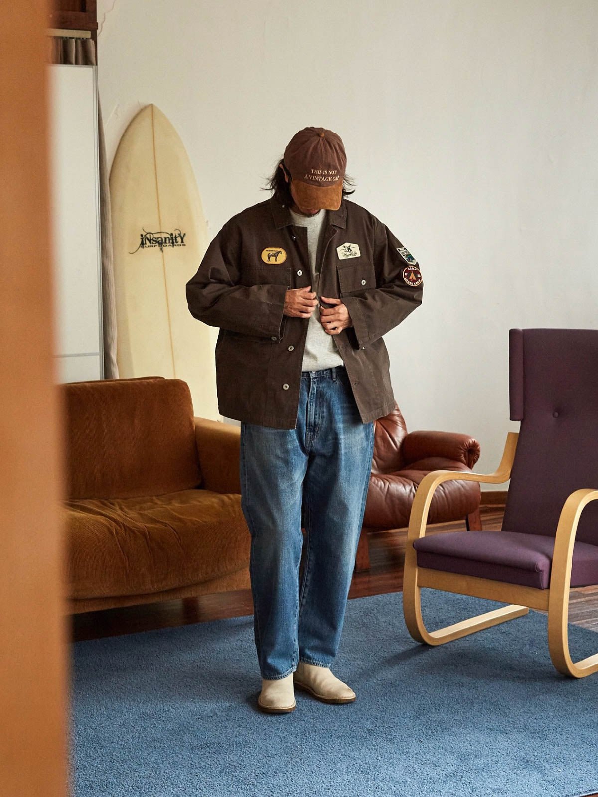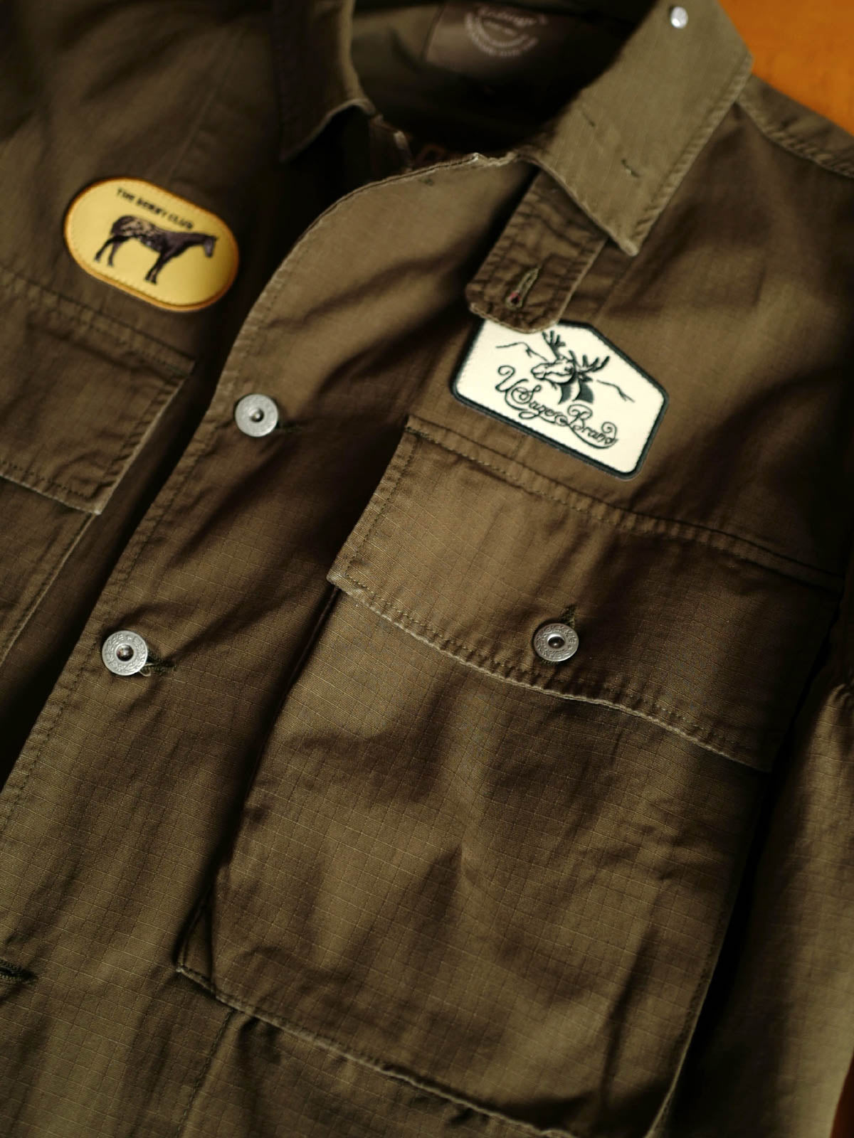 このシャツジャケットは、第二次世界大戦中のアメリカ軍用ジャケットM43をモチーフにしたデザインです。当時の軍服の機能性とスタイルを受け継ぎつつ、現代のファッションに合わせてアレンジされています。貼り付けられた手作りのパッチと刺繍は、個性と歴史的な要素を加えており、それぞれのパッチがストーリーを語っています。