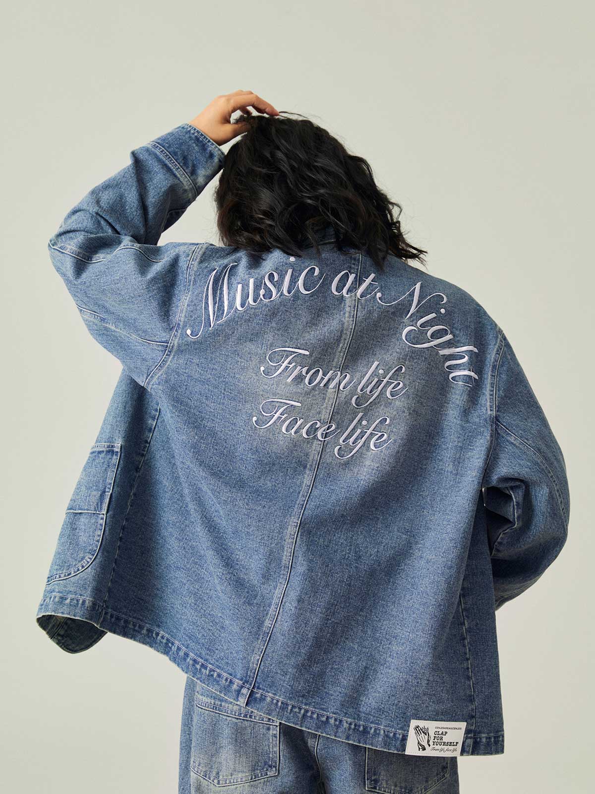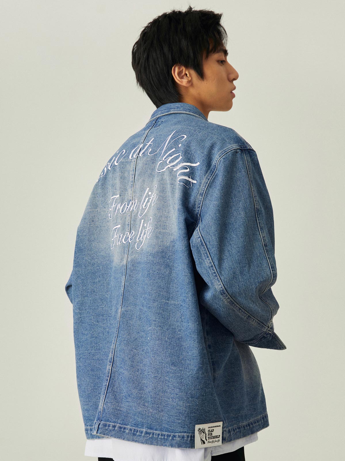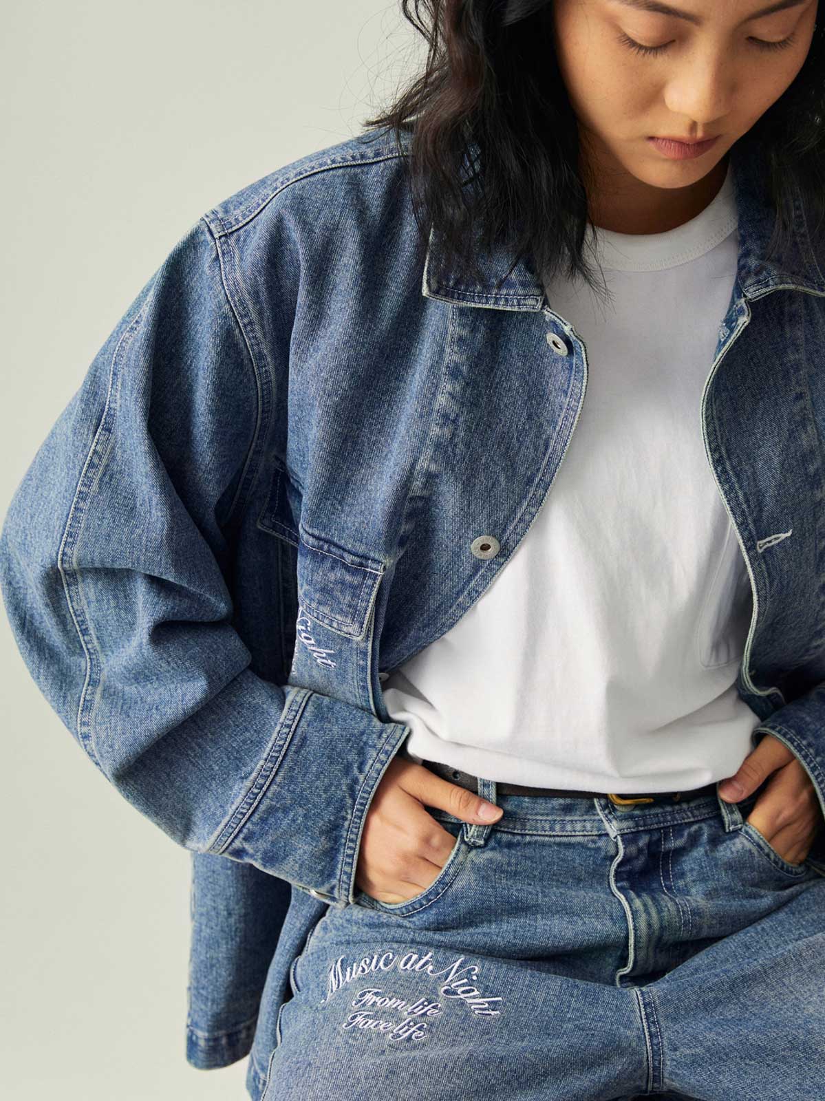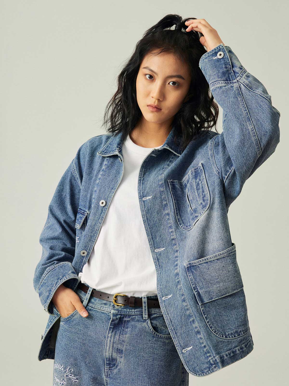 このレトロなワークスタイルのルーズフィットデニムジャケットは、アシンメトリーポケットデザインと精巧な刺繍を組み合わせ、ファッション性と実用性の完璧な融合を実現しています。