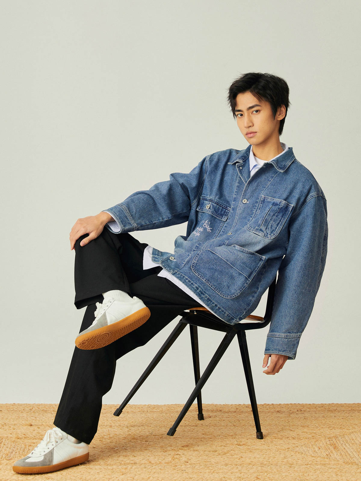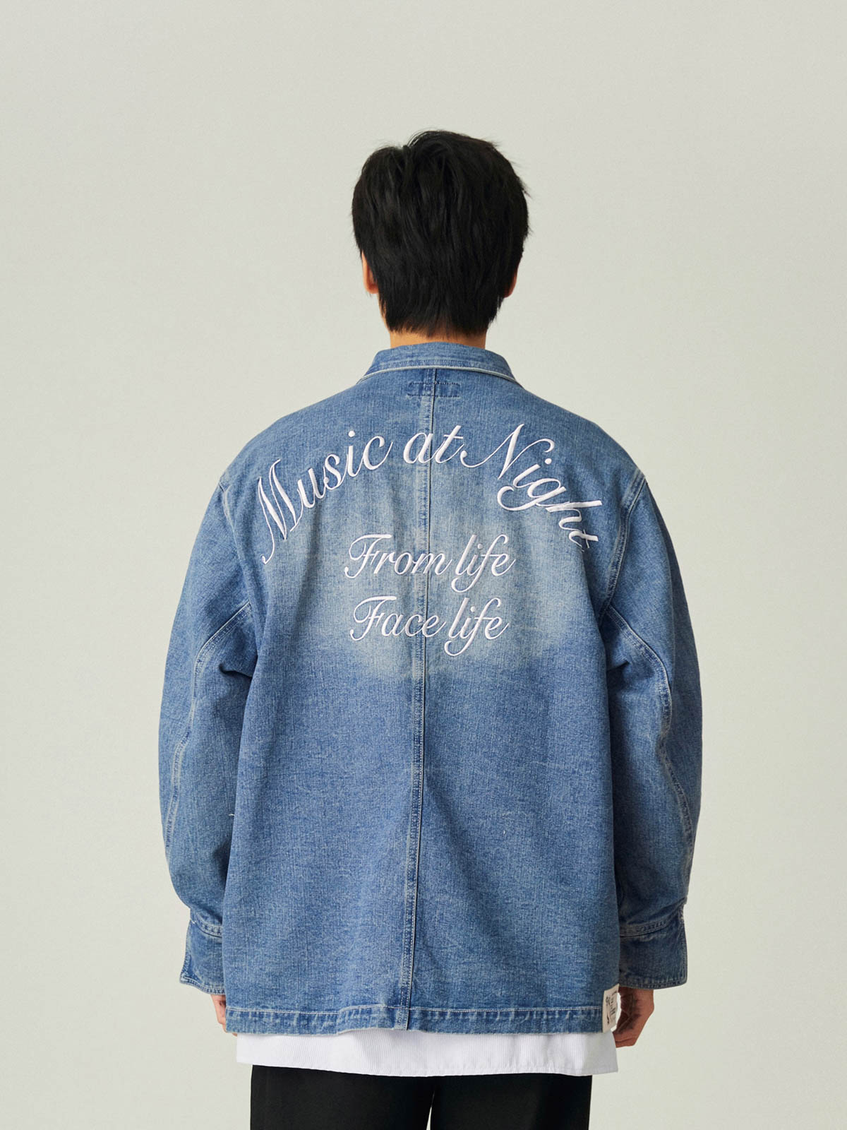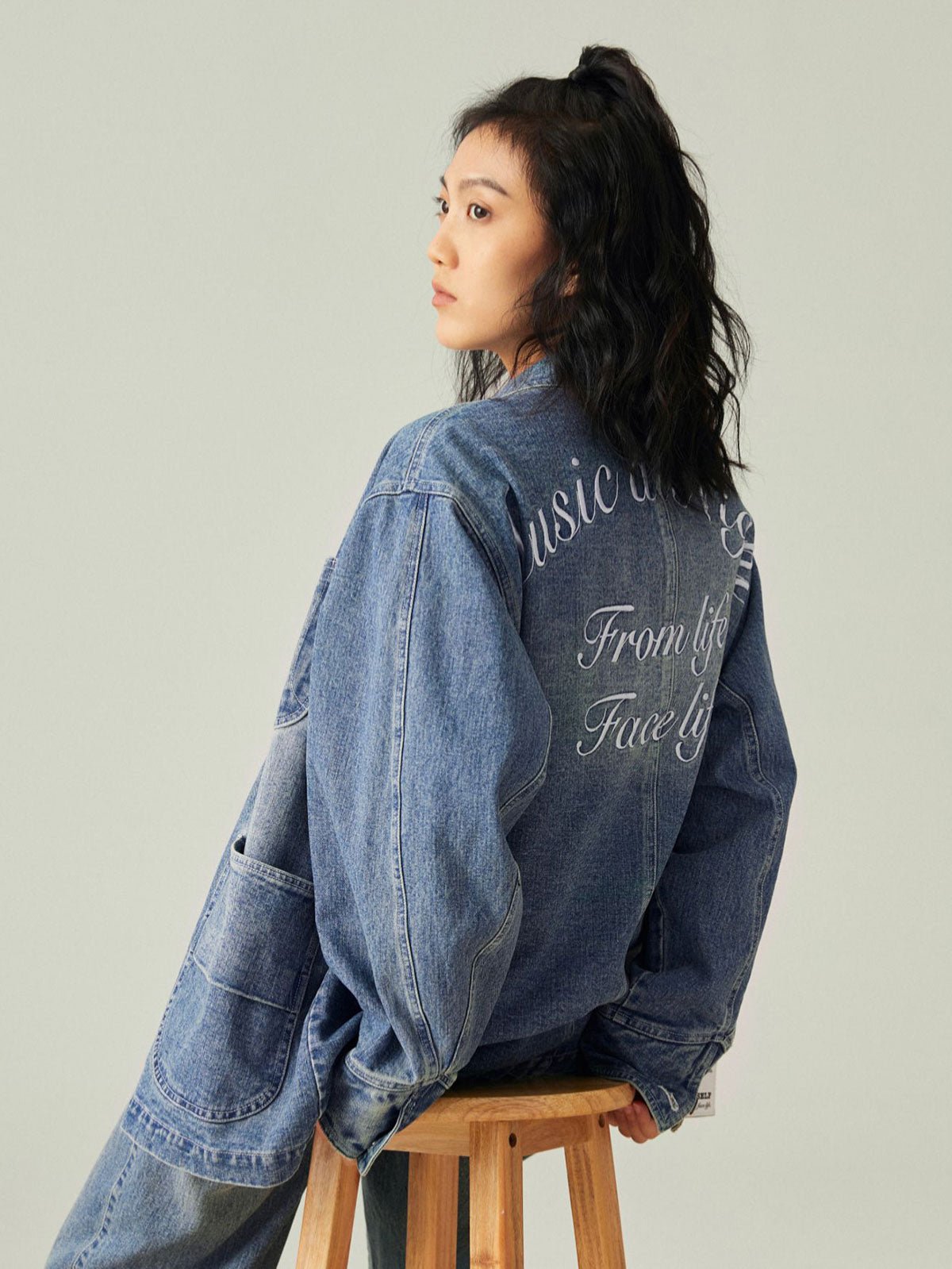 このレトロなワークスタイルのルーズフィットデニムジャケットは、アシンメトリーポケットデザインと精巧な刺繍を組み合わせ、ファッション性と実用性の完璧な融合を実現しています。