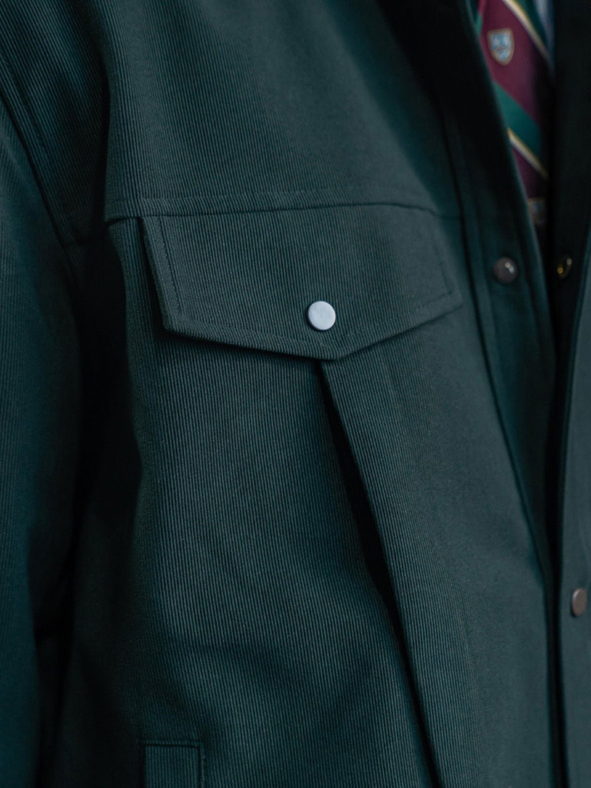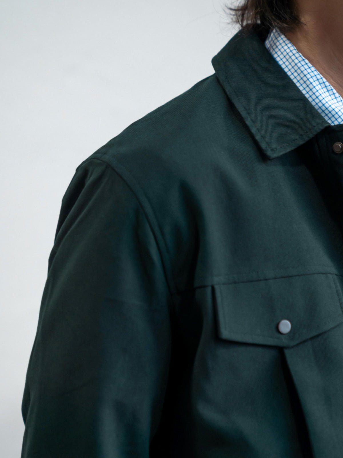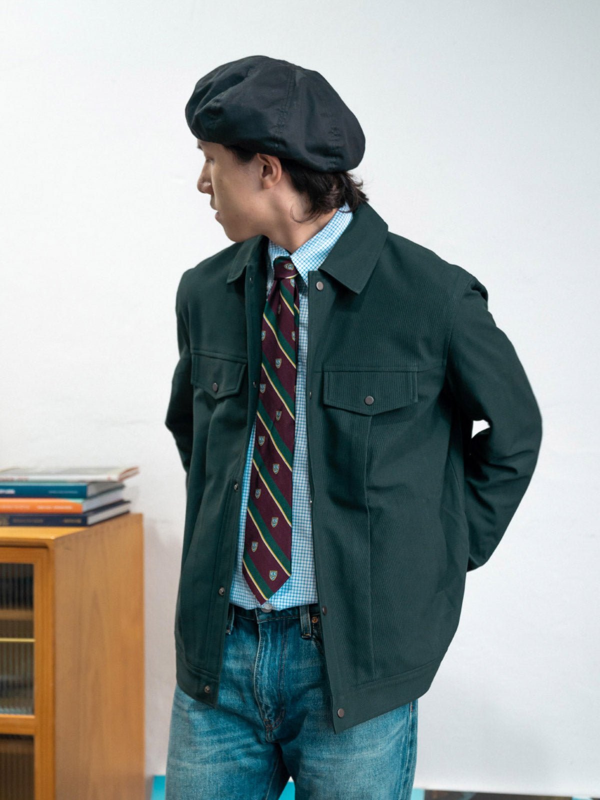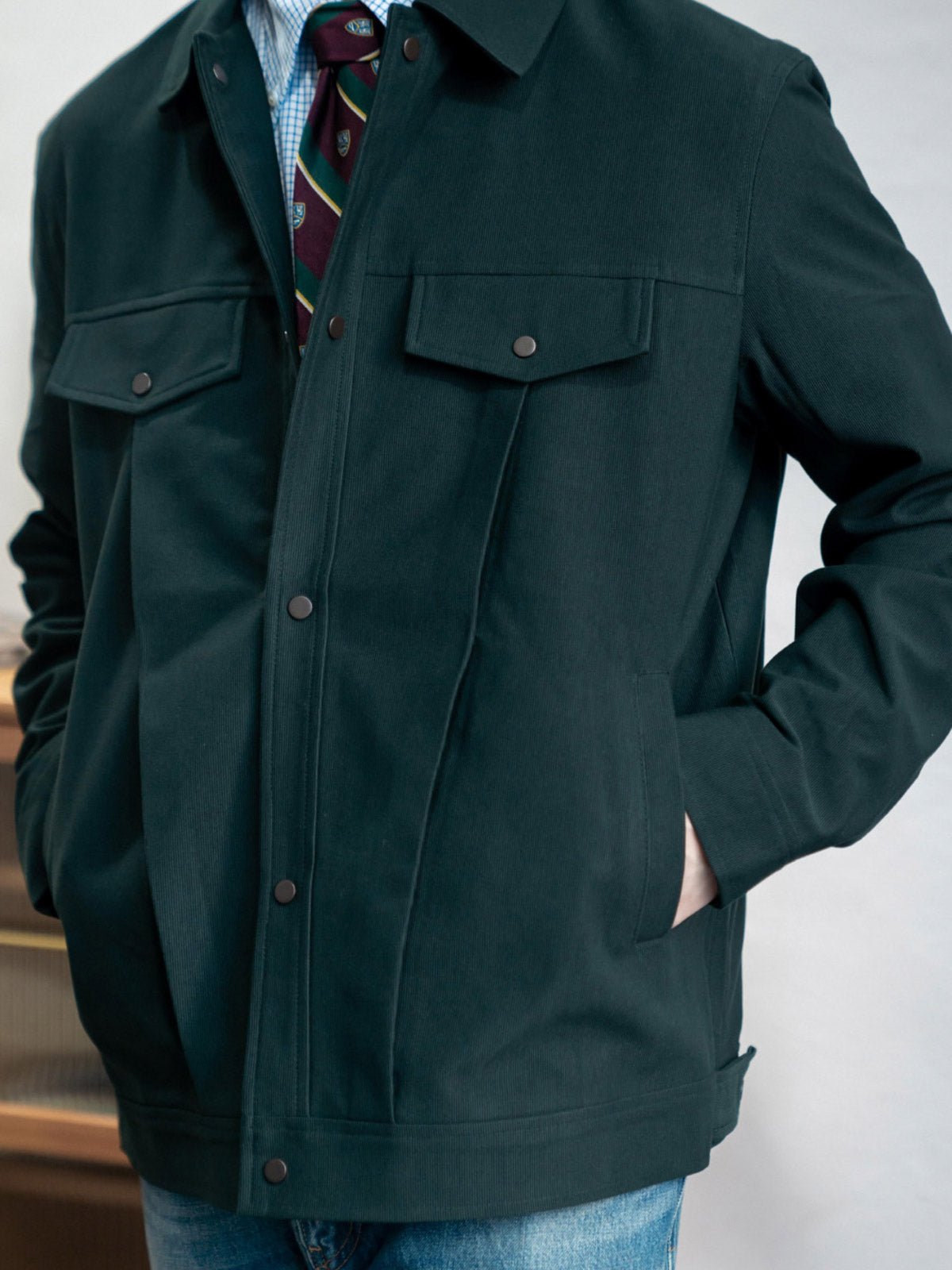 高密度のコットン素材を使用し、耐久性がありながら良好な保温性も提供します。胸元のダブルパッチポケットと裾の斜めポケットは、ジャケットの収納機能を強化するとともに、服の層の感じを増加させます。白いステッチと金属のボタンが濃い色の生地と鮮やかに対照をなし、ディテールの美しさを際立たせます。