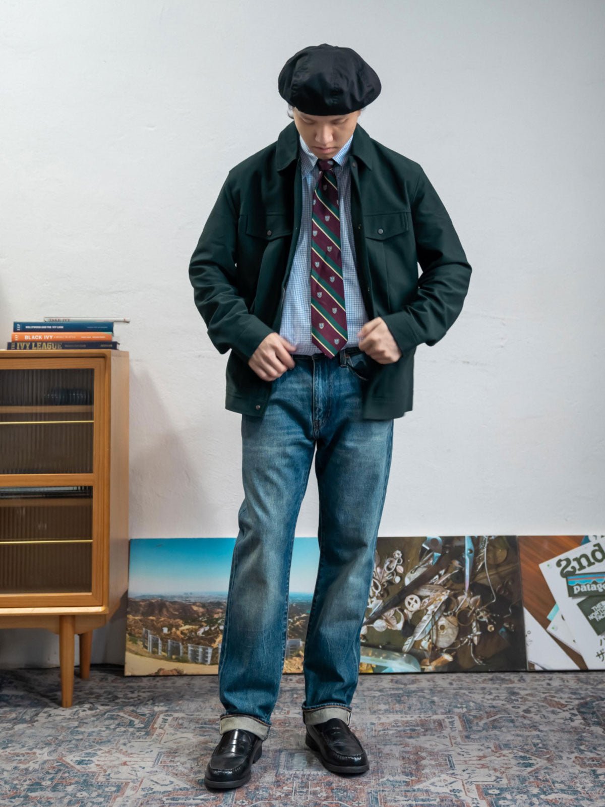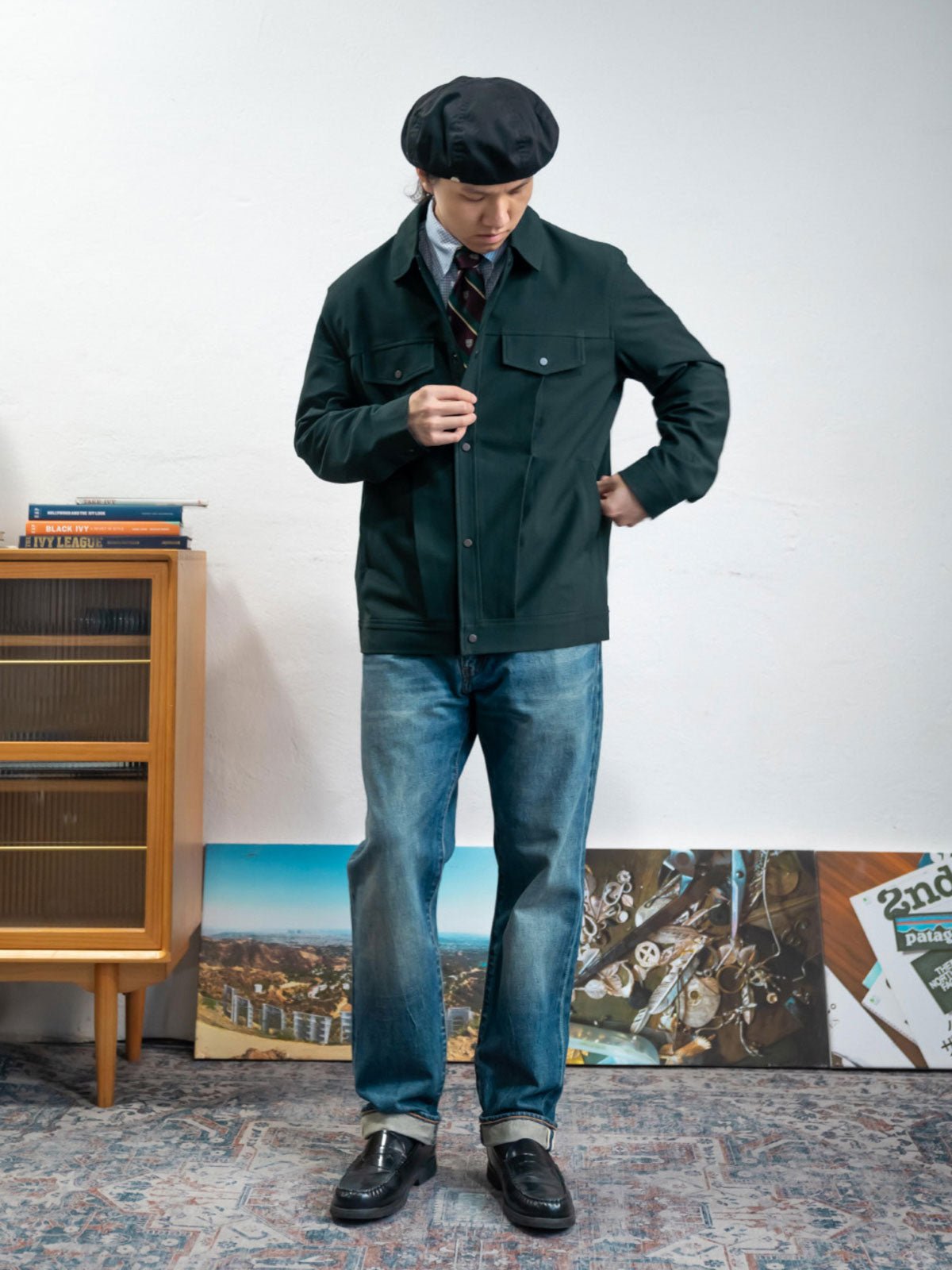 ストレートカットのデザインにより、さまざまな体型に対応し、重ね着にも適しています。翻り襟のデザインはレトロなワークスタイルを加え、全体のカッティングは現代的なフィット感を保証します。