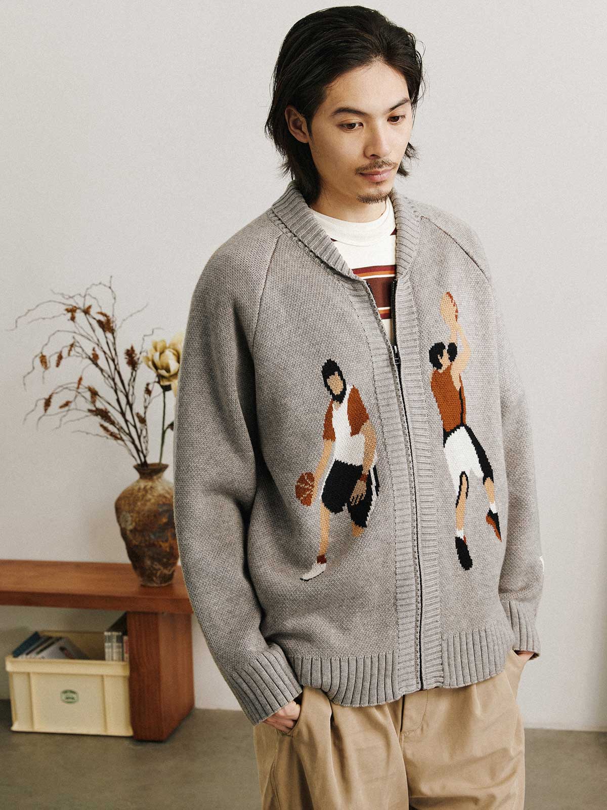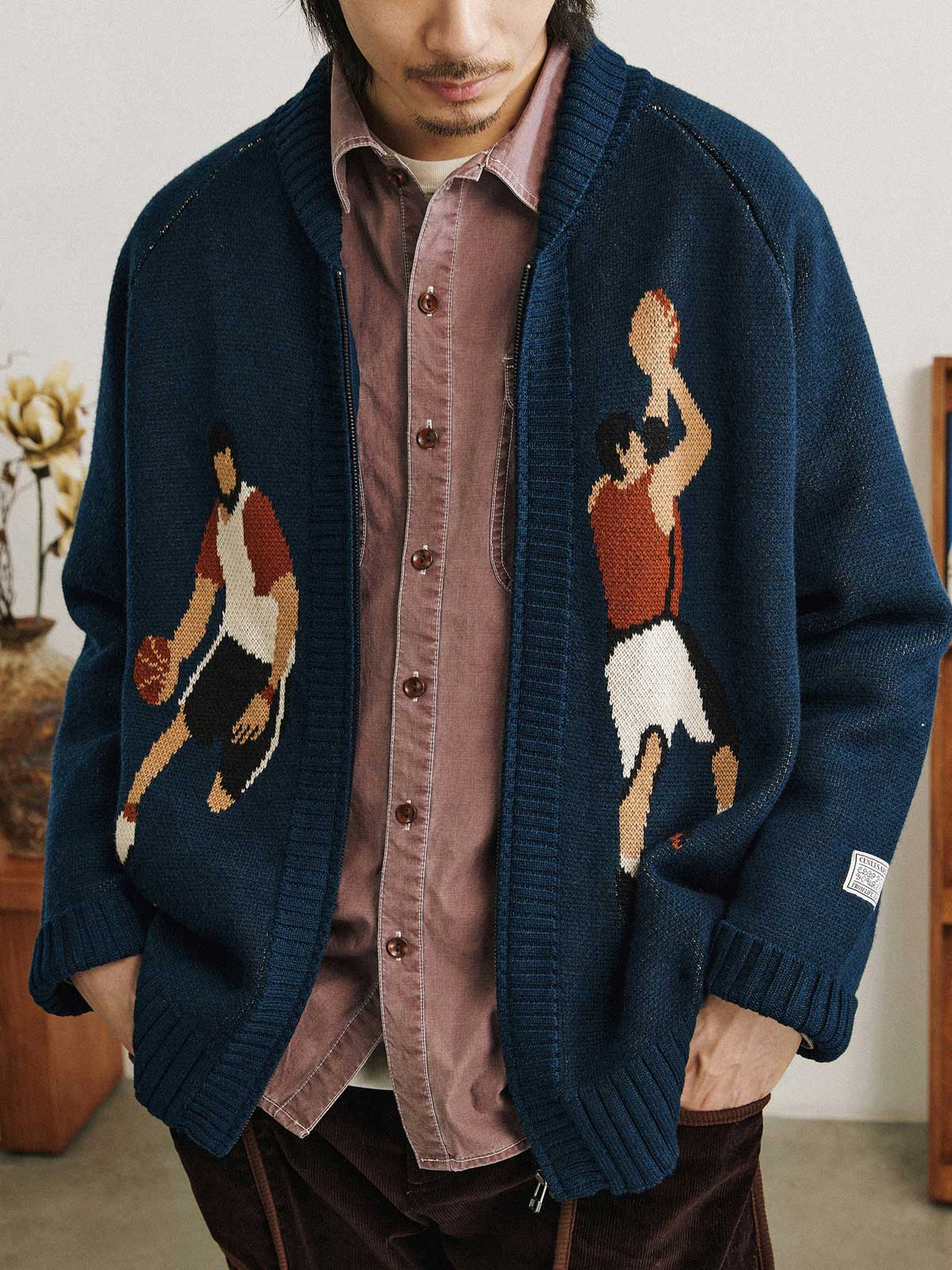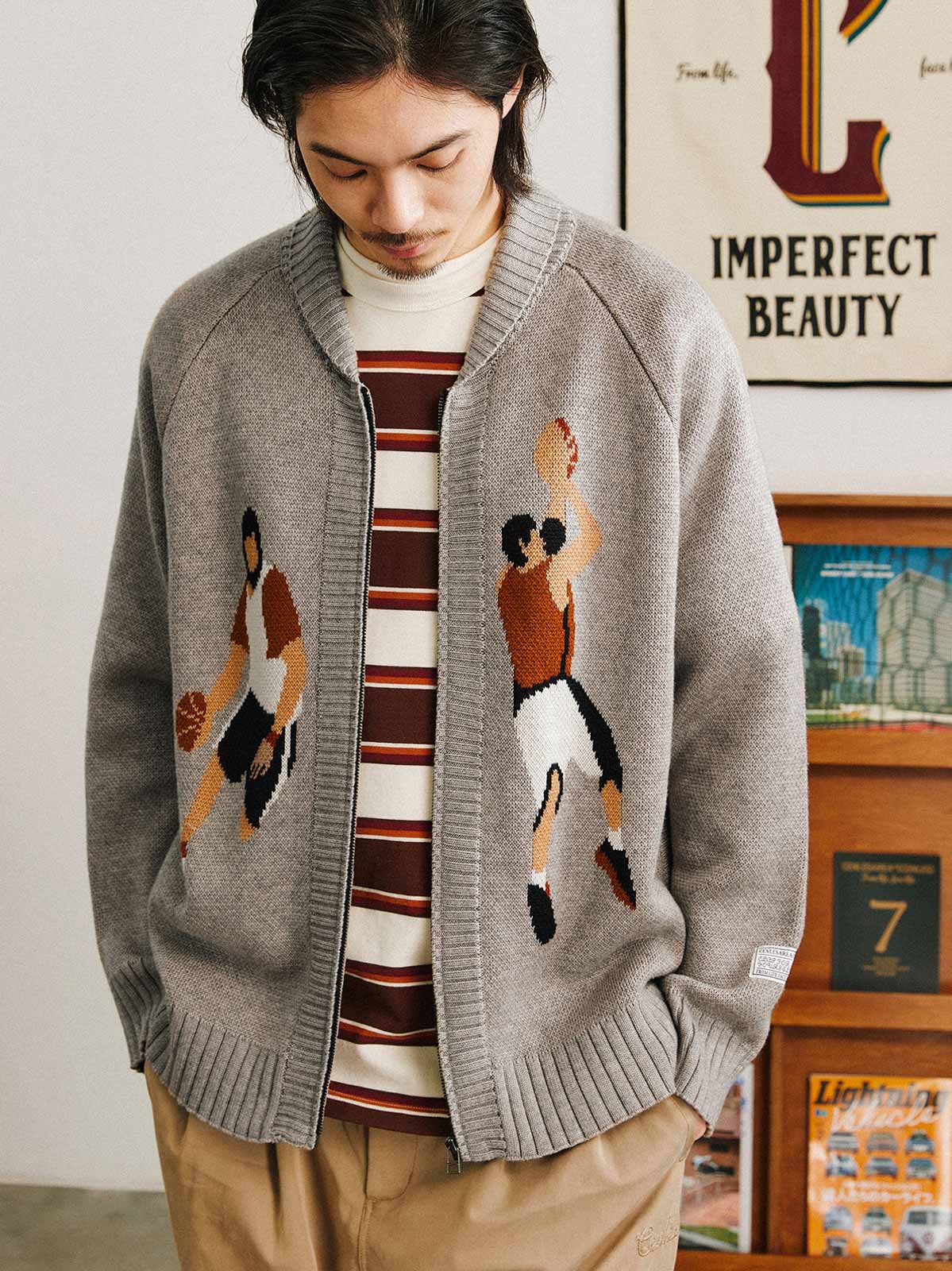 このセーターは、レトロなコーウィッチンスタイルと現代のバスケットボール要素を融合させ、独特のファッション体験を提供する。